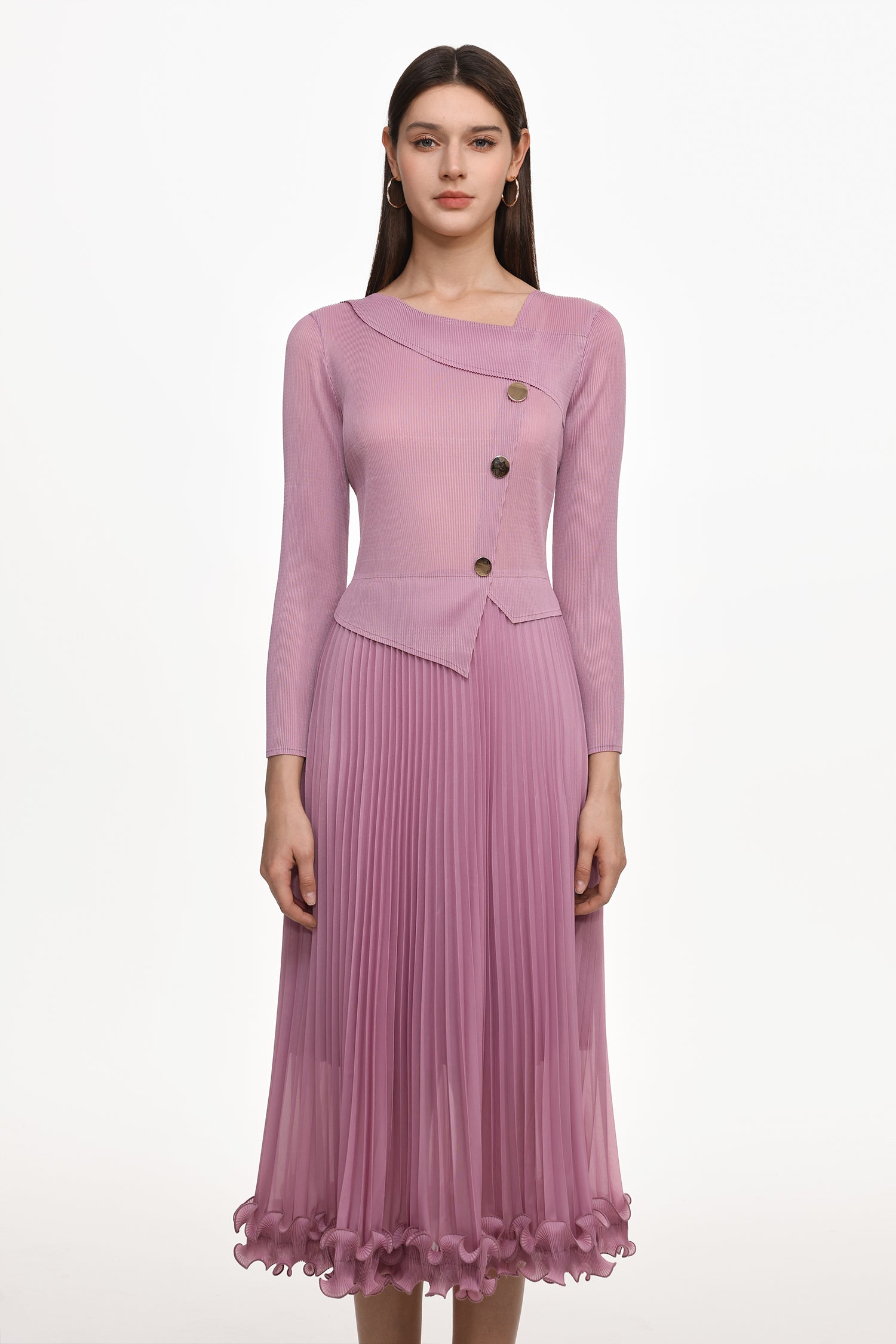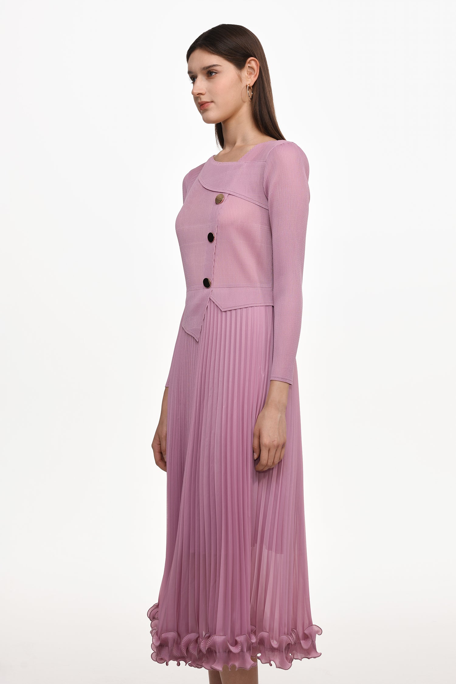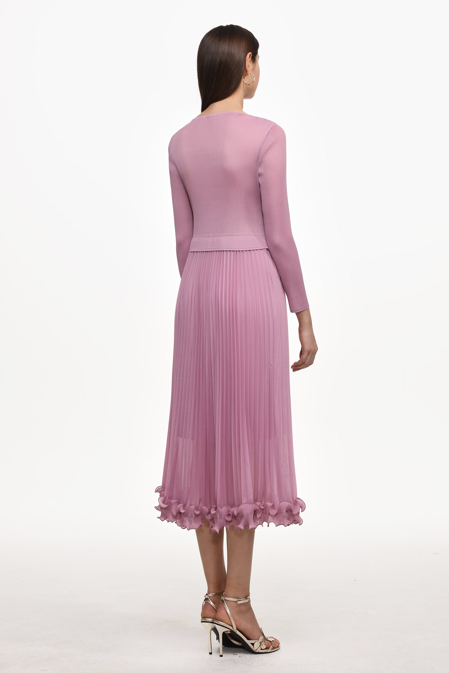 Lalie Resort Flowy Long Sleeve Ruffle Pleated Knit Maxi Dress