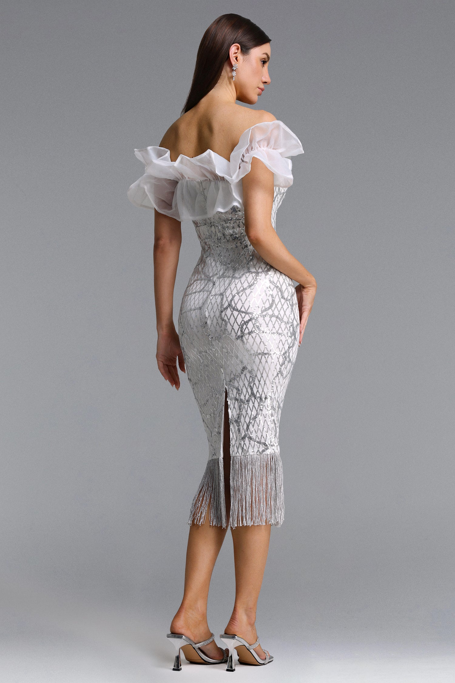 Loyisa Chic Contour Off Shoulder Sequin Fringe Midi Dress