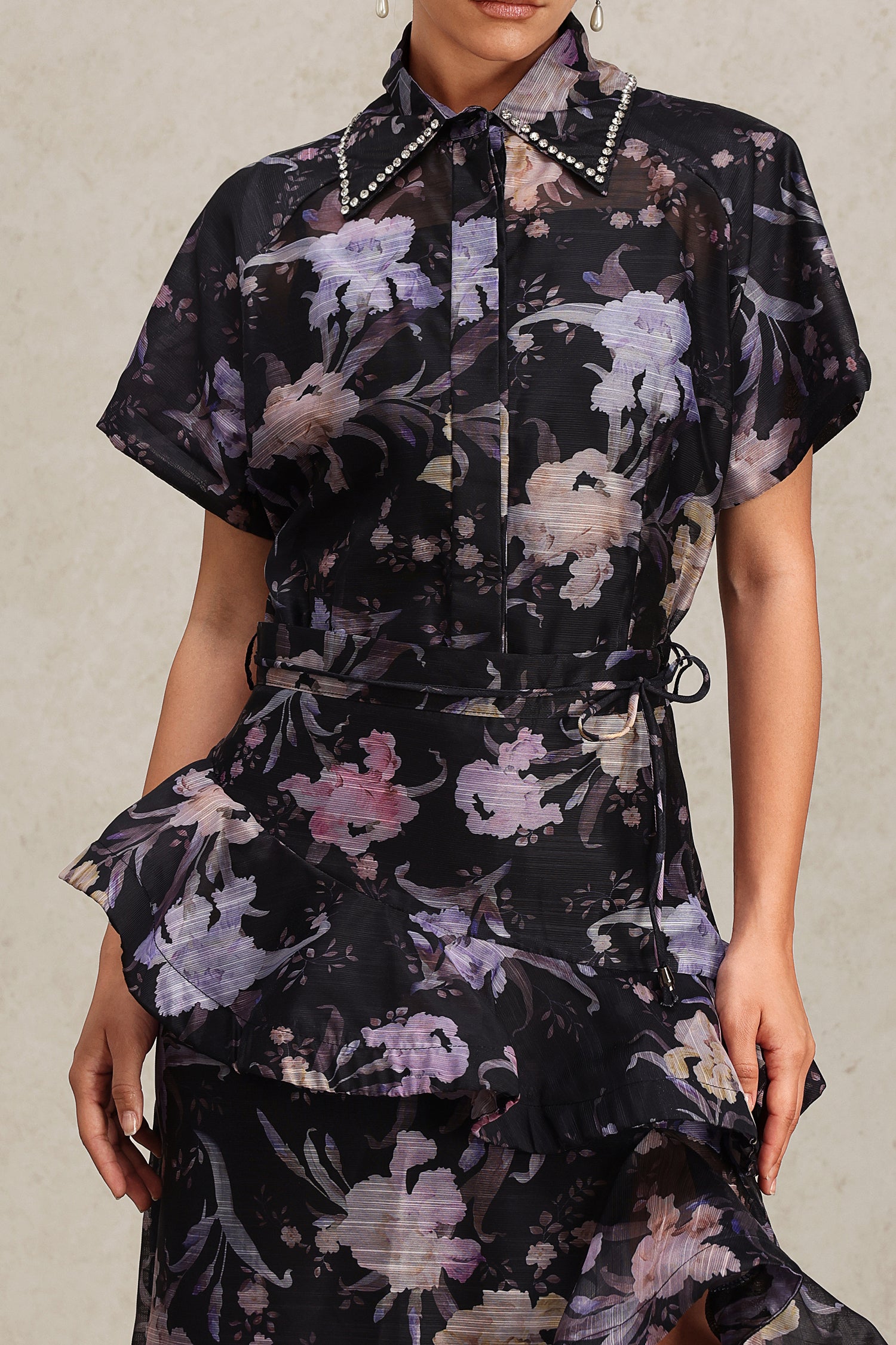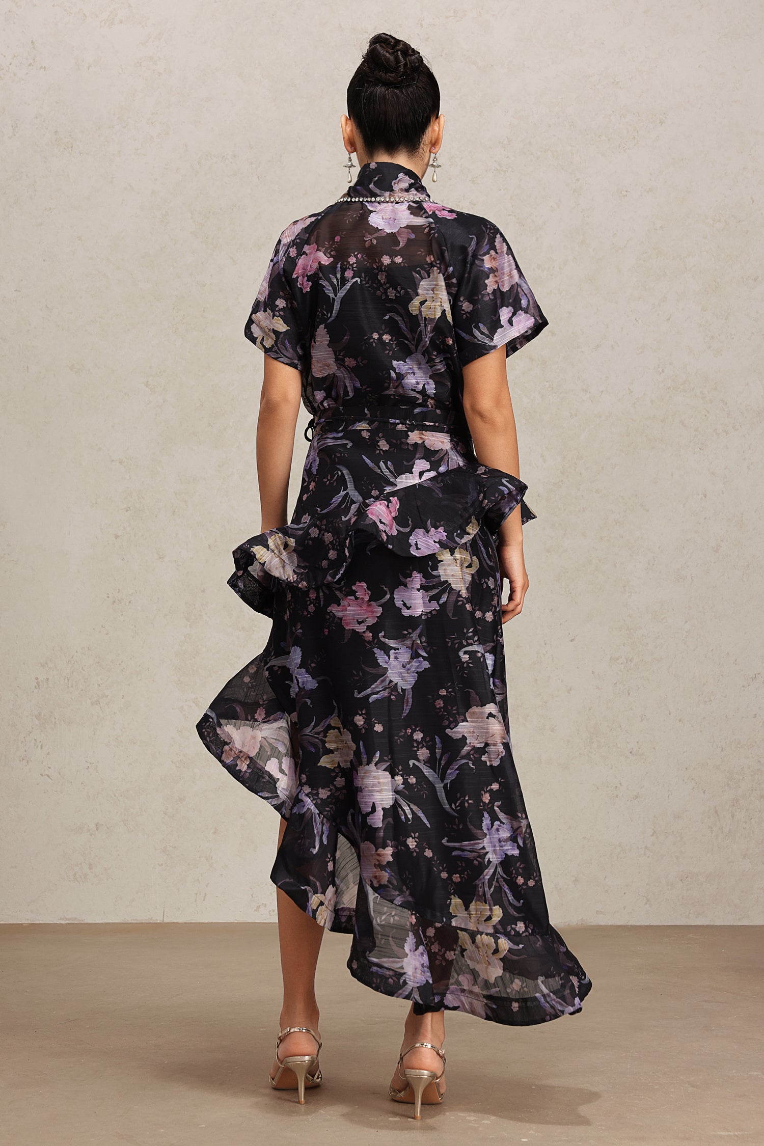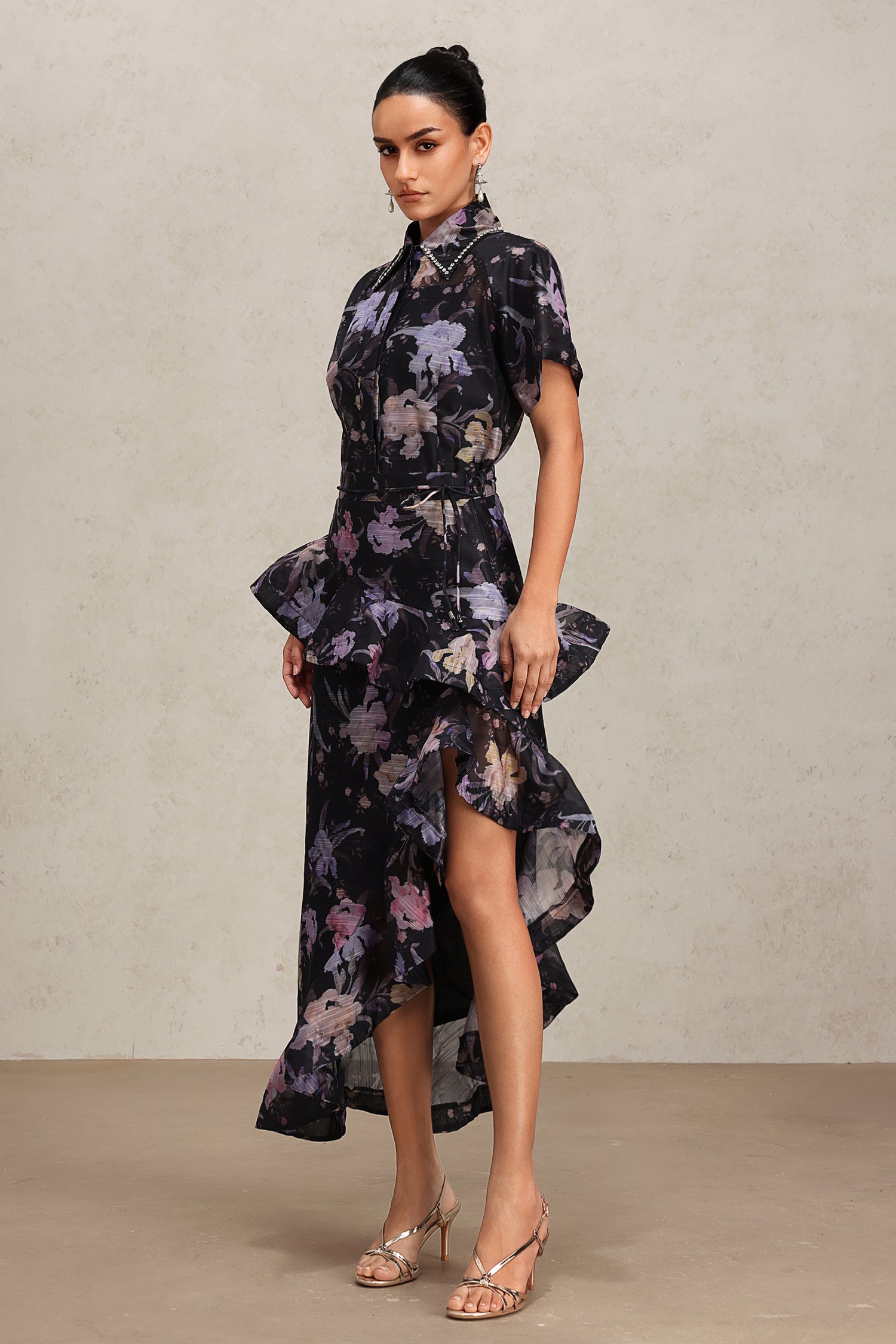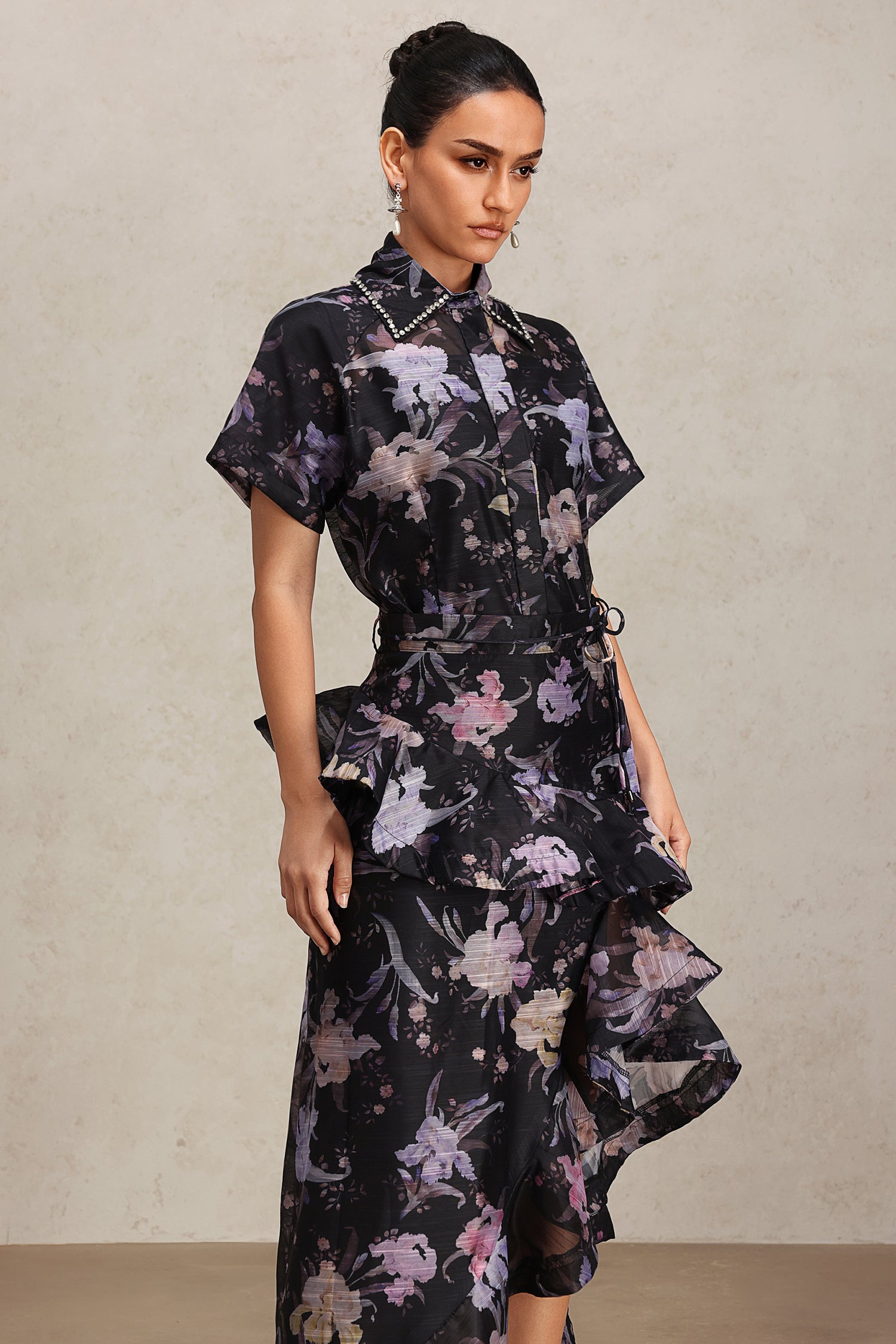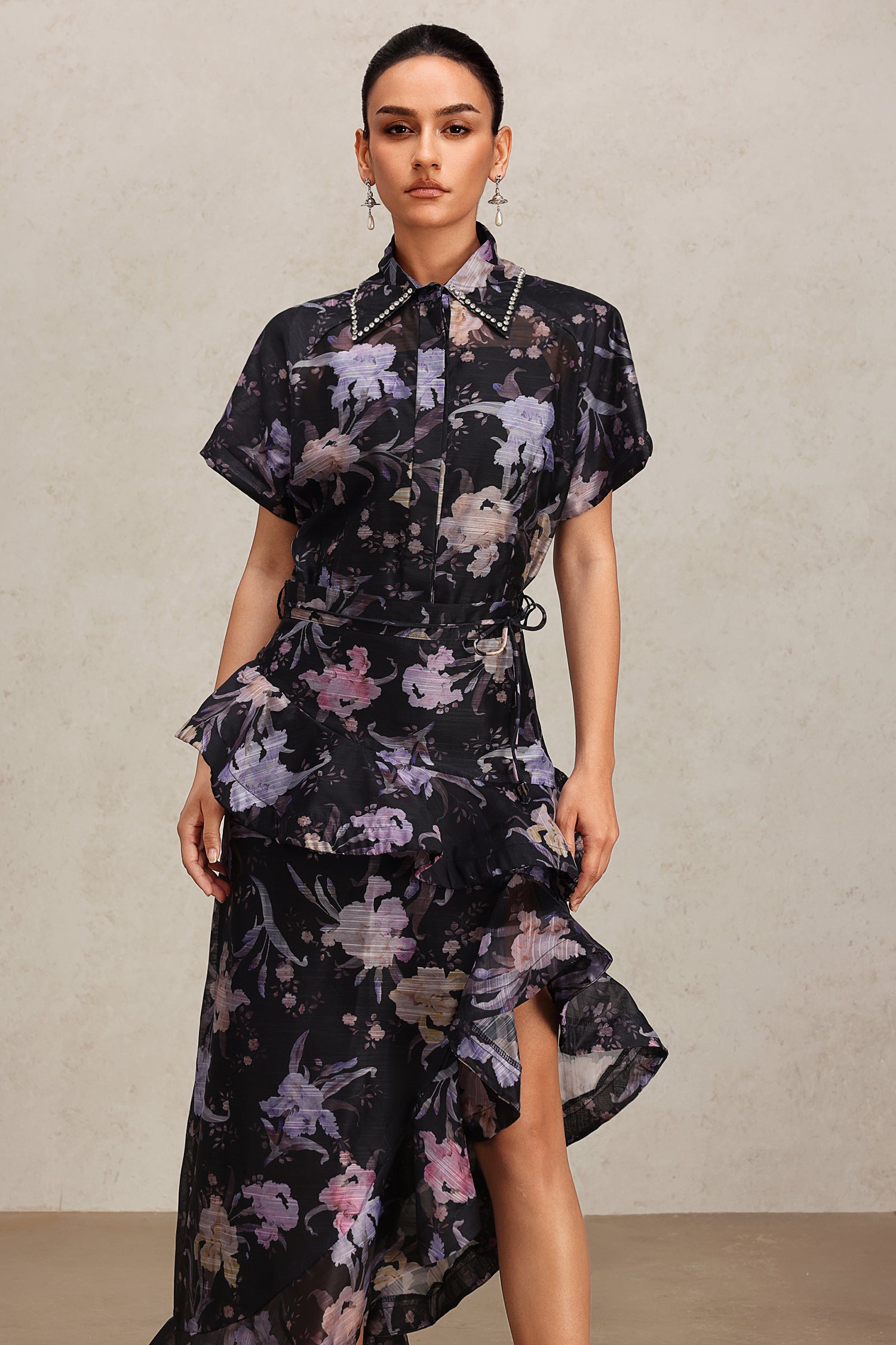 Jikia Lapel Floral Printed Asymmetric Skirt Two-Piece Set