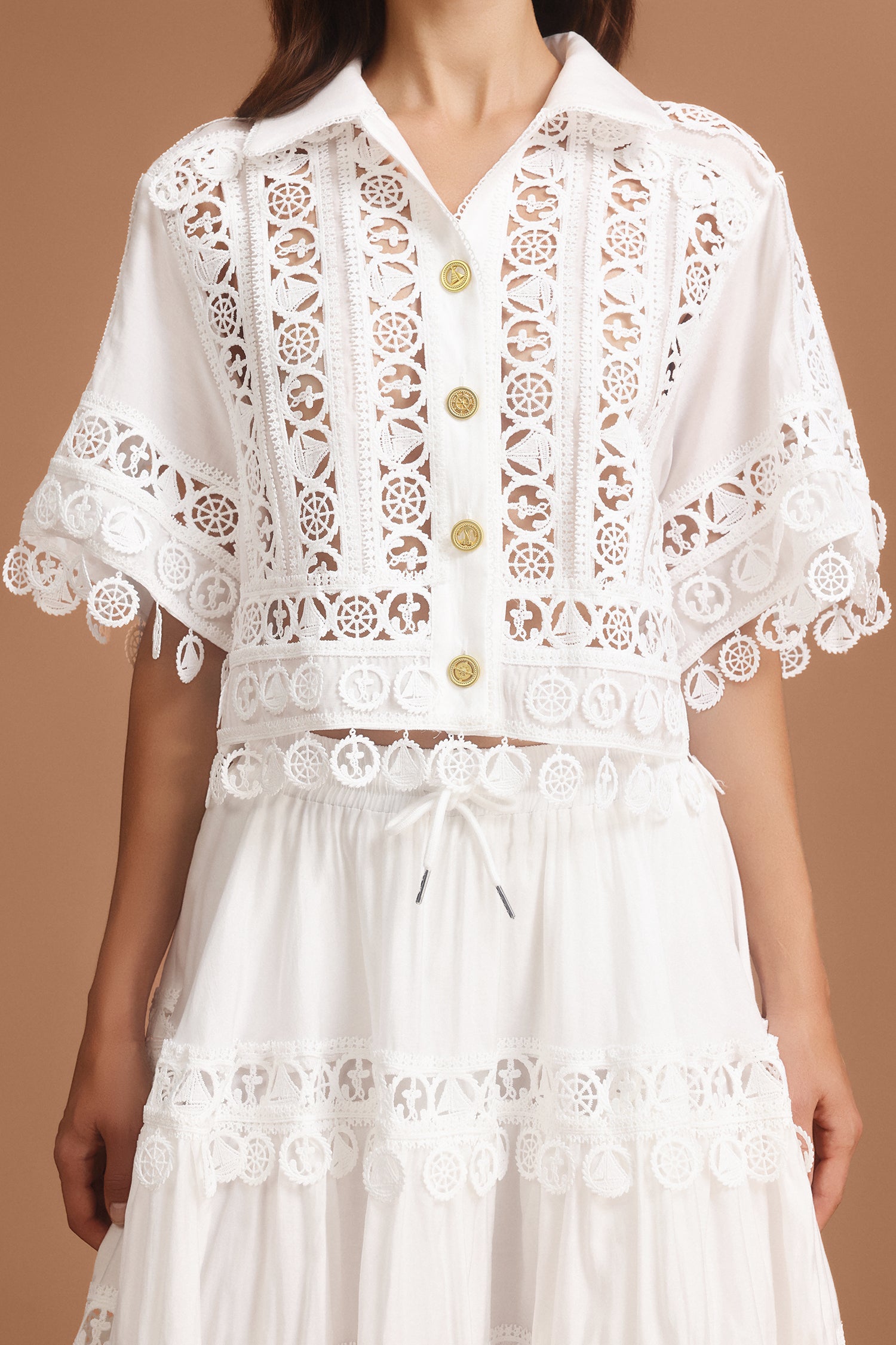 Olapa Lapel Embroidery Lace Top And Skirt Two-Piece Set