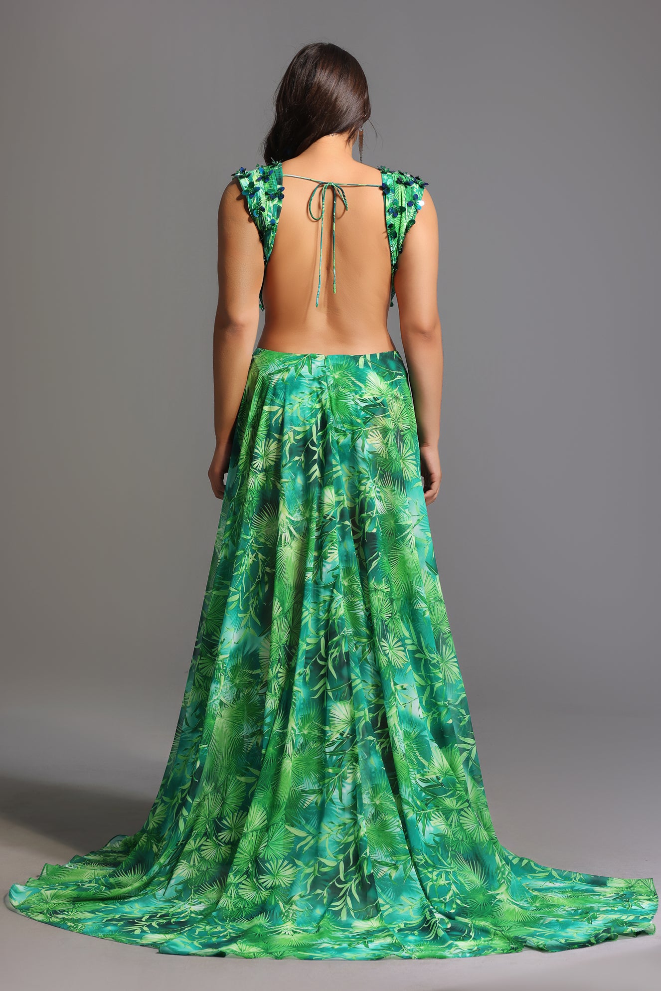 Step into a world of enchantment with the Yoland Printed Embellished Maxi Dress. The exquisite embellishments and delicate patterns add an element of allure, making this dress a perfect choice for special occasions and formal events.The maxi length of the dress exudes a sense of sophistication and glamour, allowing you to make a grand entrance, while the backless design of the dress adds a dose of sensuality and allure. Opt for minimalistic jewelry, strappy heels, and a clutch to create a cohesive and refined look that lets the dress shine.
