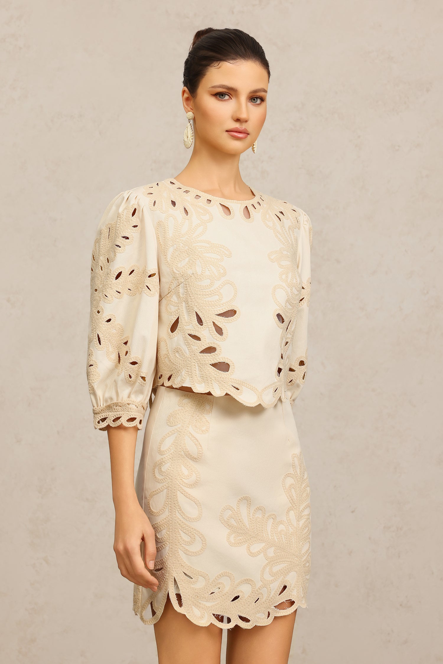 Fawn Round Neck Elbow Sleeves Embroidery Top And Skirt Two-Piece Set