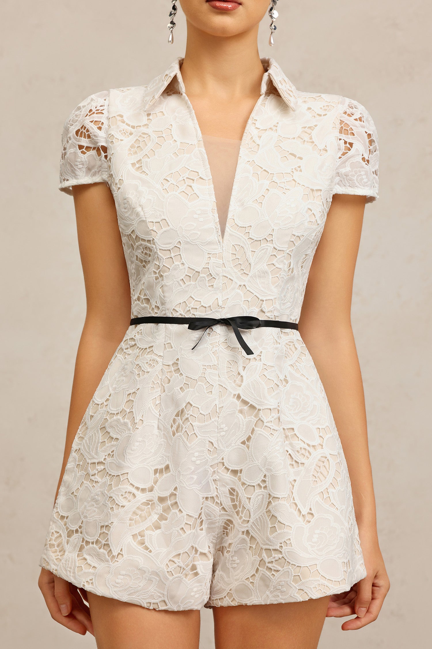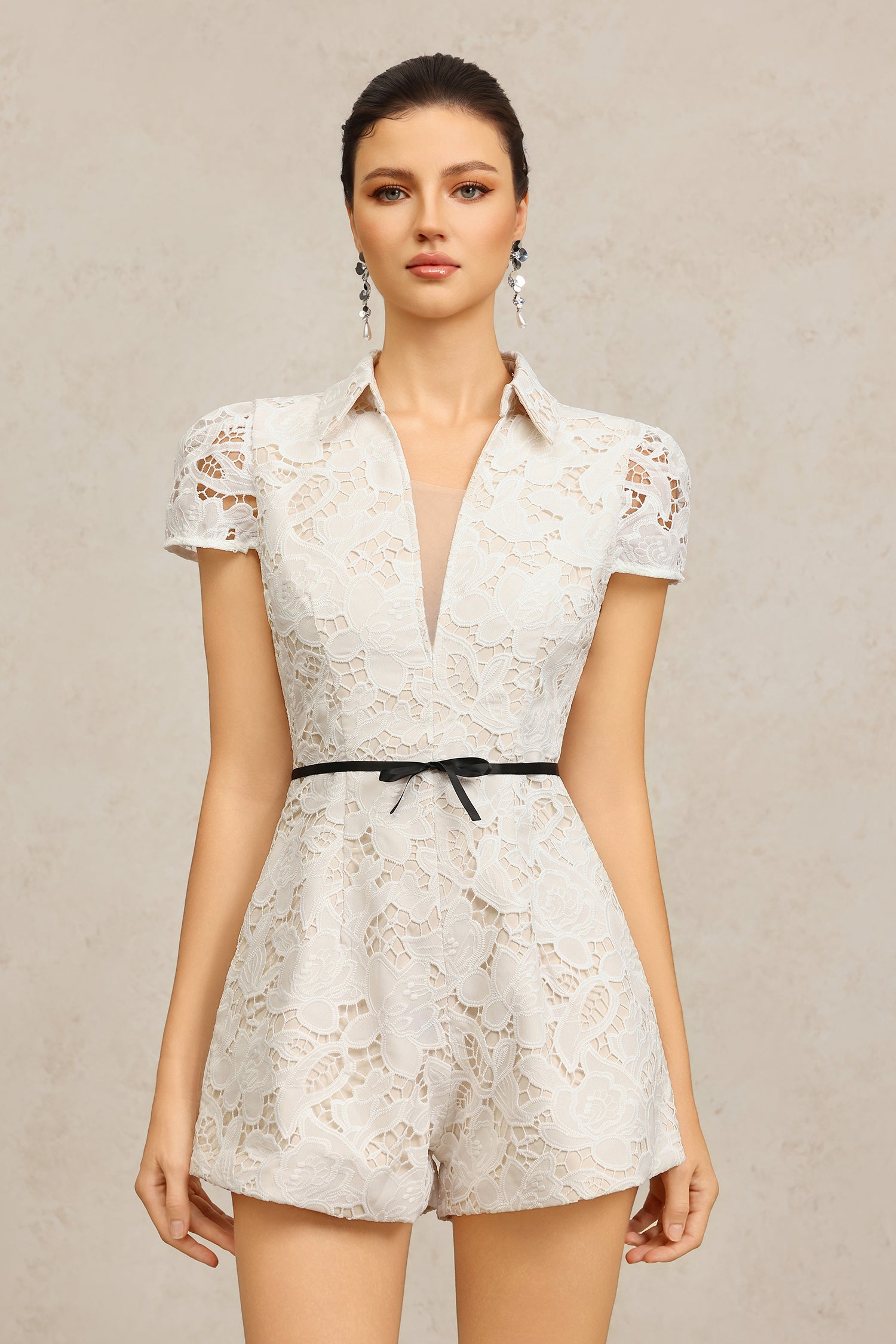 Paza V-Neck Short Sleeves Lace Flowers Bowknot Mini Jumpsuit