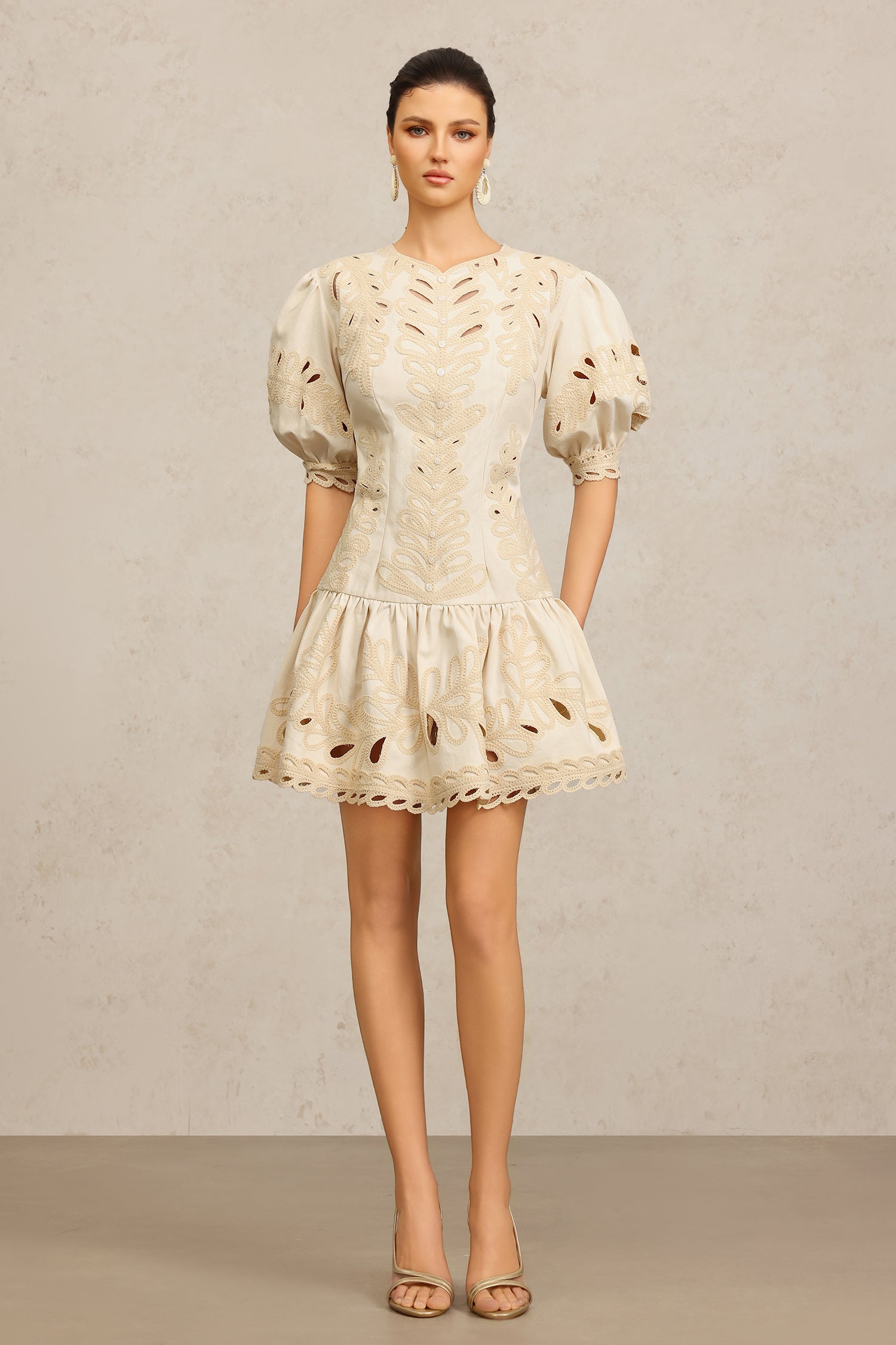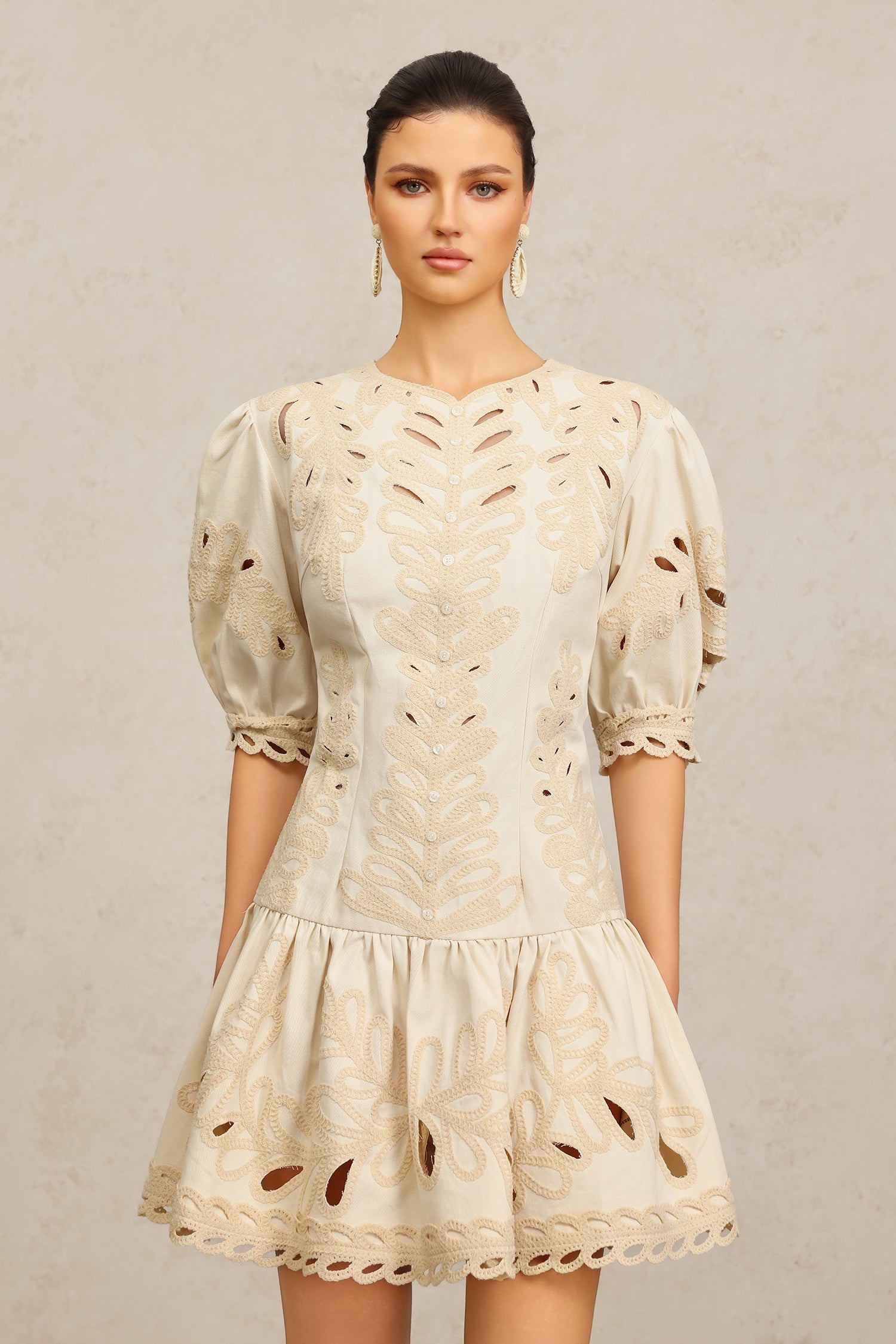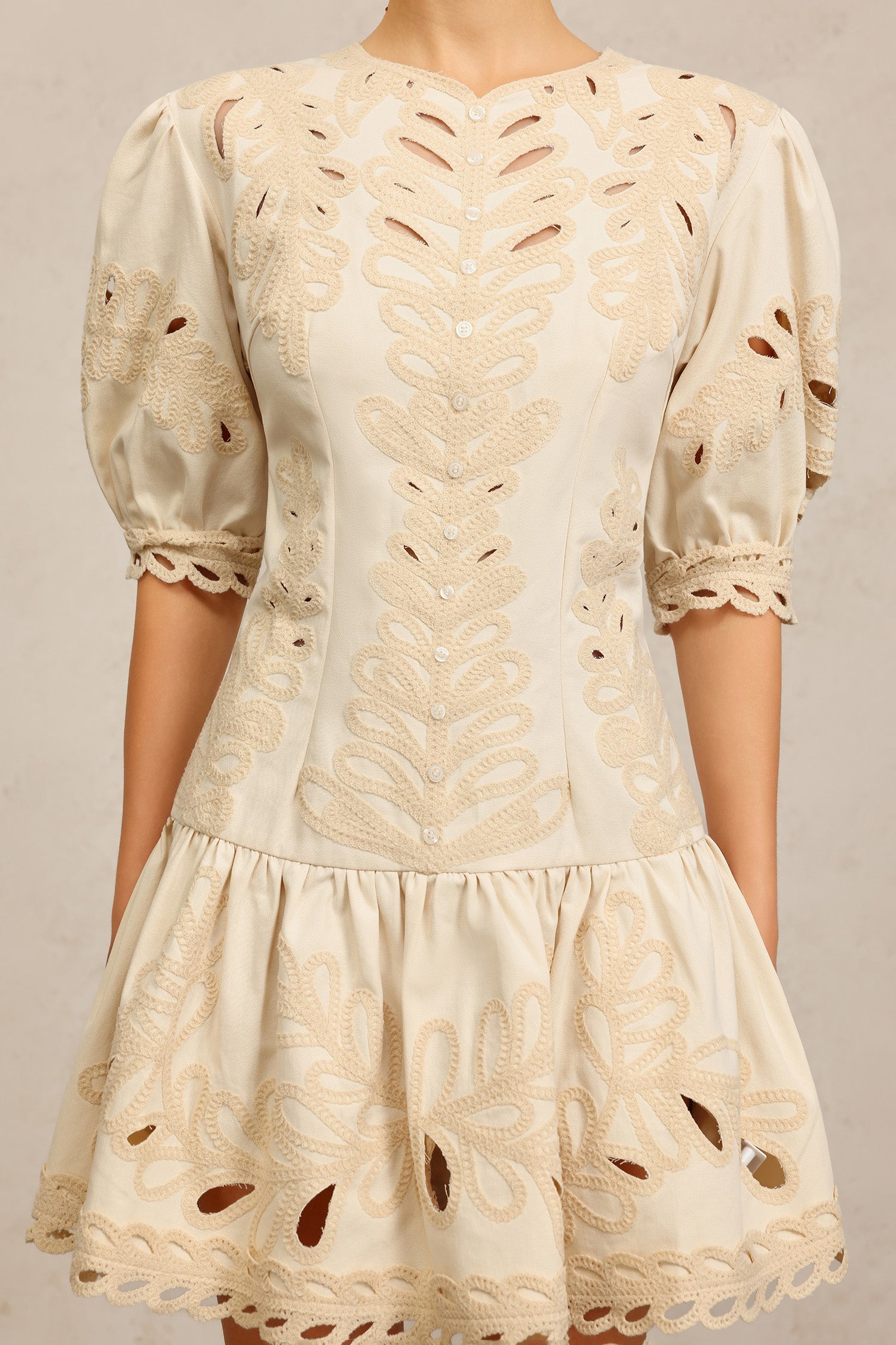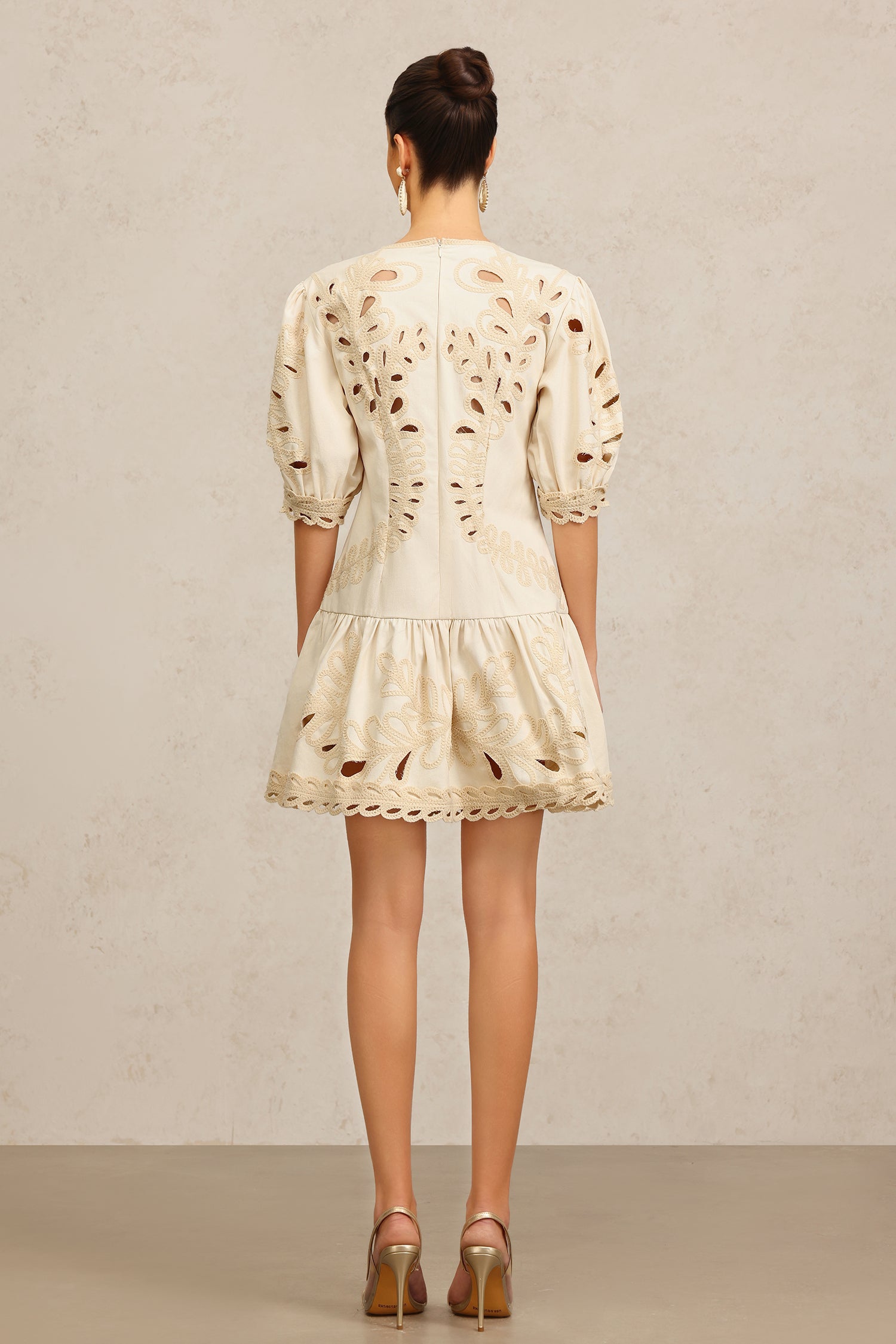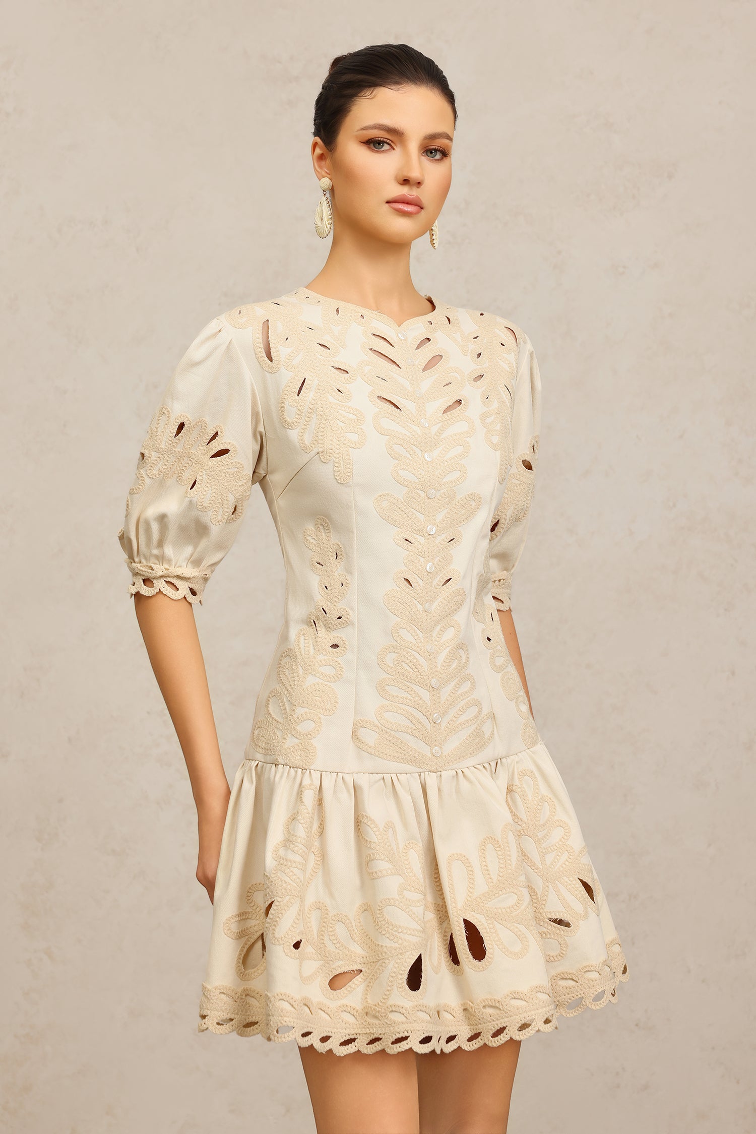 Salita Round Neck Elbow Sleeves Embroidery Mini Dress