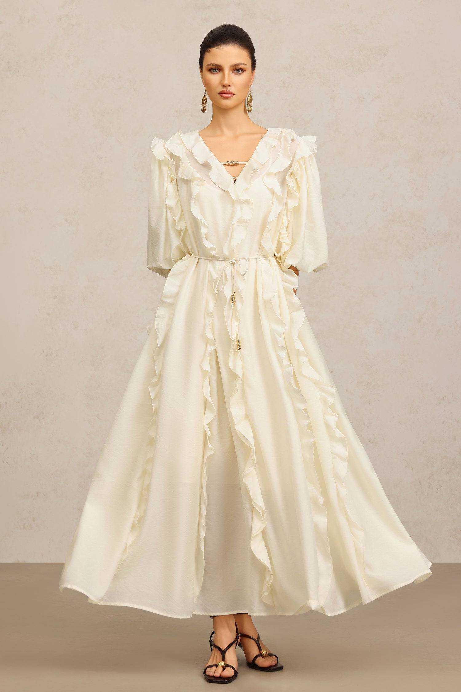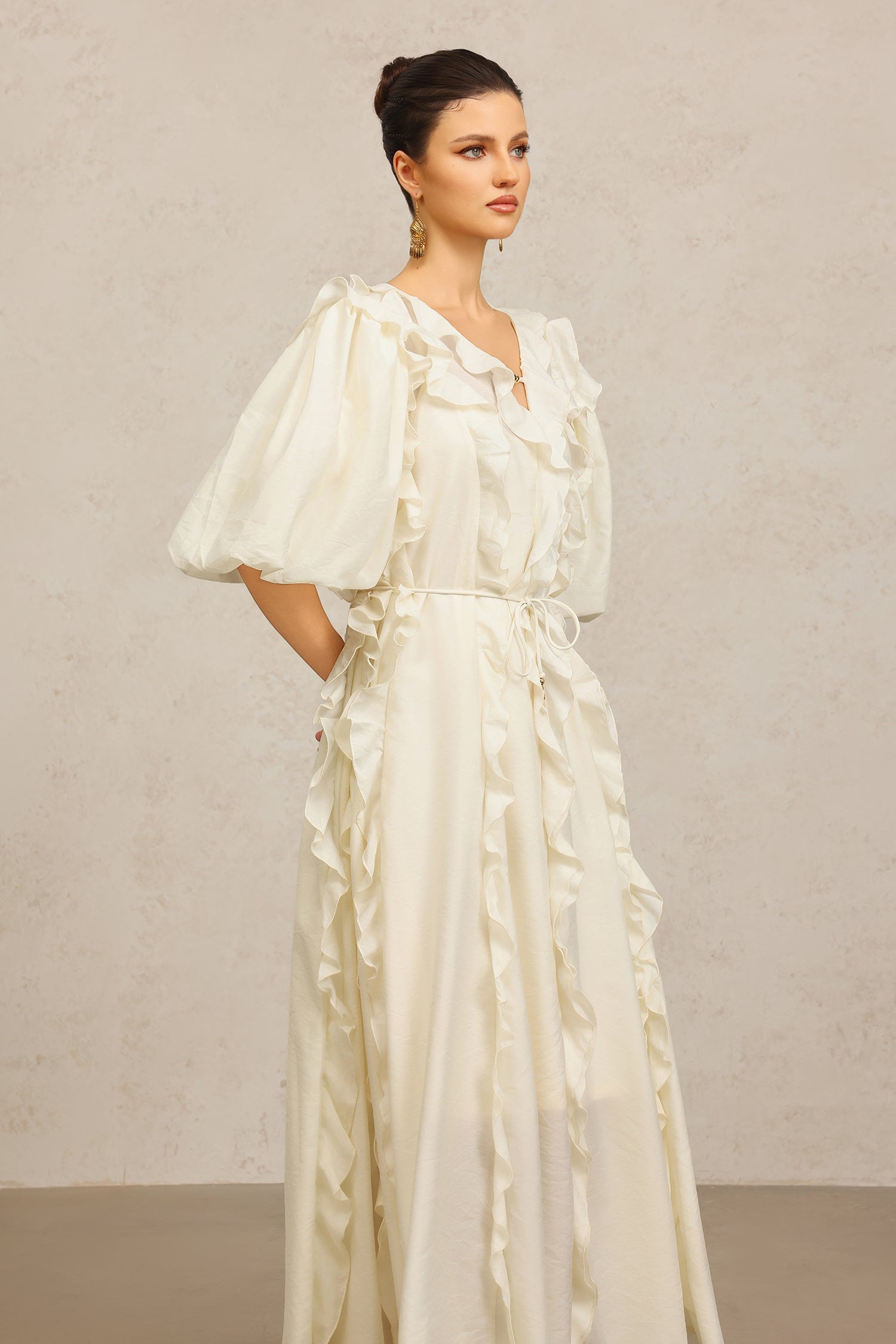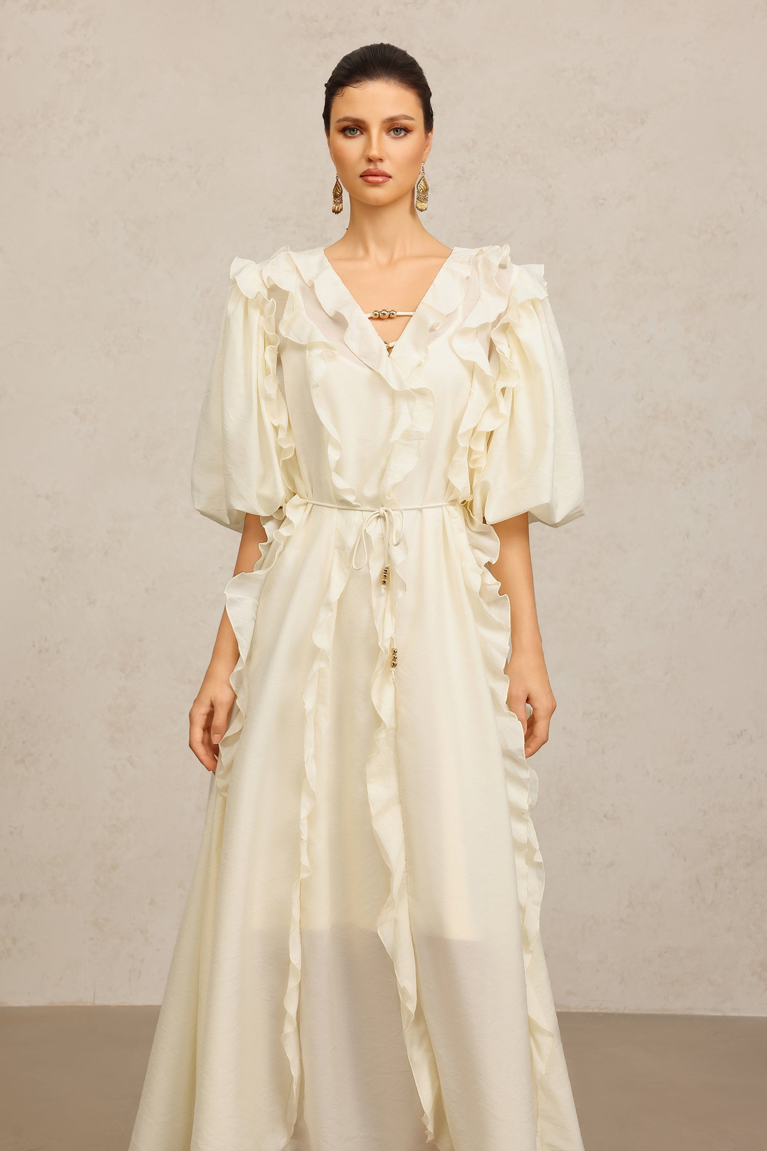 Wika V-Neck Elbow Sleeves Folds Beige Maxi Dress