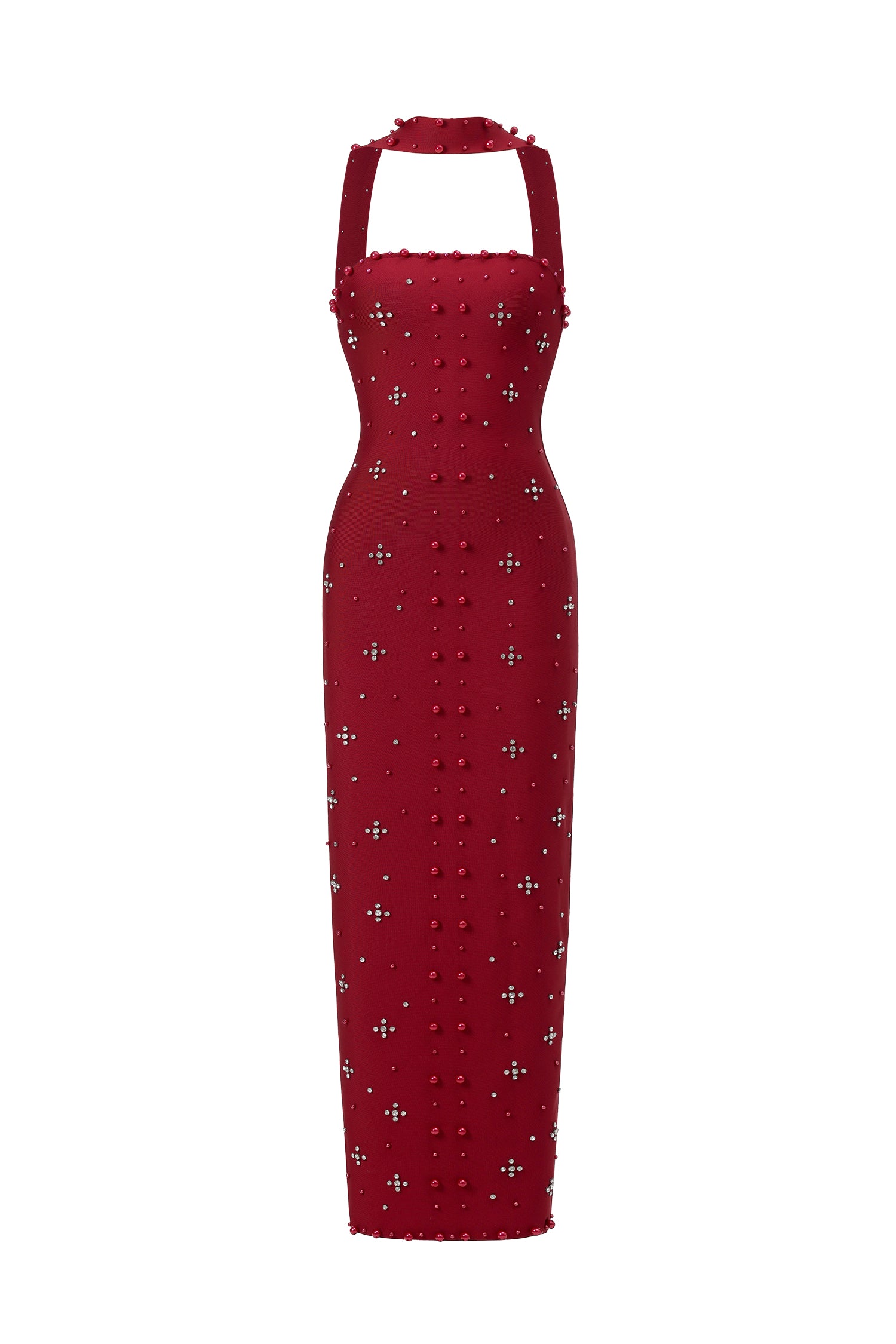 Nesya Sleeveless Pearl Wine Bandage Maxi Dress