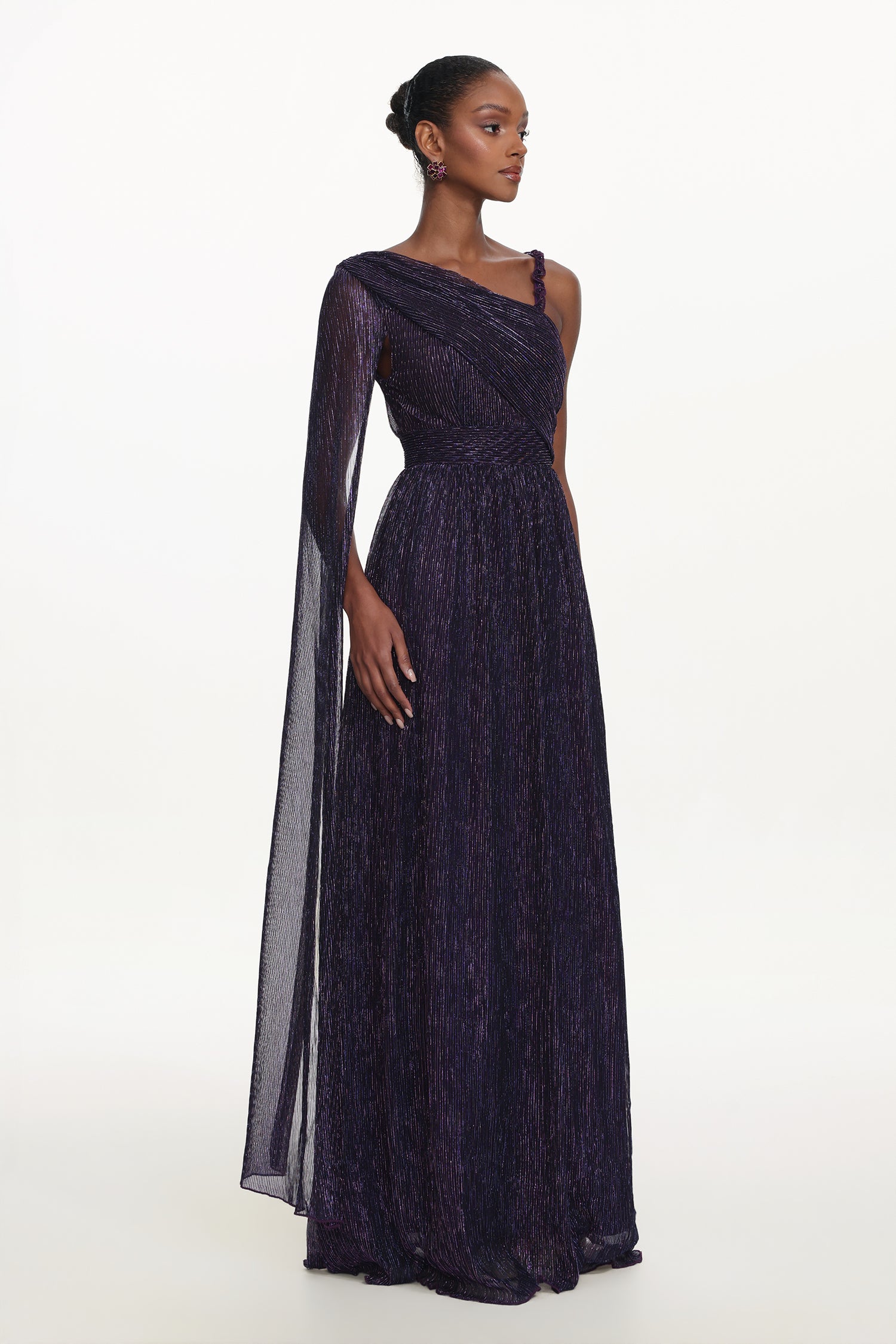 Rimo Elegant Flowy One Shoulder Ruched Metallic Voile Maxi Dress