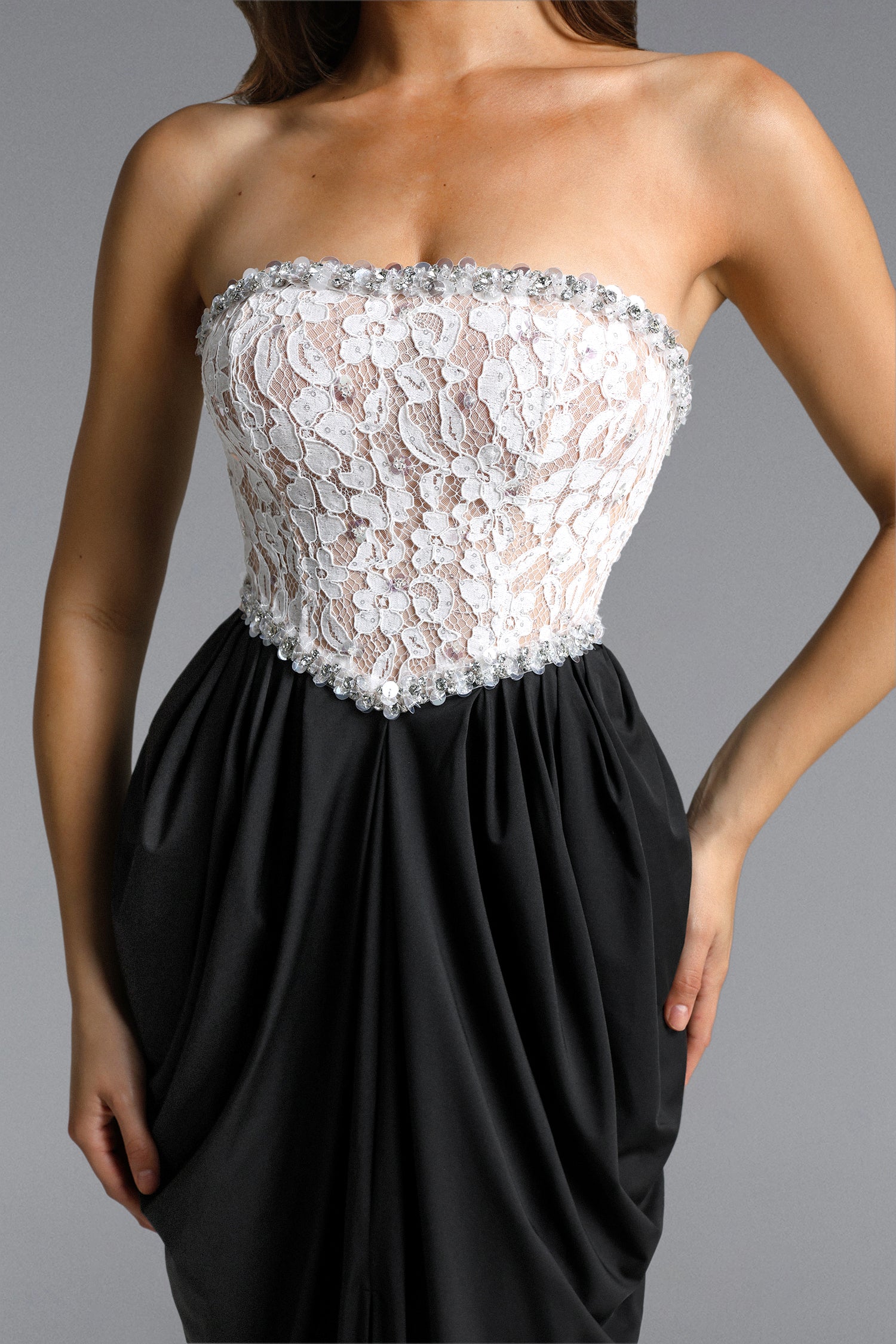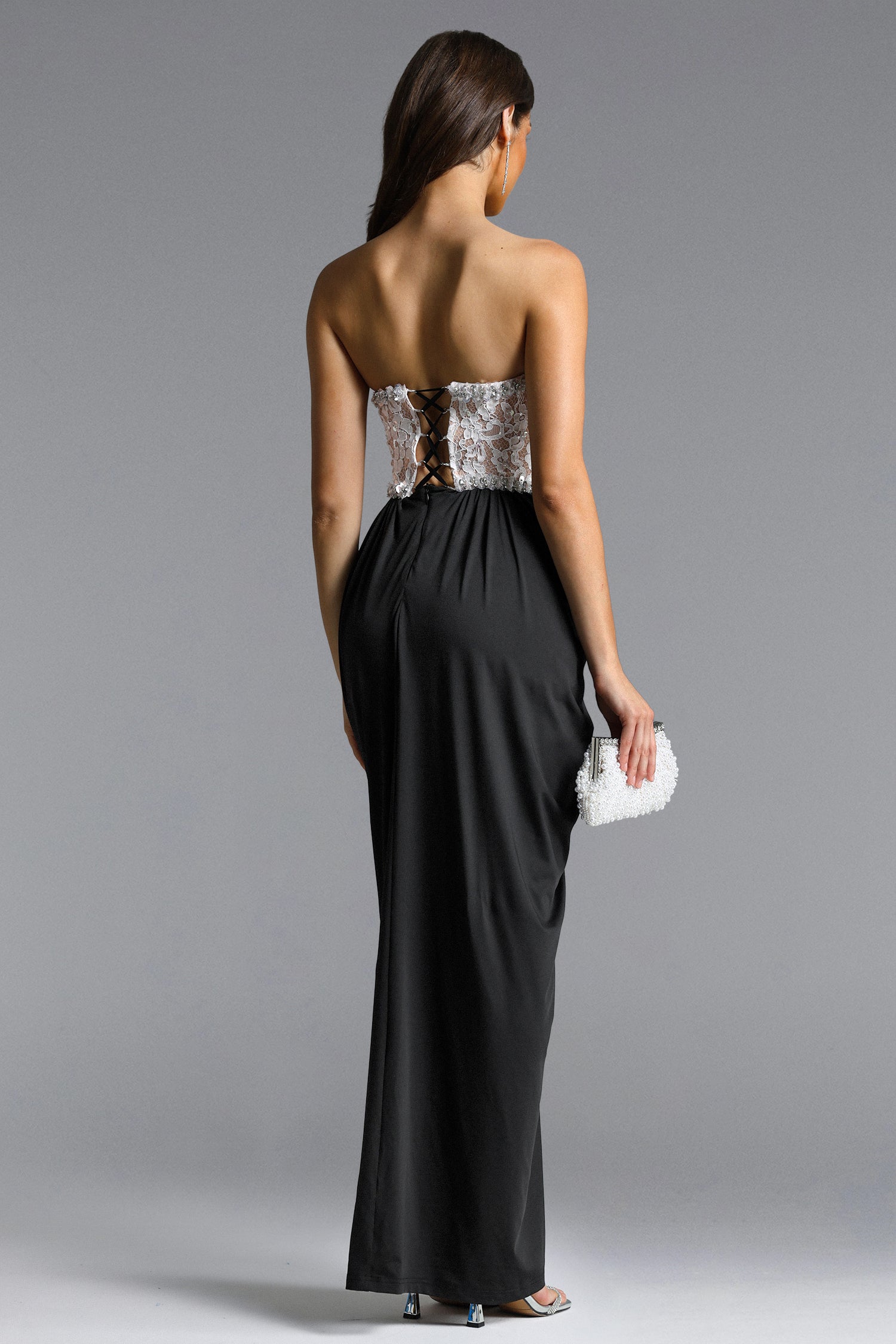 Minnie Elegant Contour Strapless Rhinestone Lace Maxi Dress