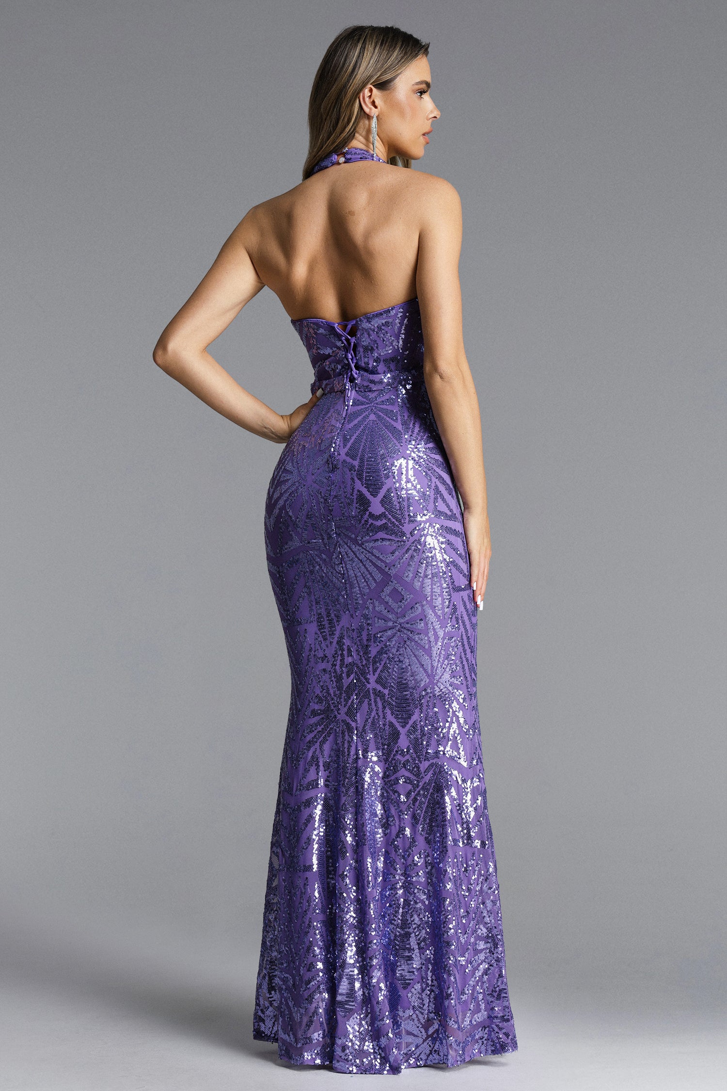 Rode Chic Contour Halter Deep V Sequin Pattern Maxi Dress