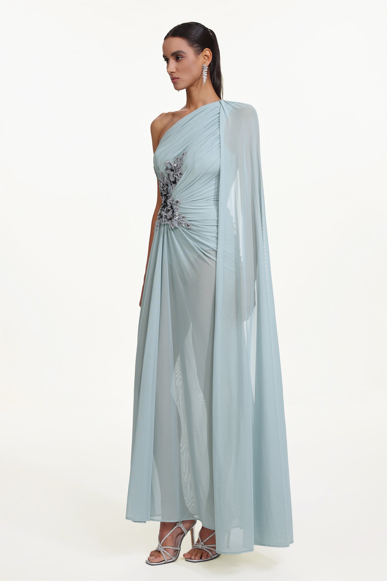 Kaylee Elegant Flowy One Shoulder Sequin Embroidered Ruched Mesh Maxi Dress