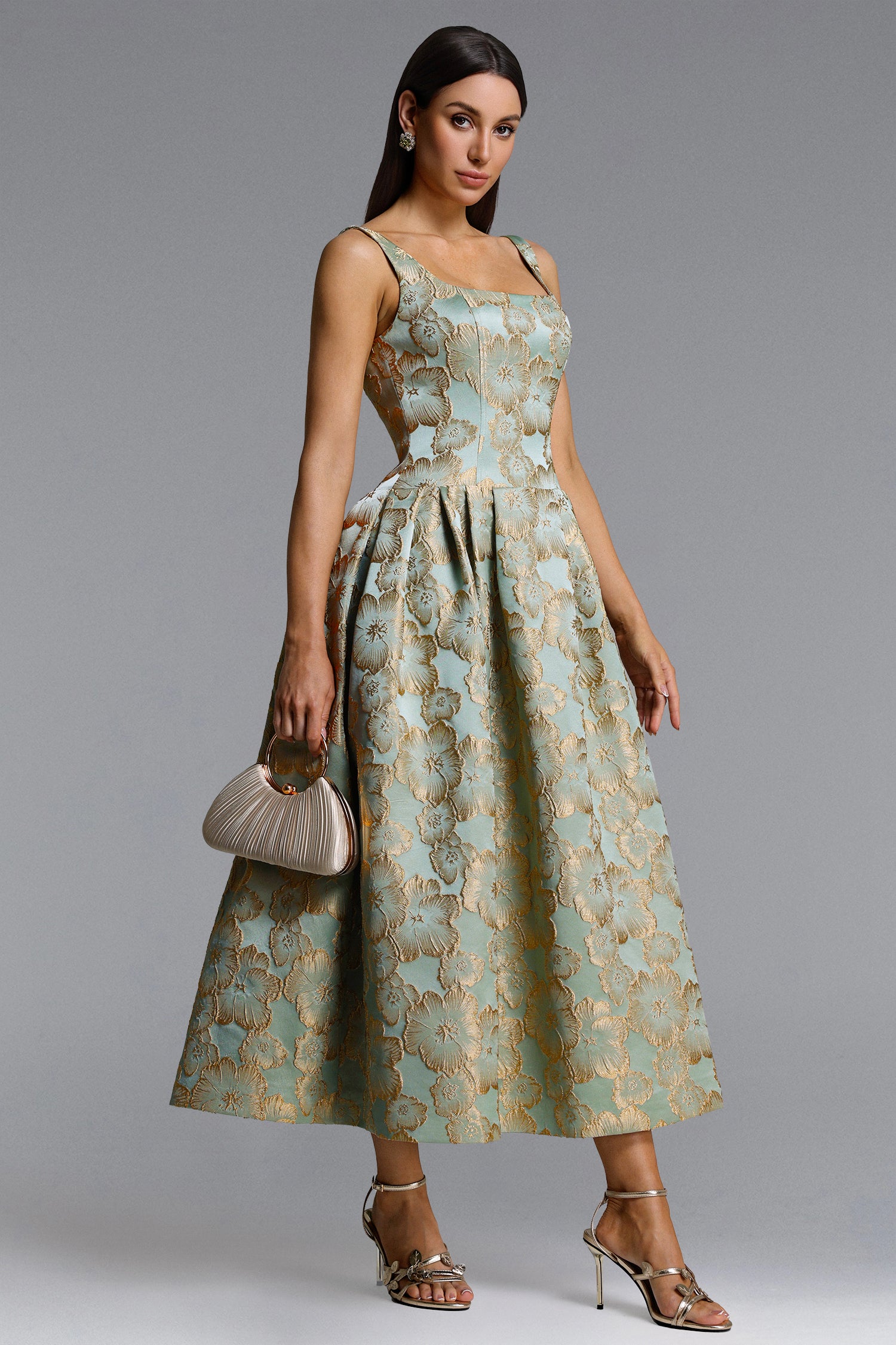 Kerta Elegant Tailored Square Neck Jacquard Pleated Floral Maxi Dress