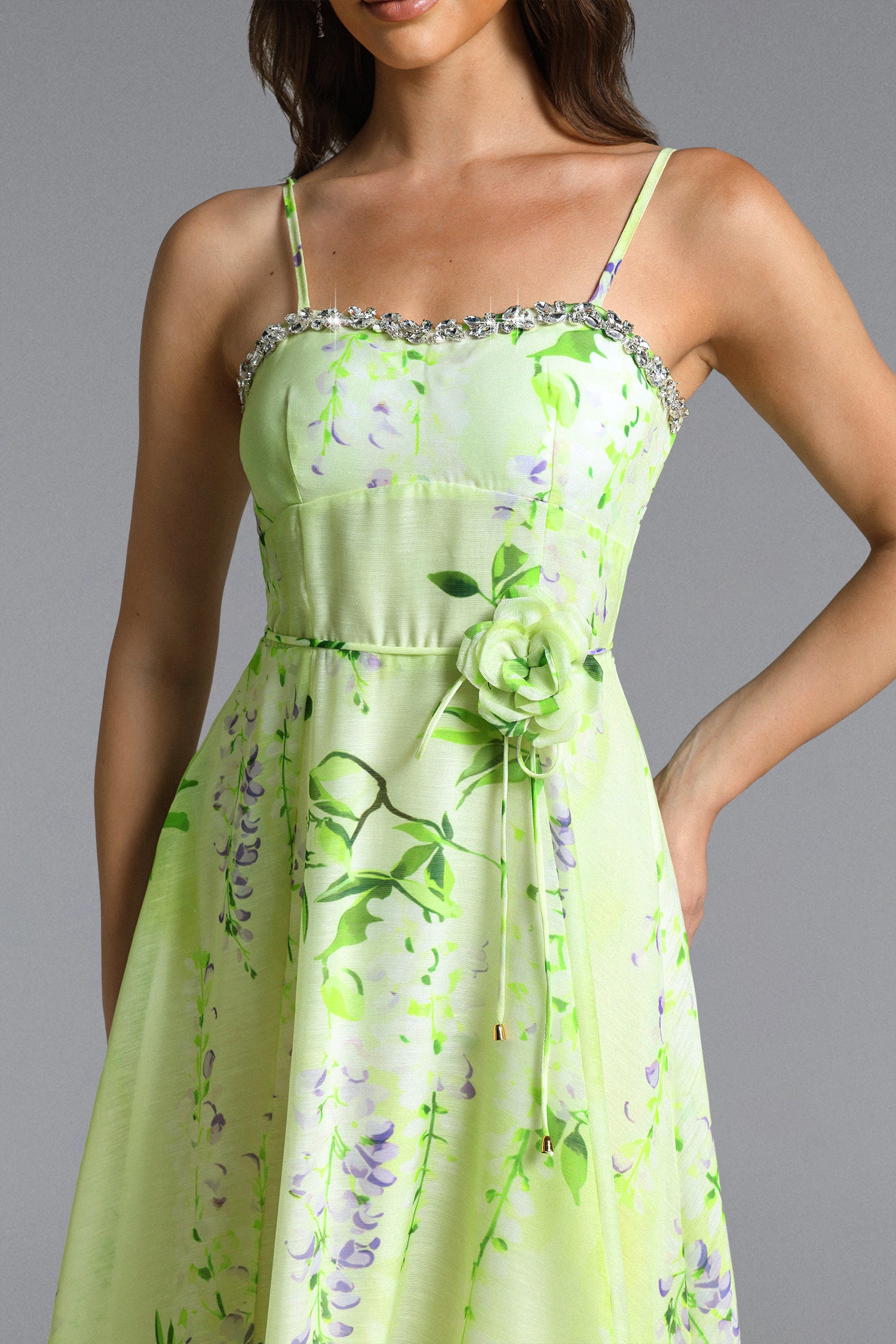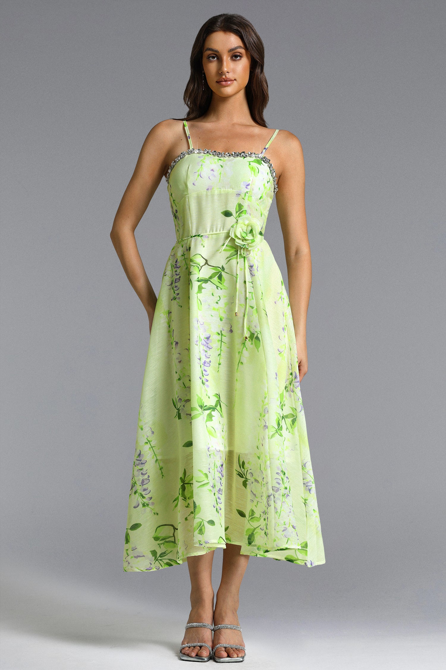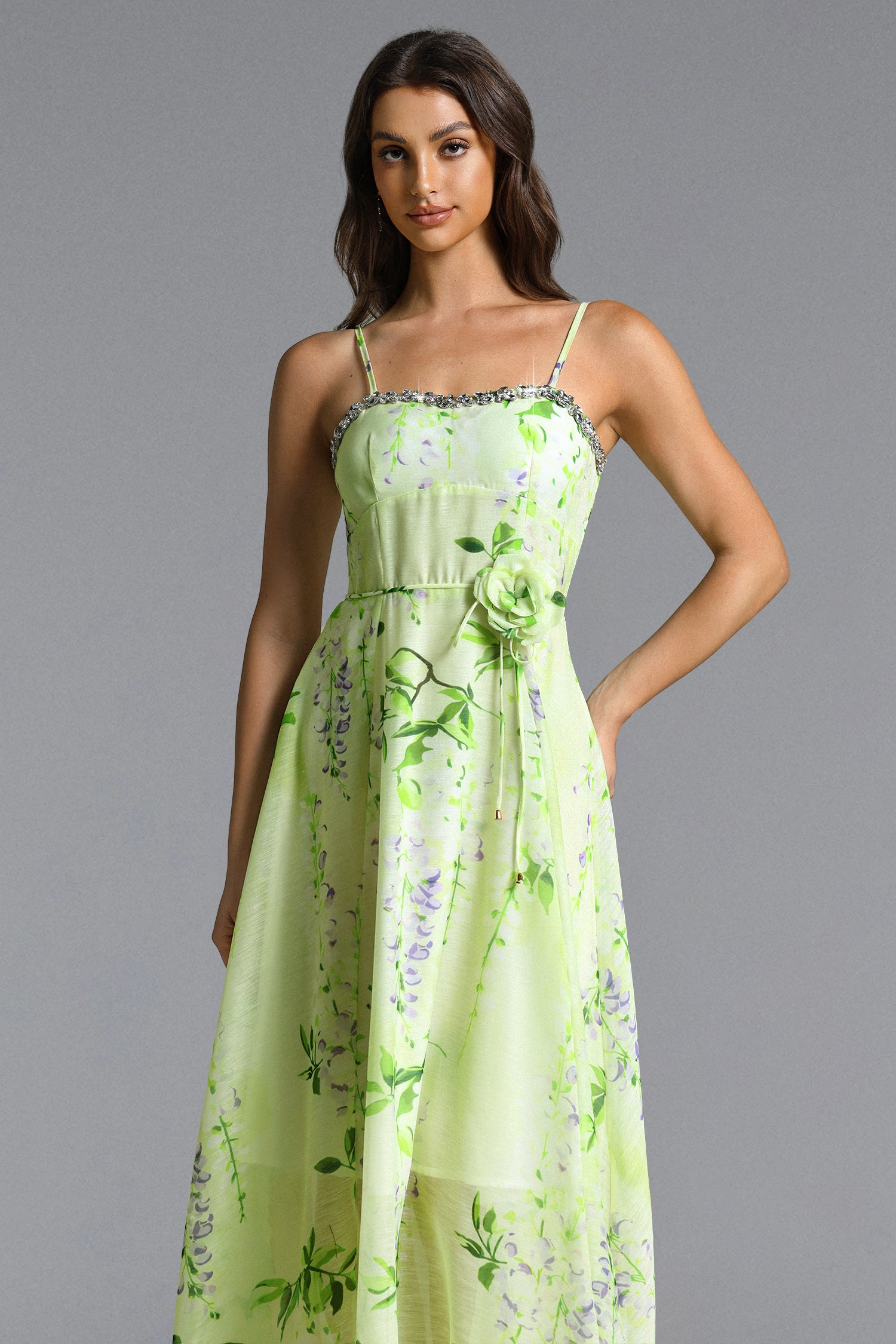 Nevaeh Romantic Tailored Rhinestone Floral Print Green Maxi Dress