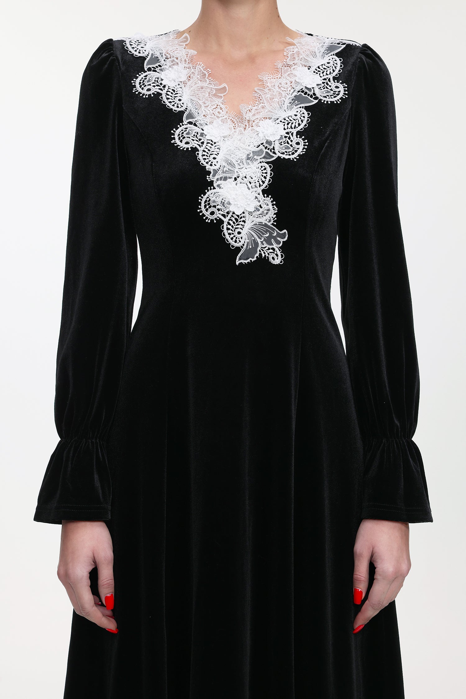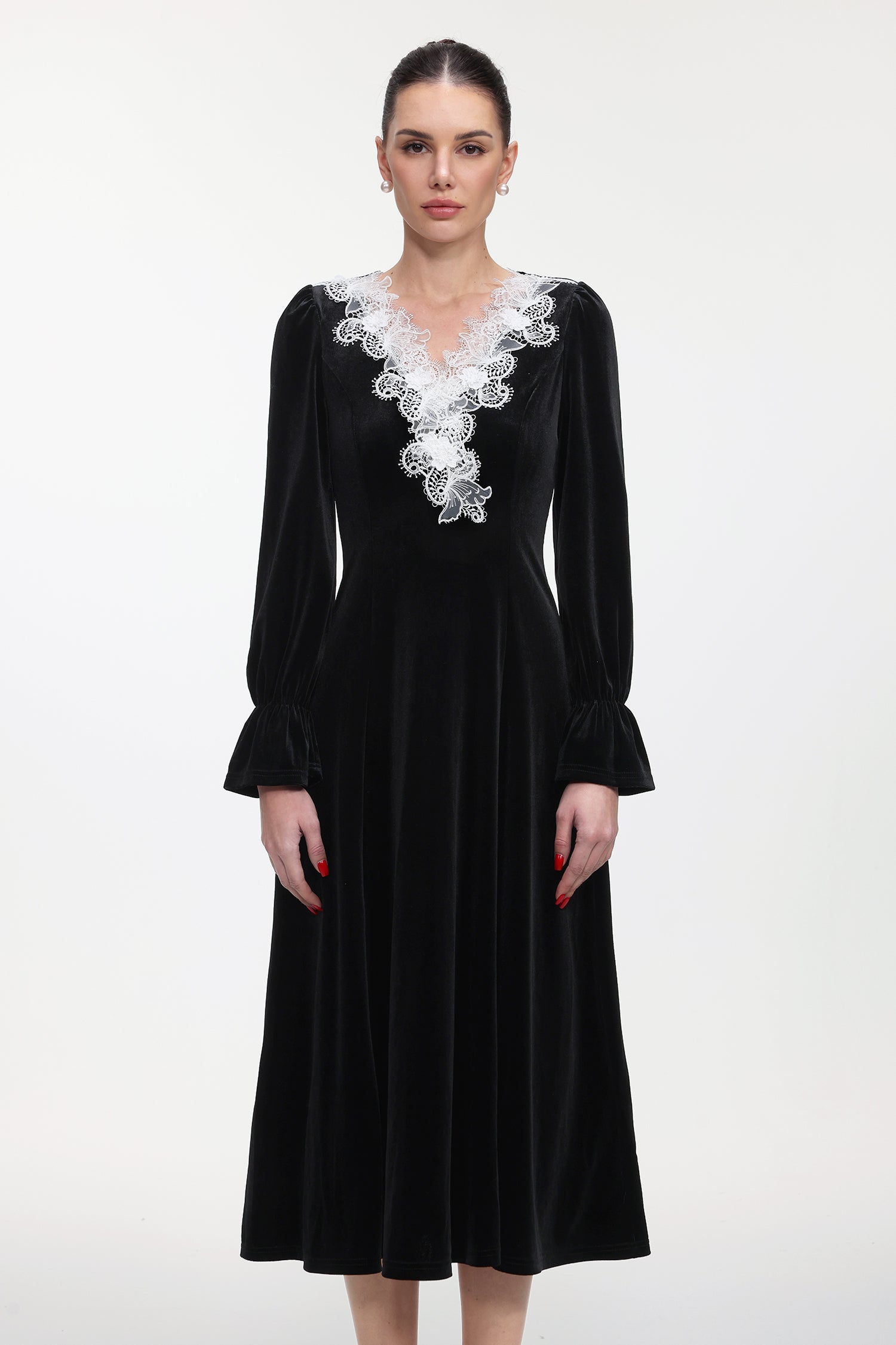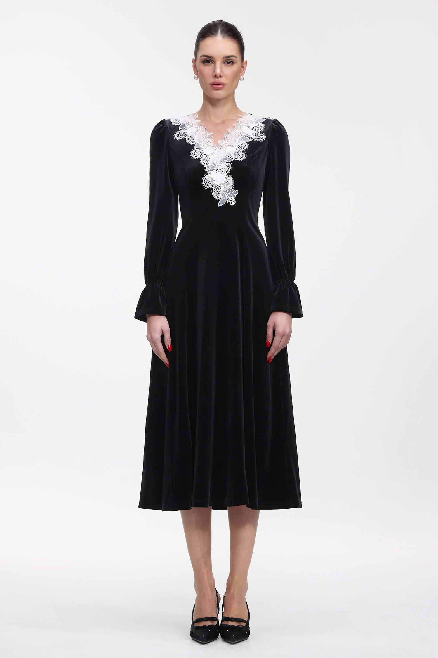Daona Elegant Contour Long Sleeve Lace Trim Velvet Maxi Dress