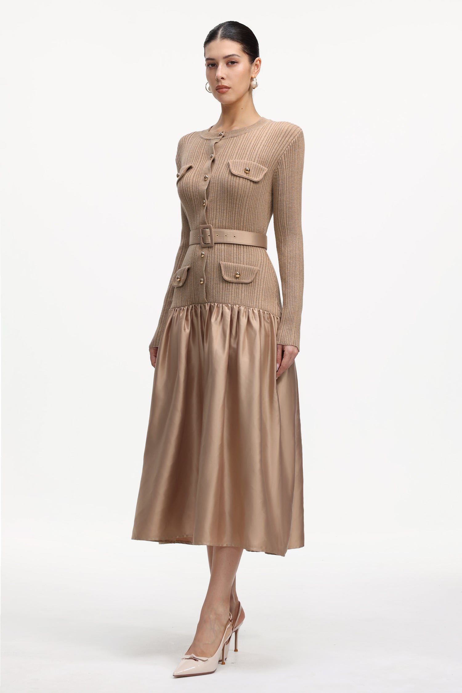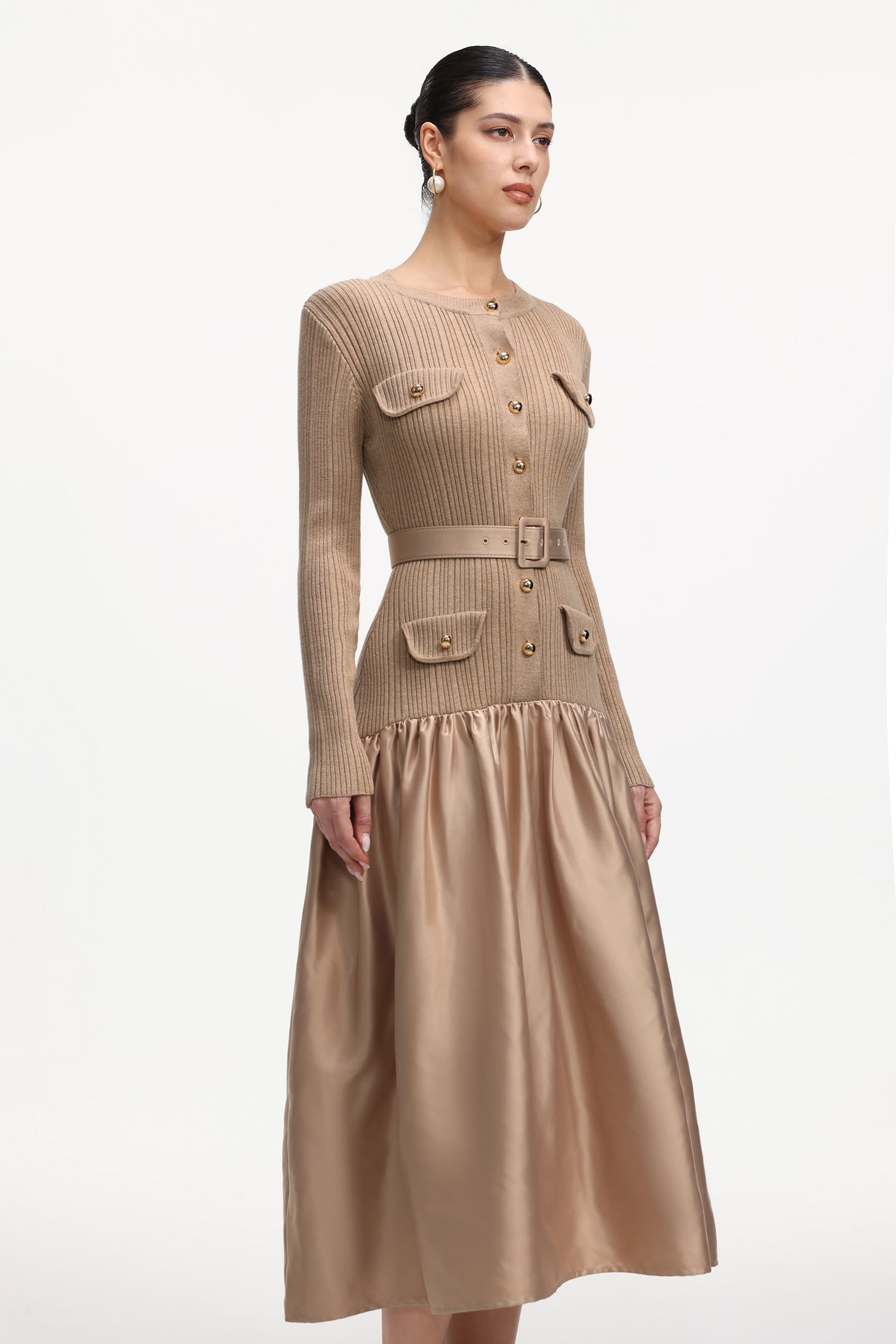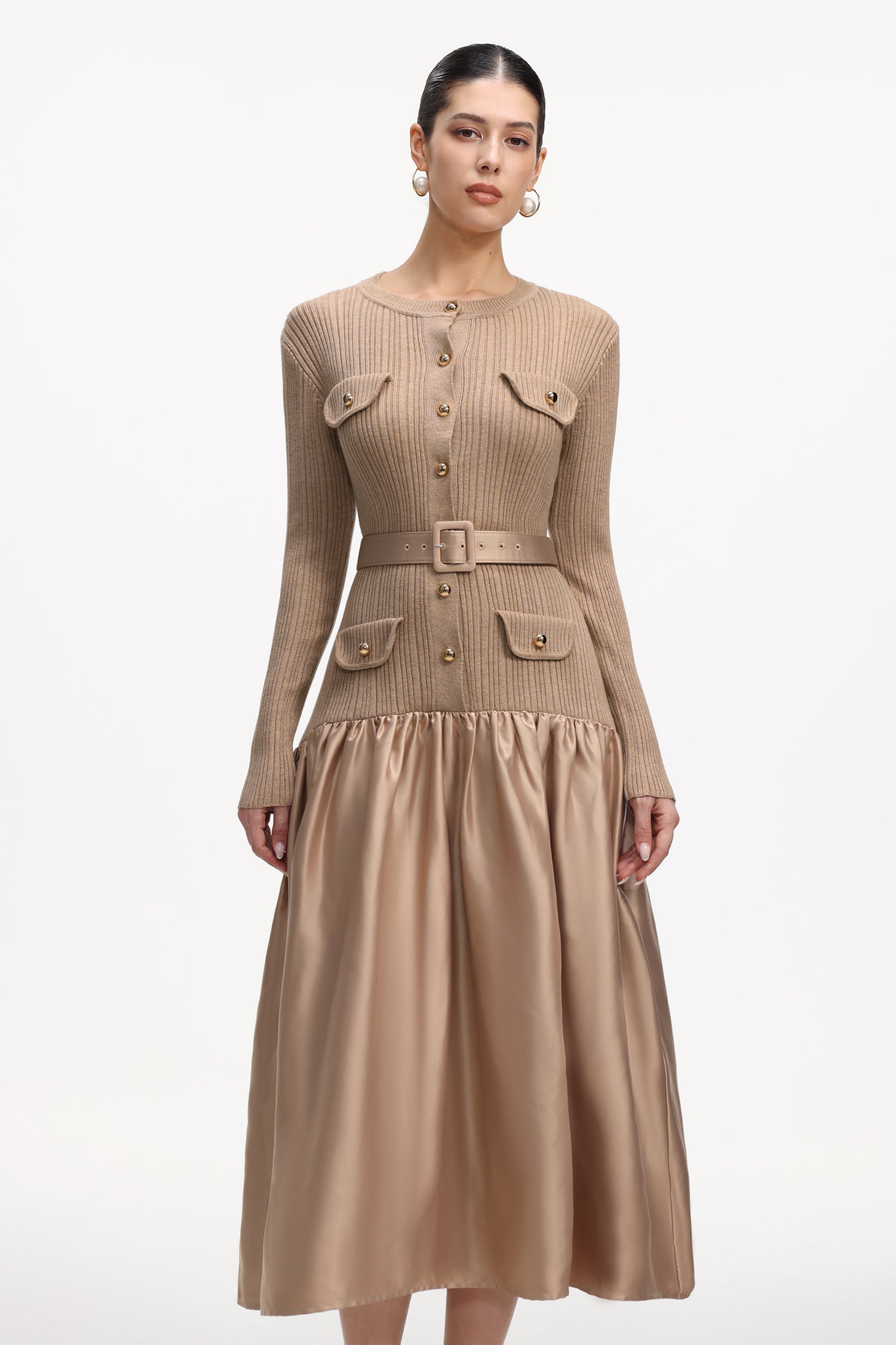 Marcia Elegant Contour Long Sleeve Knit Satin Maxi Dress