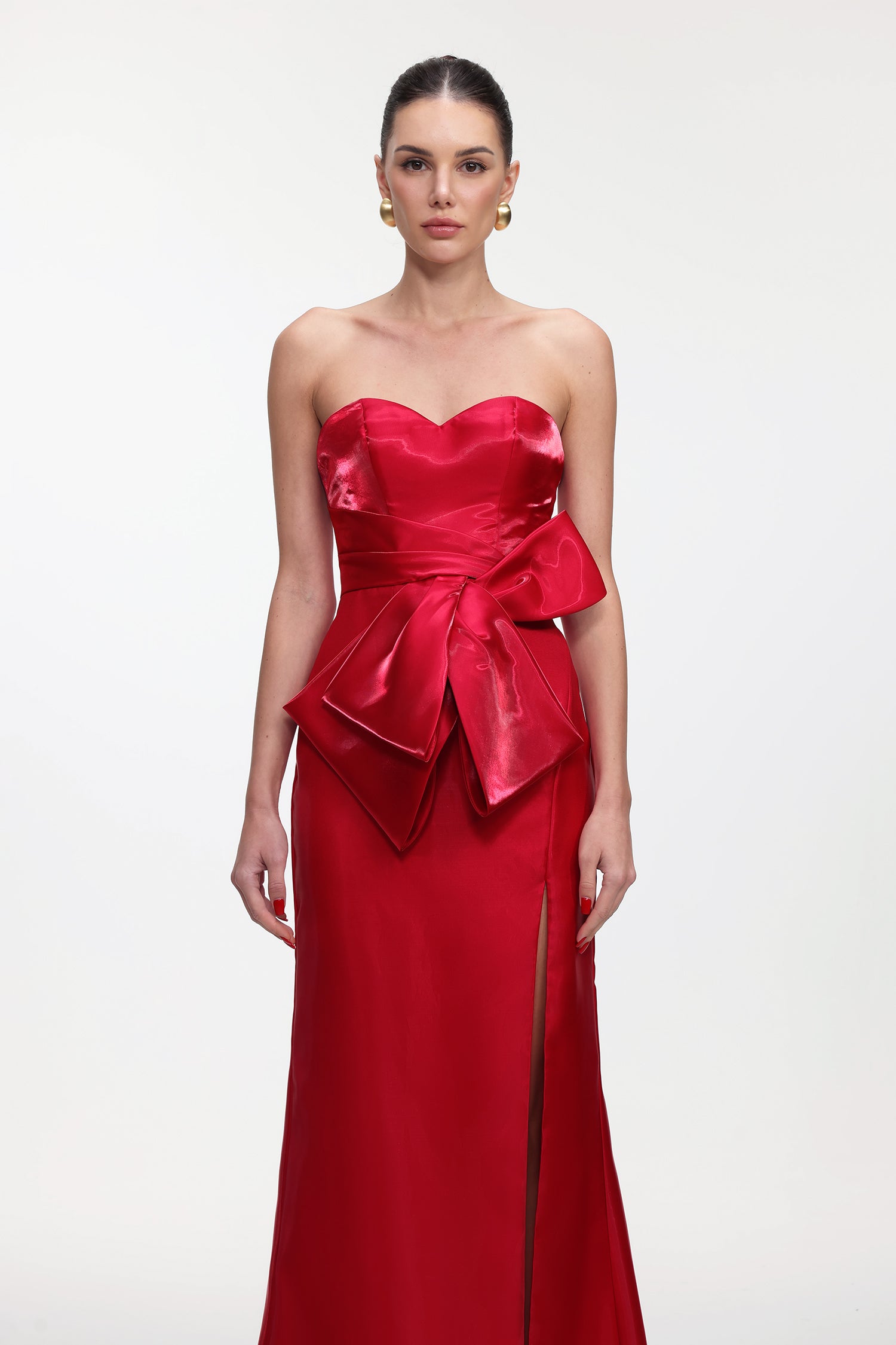 Mishell Romantic Lustrous Strapless Bow High Slit Maxi Dress