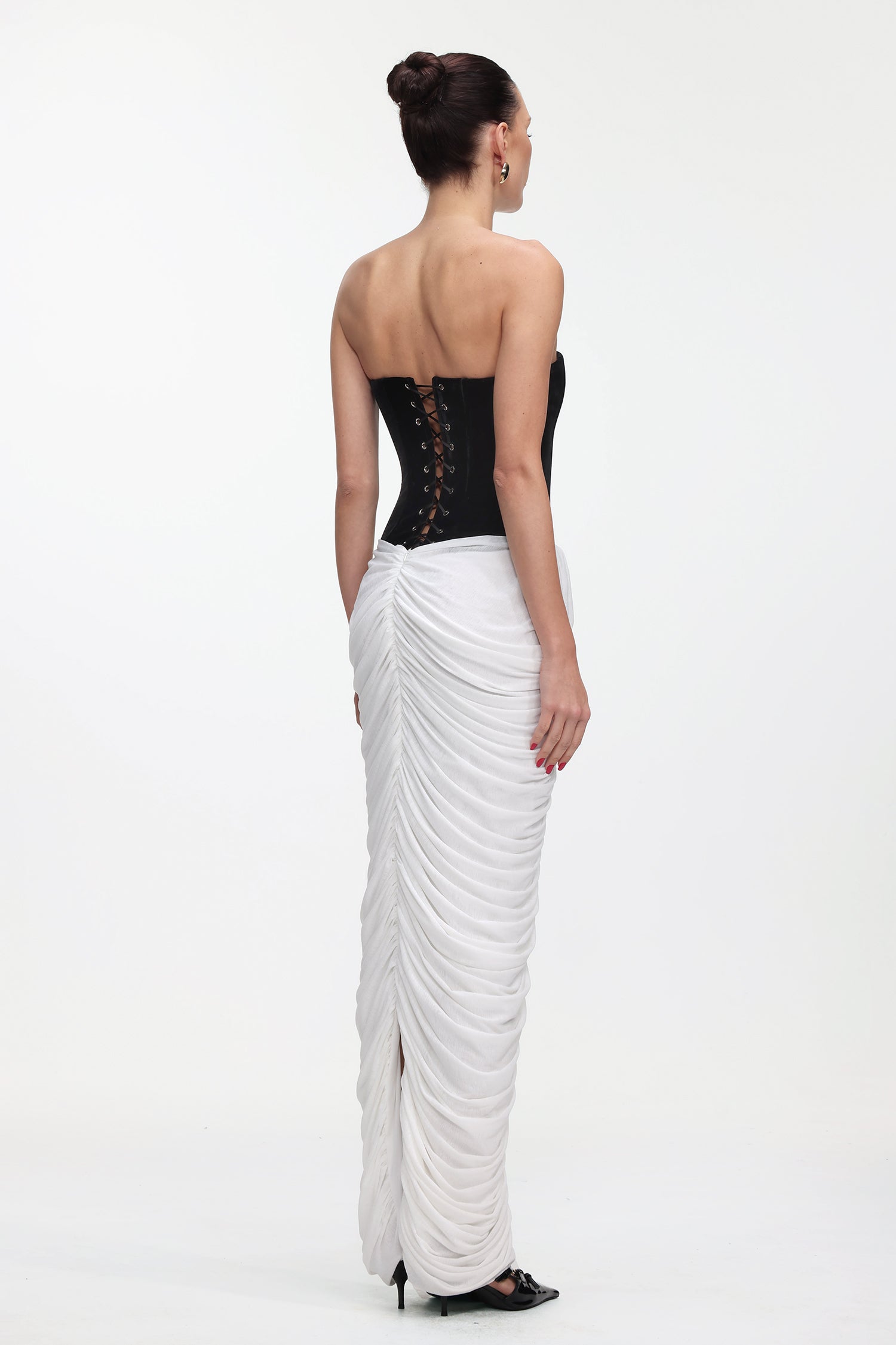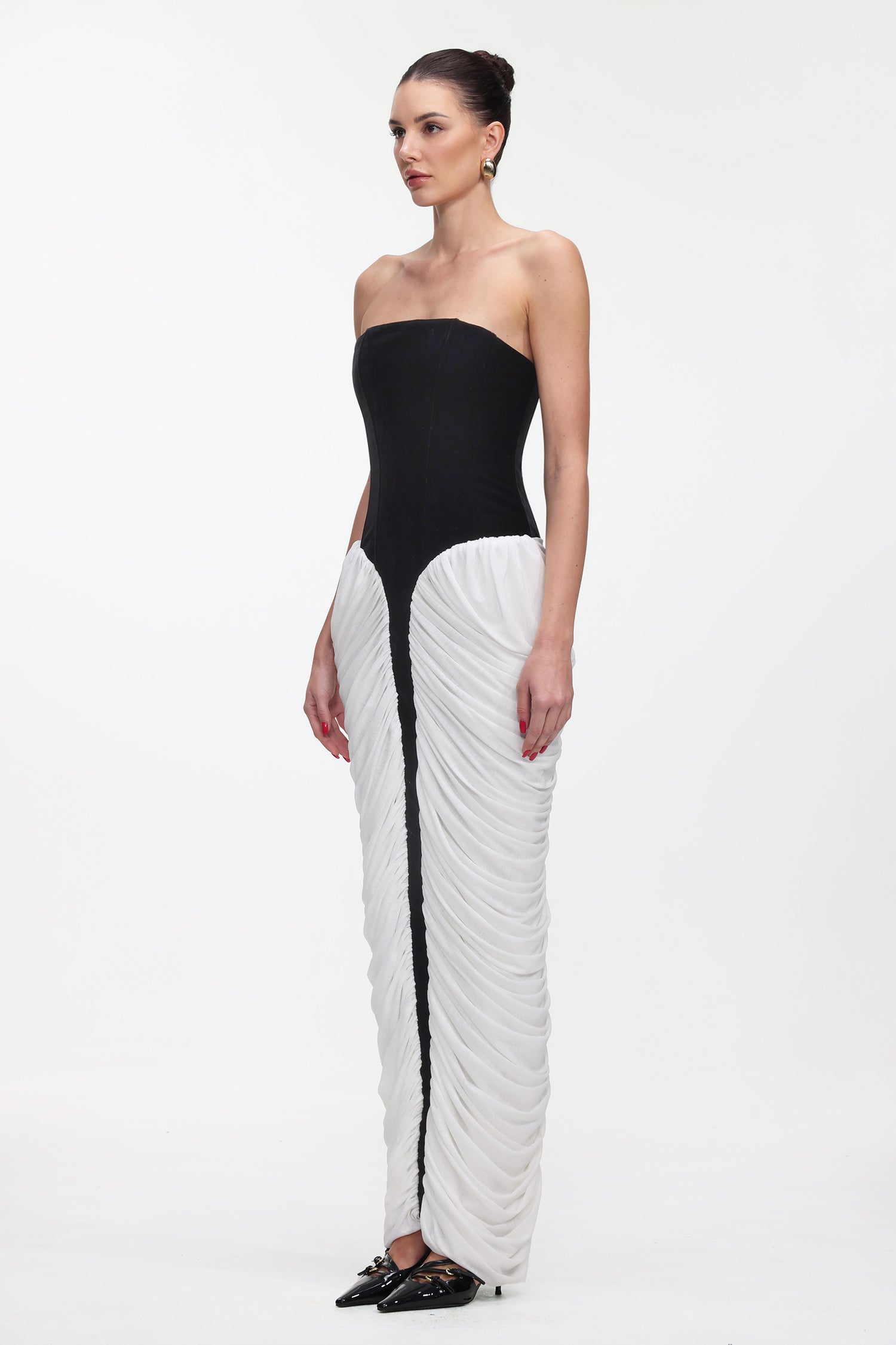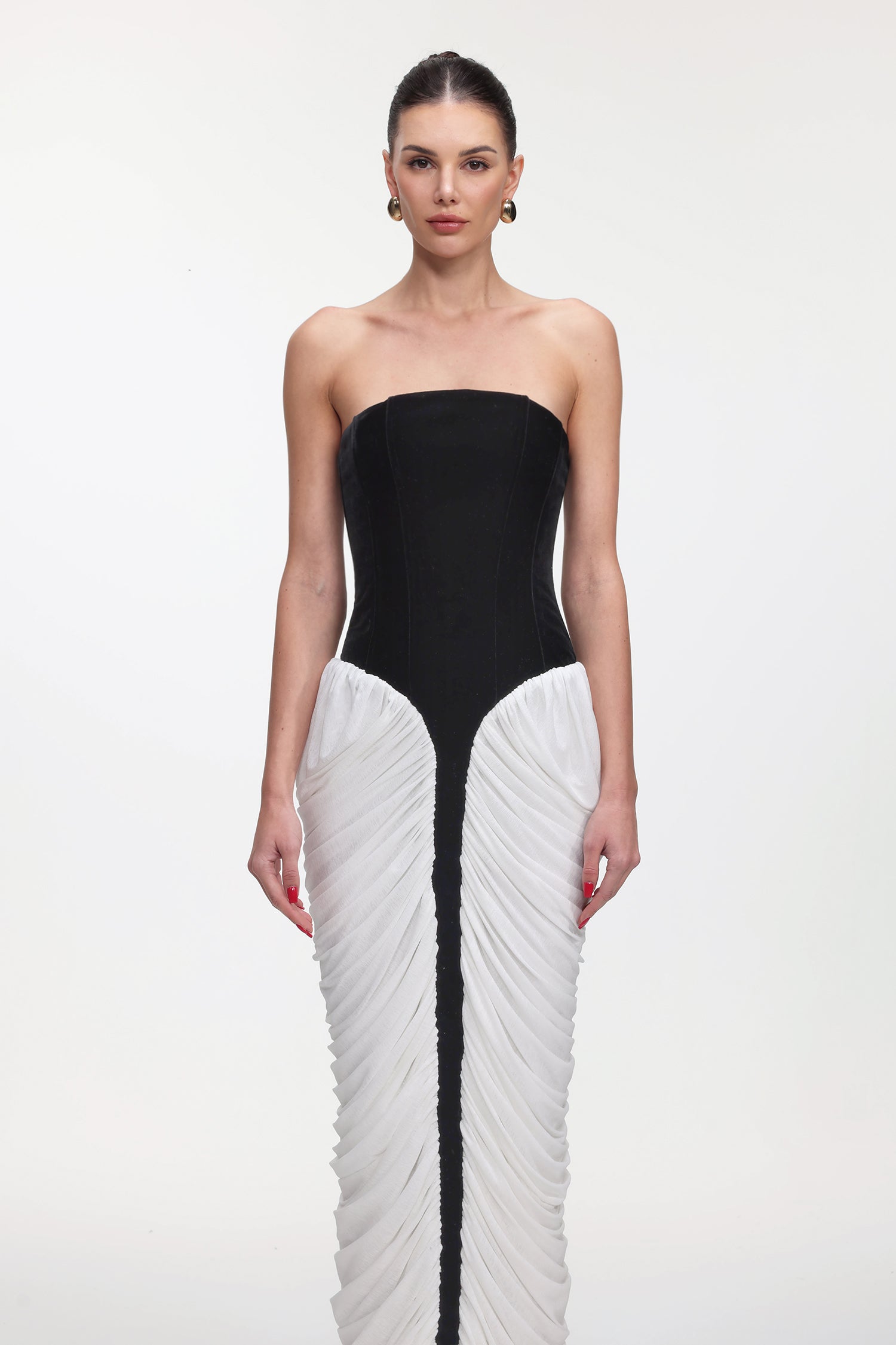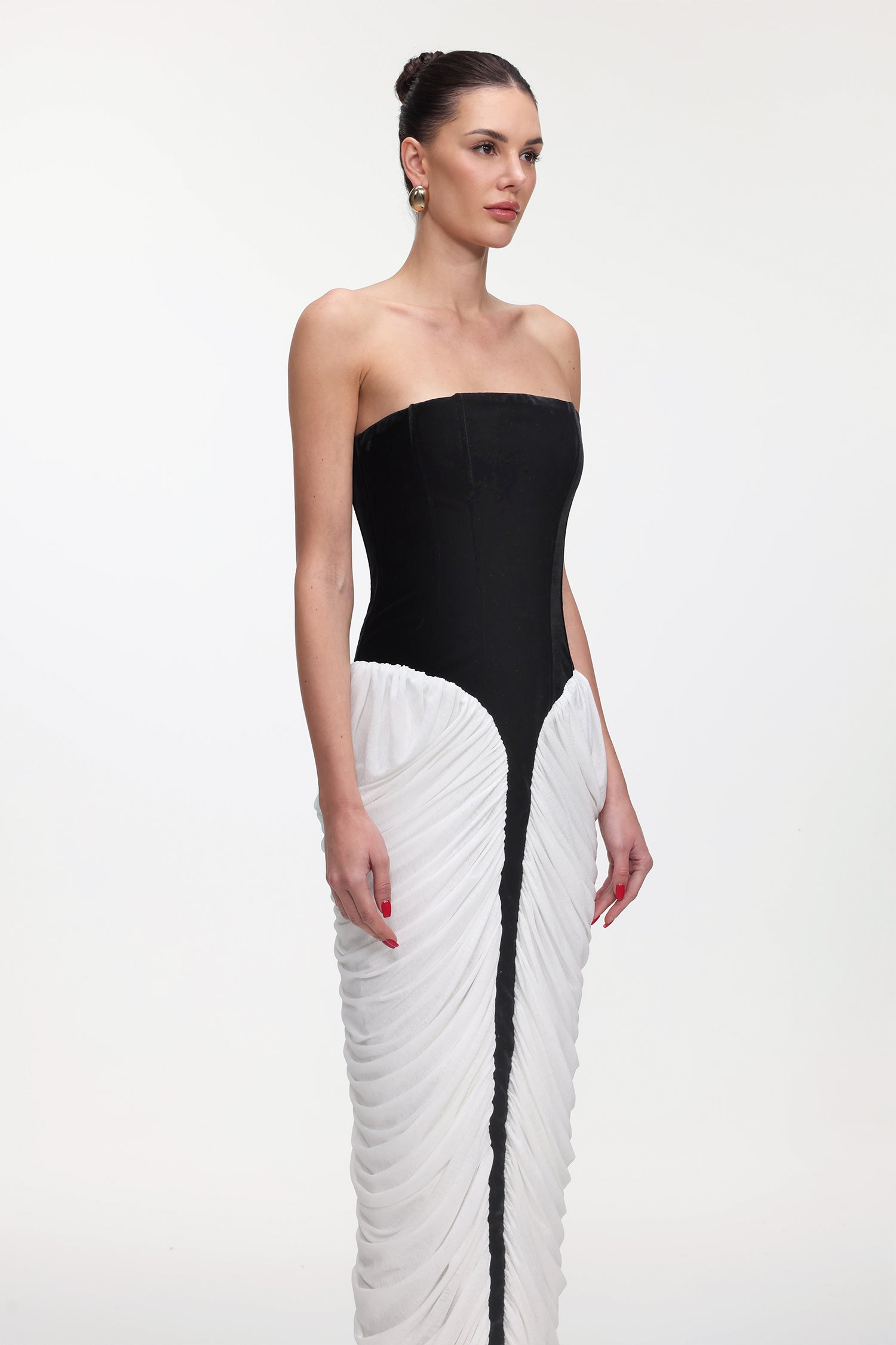Sefa Chic Contour Strapless Ruched Contrast Velvet Maxi Dress