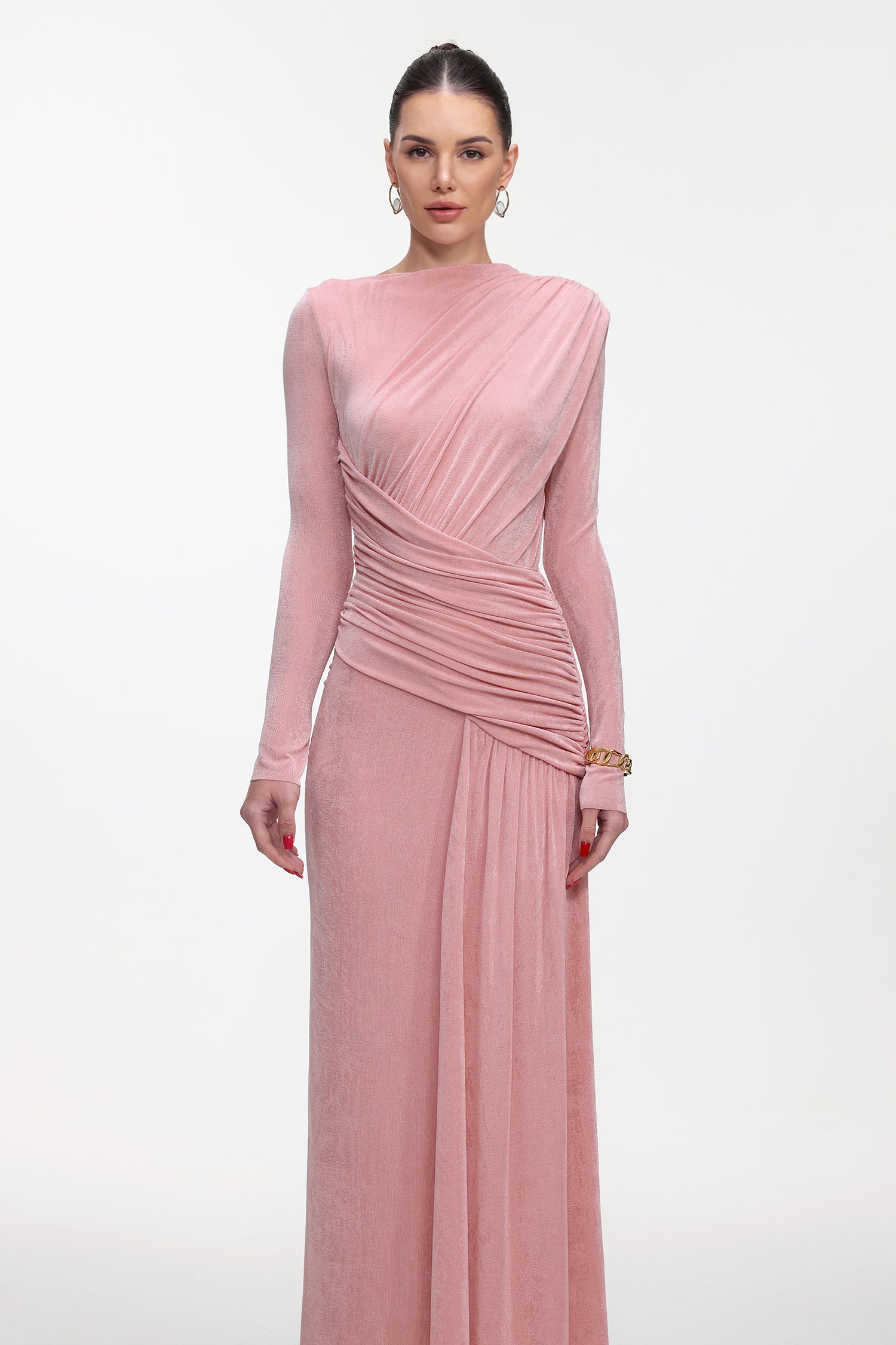 Skyler Elegant Contour Long Sleeve Ruched High Slit Knit Maxi Dress