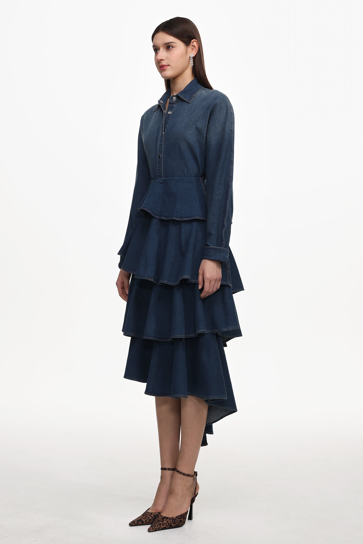 Imola Chic Flowy Long Sleeve Asymmetric Ruffle Denim Top And Skirt Set