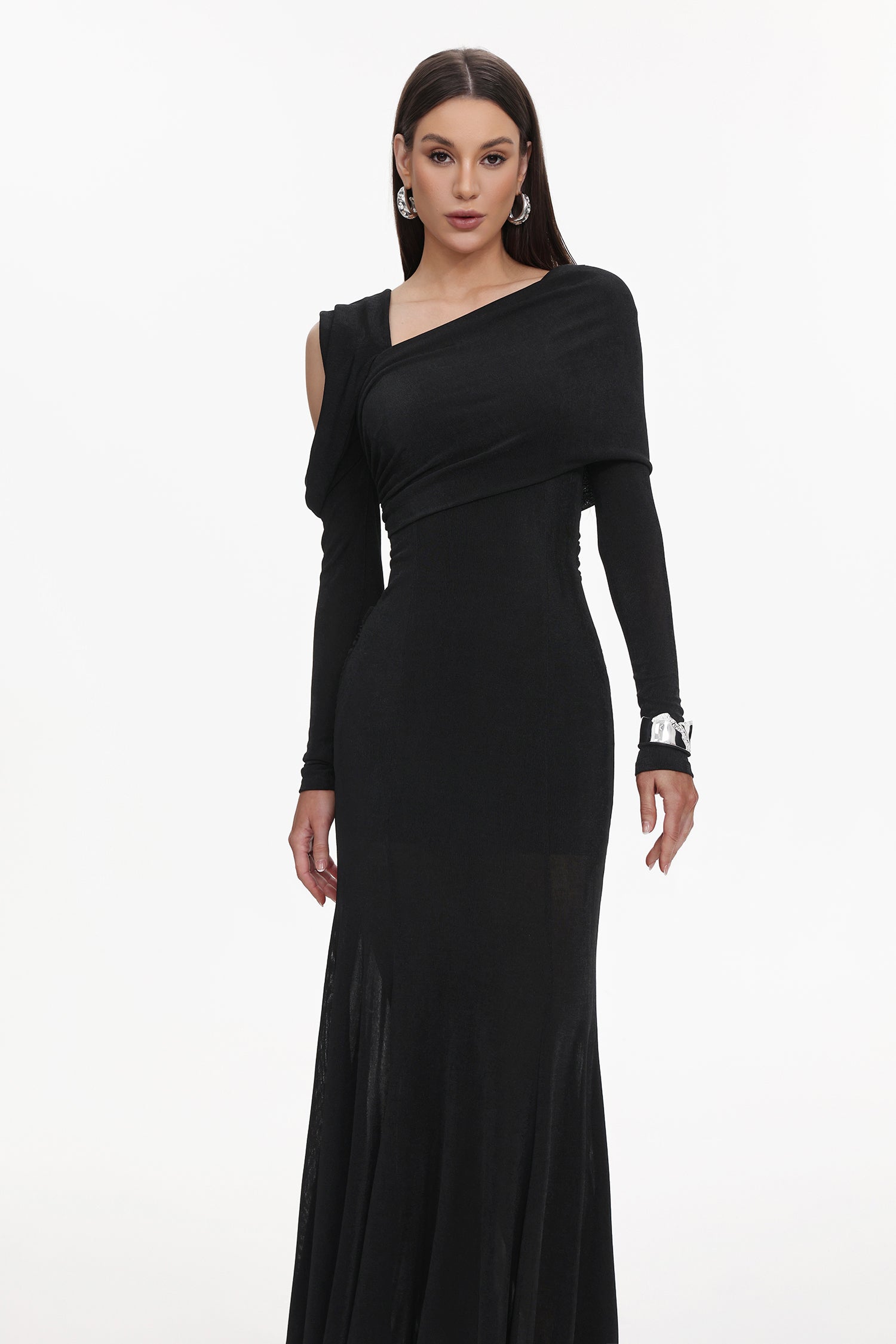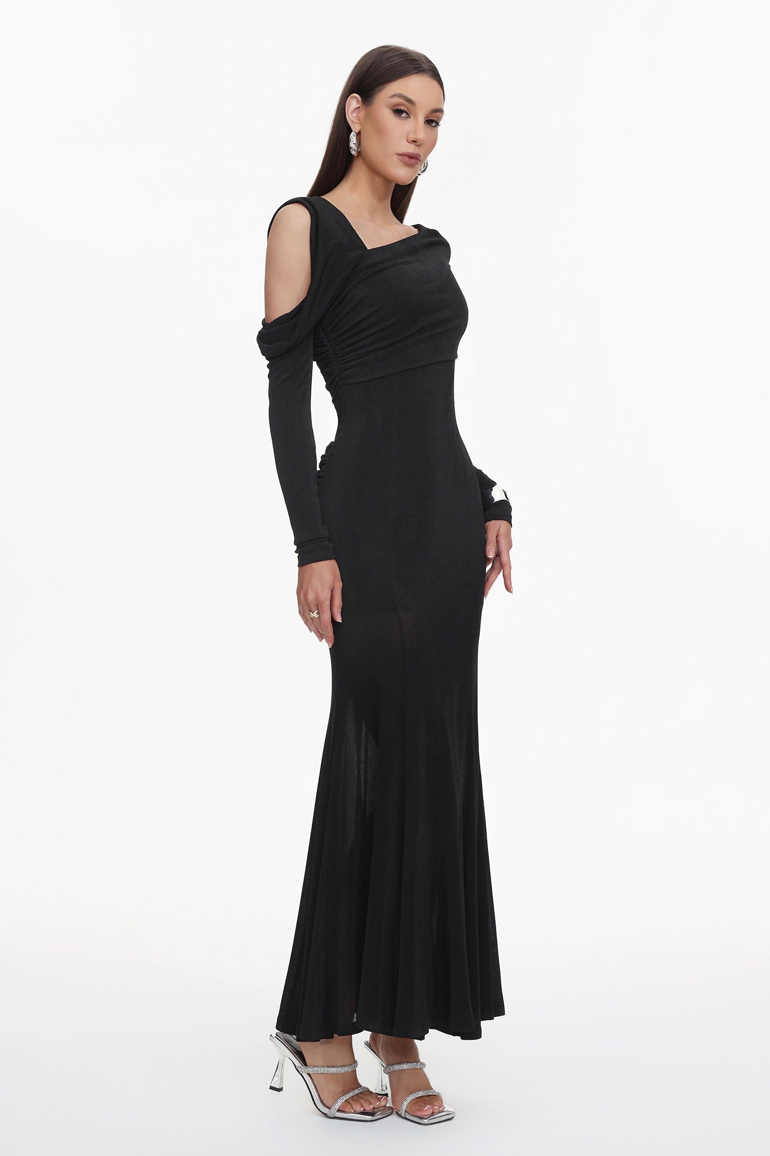 Luysa Elegant Contour One Shoulder Ruched Knit Black Maxi Dress