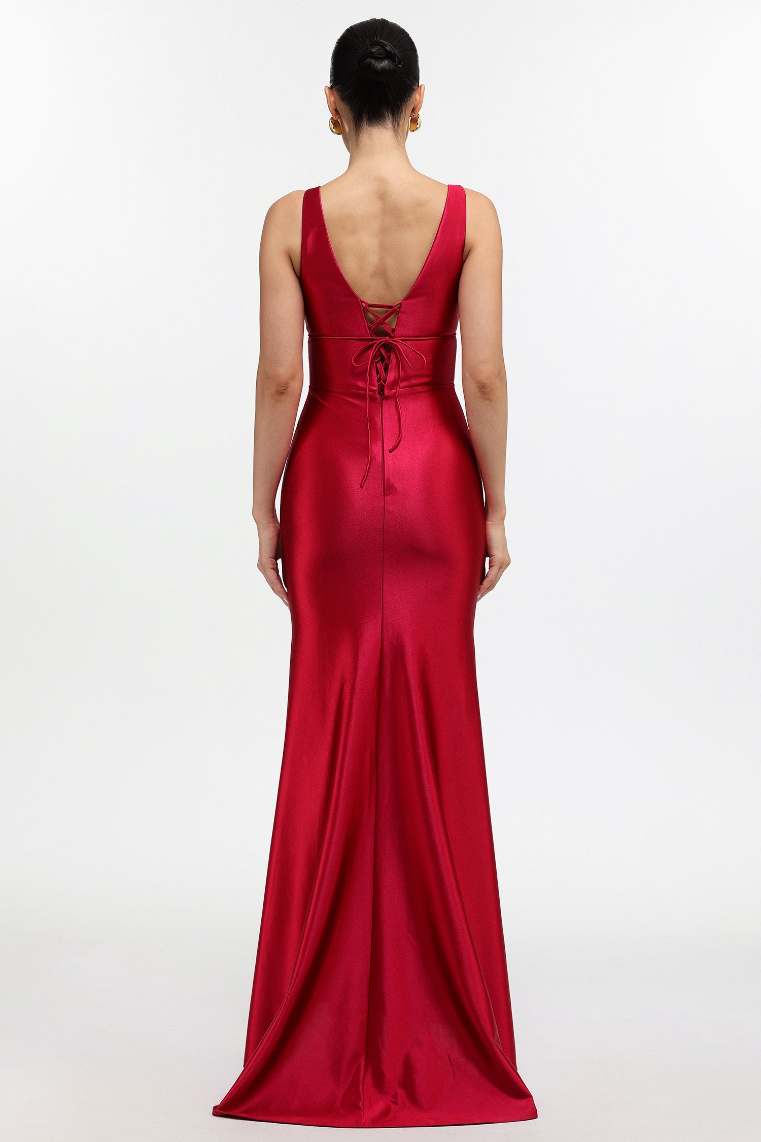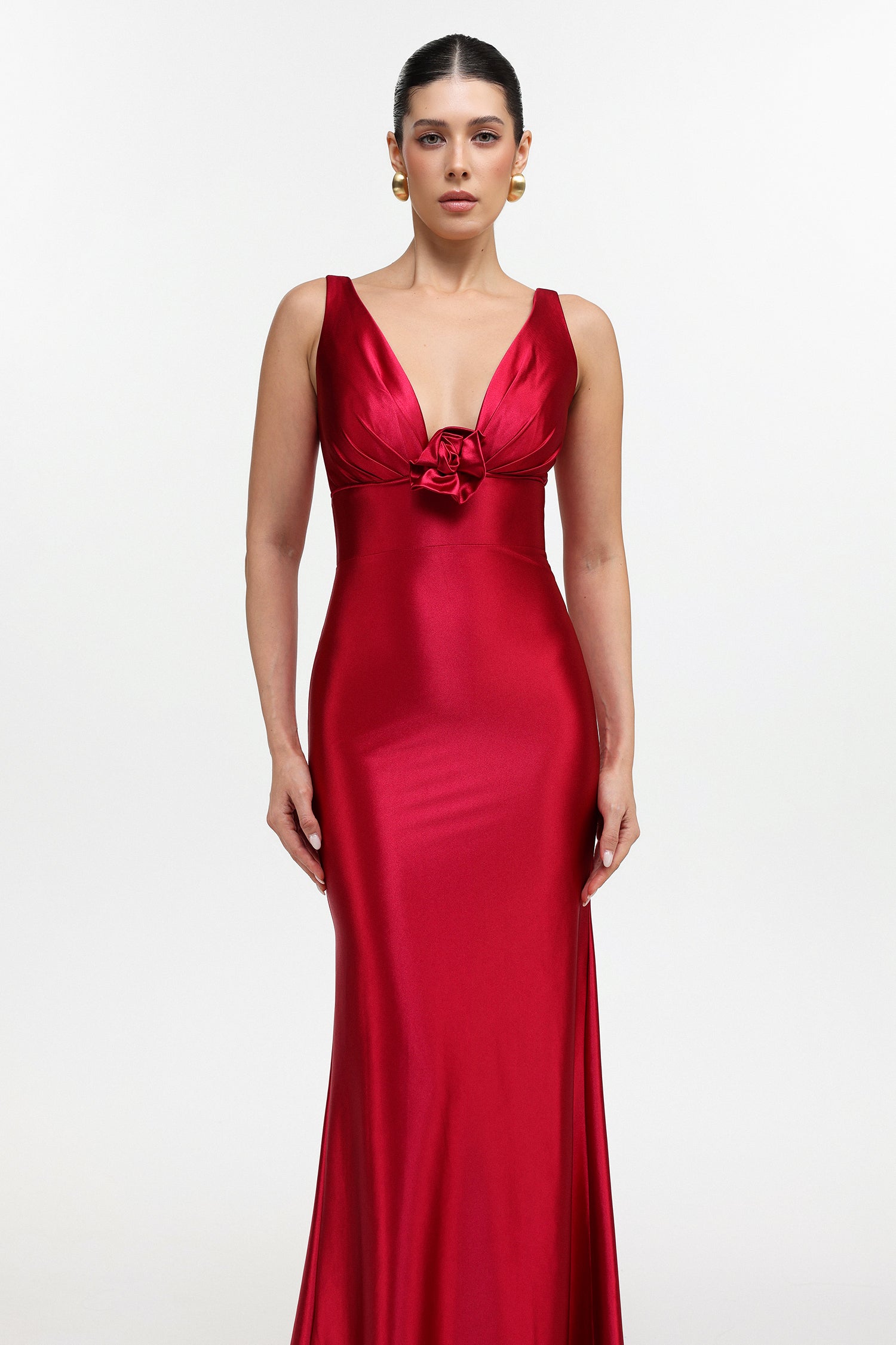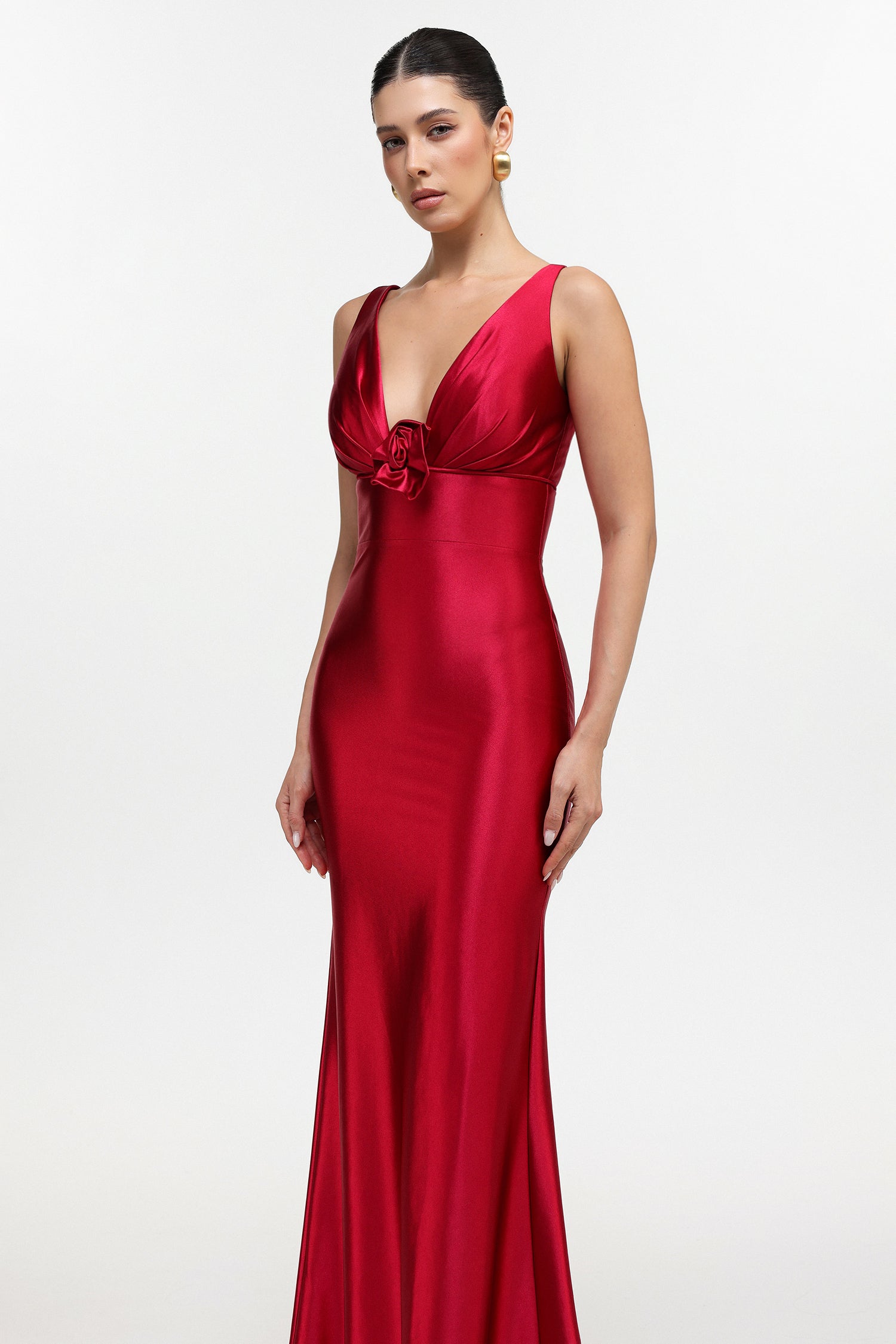 Talasa Elegant Cinched Waist V Neck Satin Maxi Dress