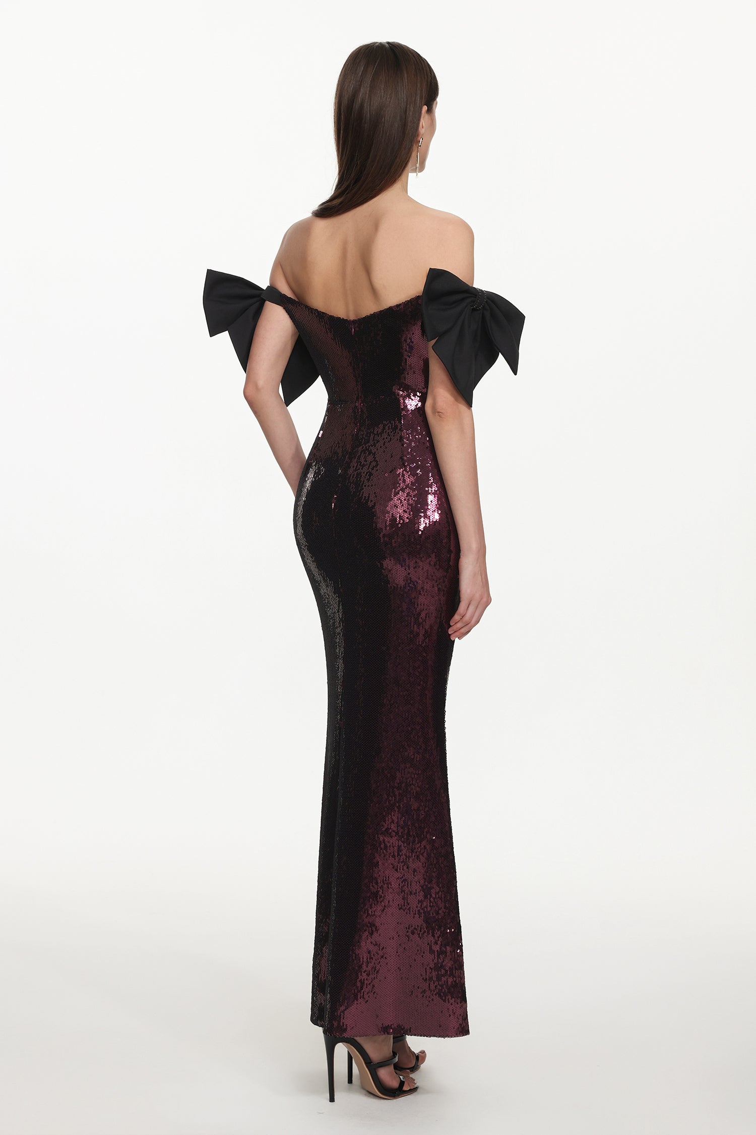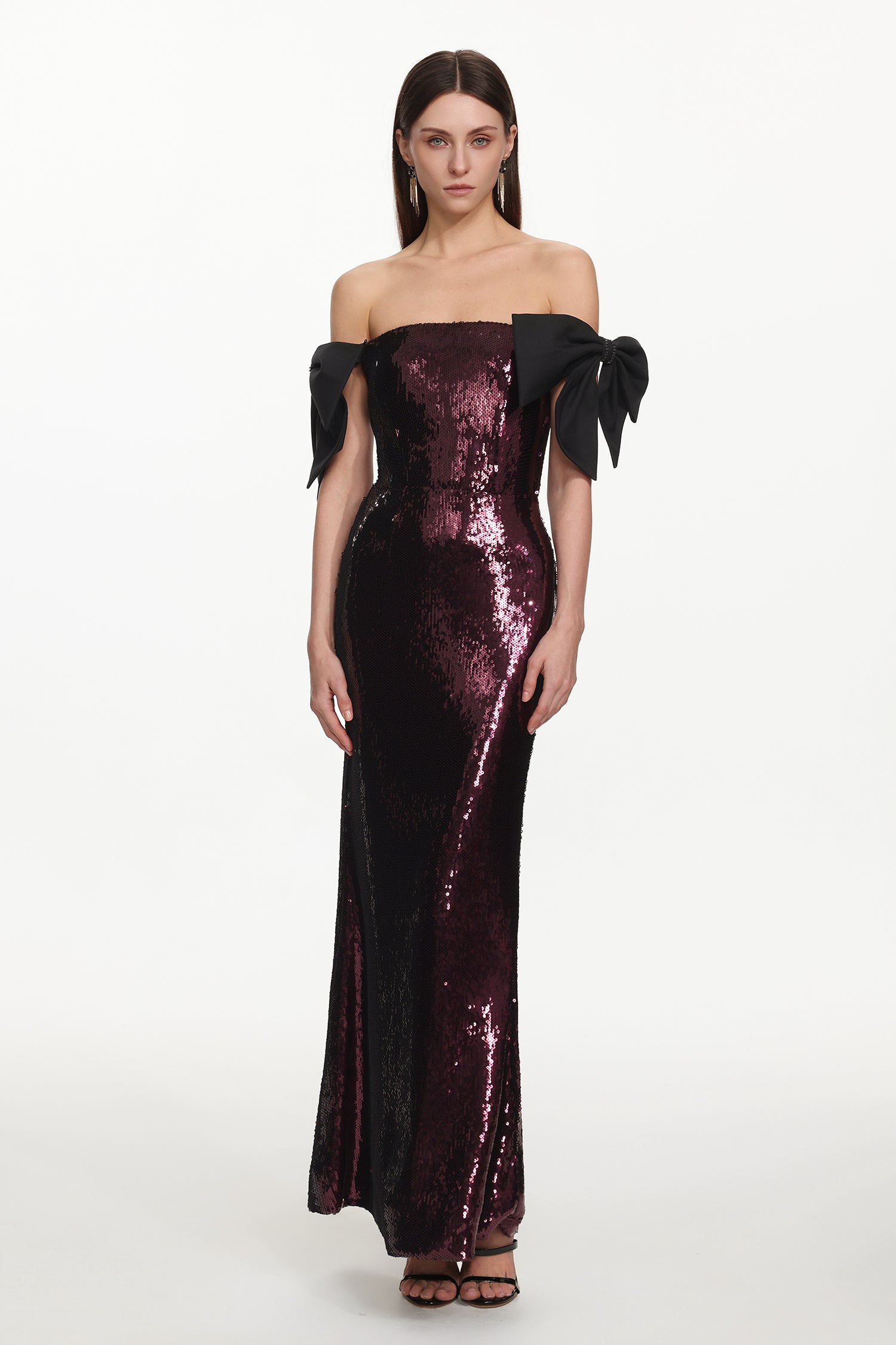 Uzaco Glamorous Contour Off Shoulder Bow Sequin Maxi Dress