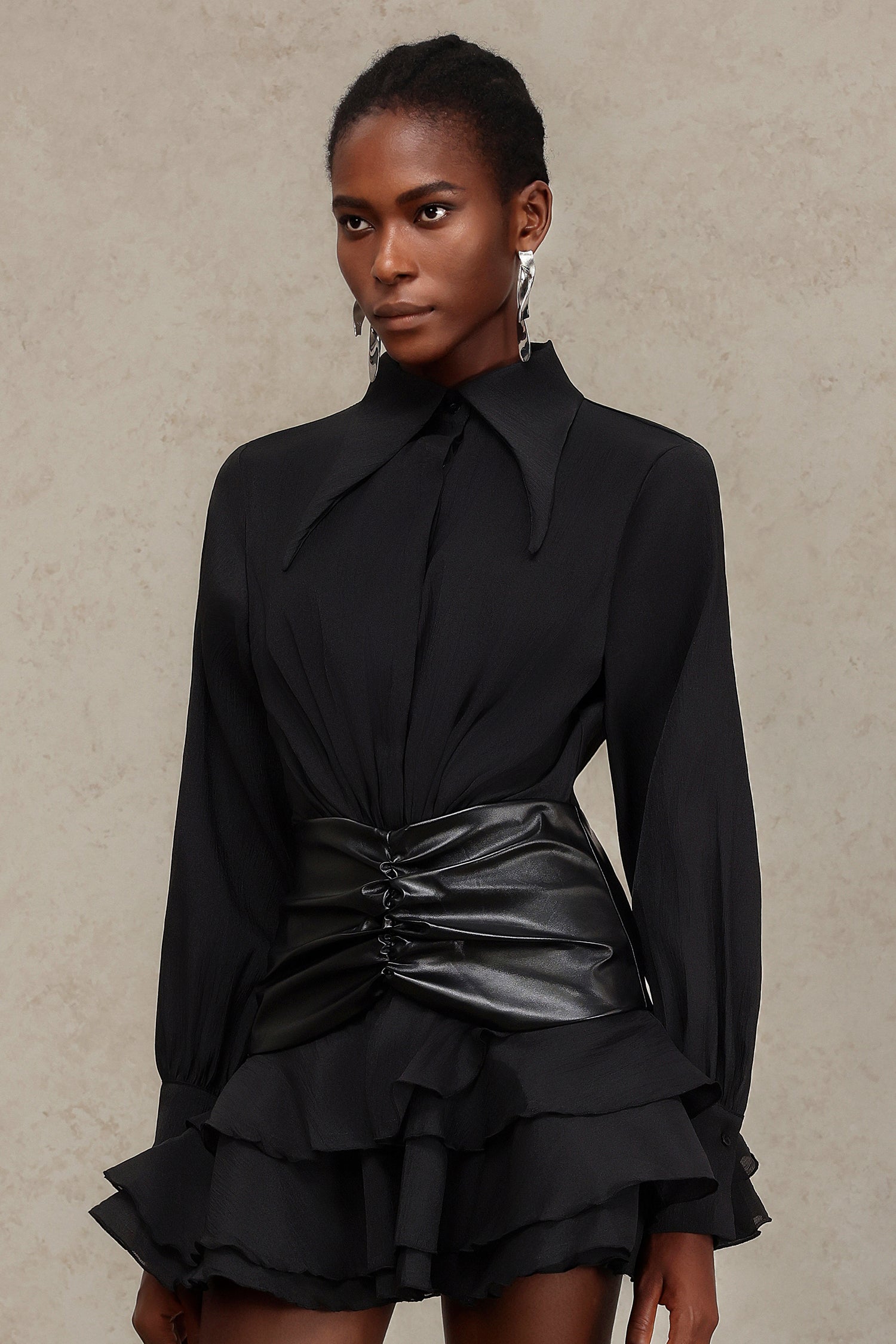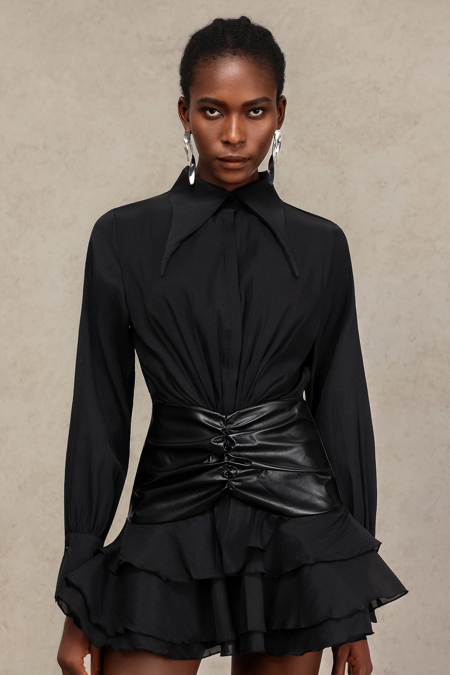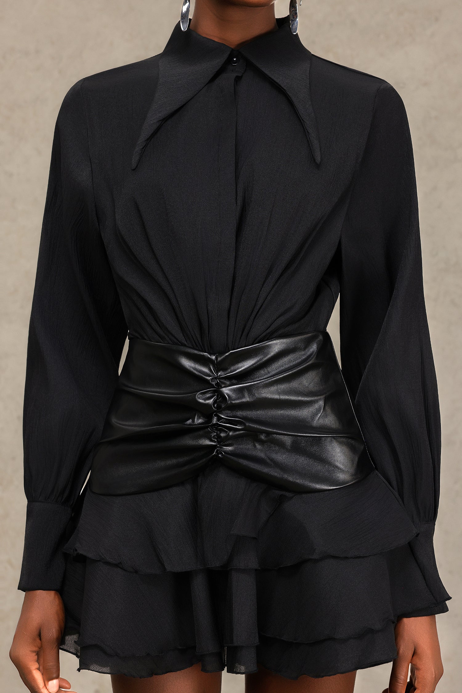Kirara Folds Artificial Leather Long Sleeves Mini Dress