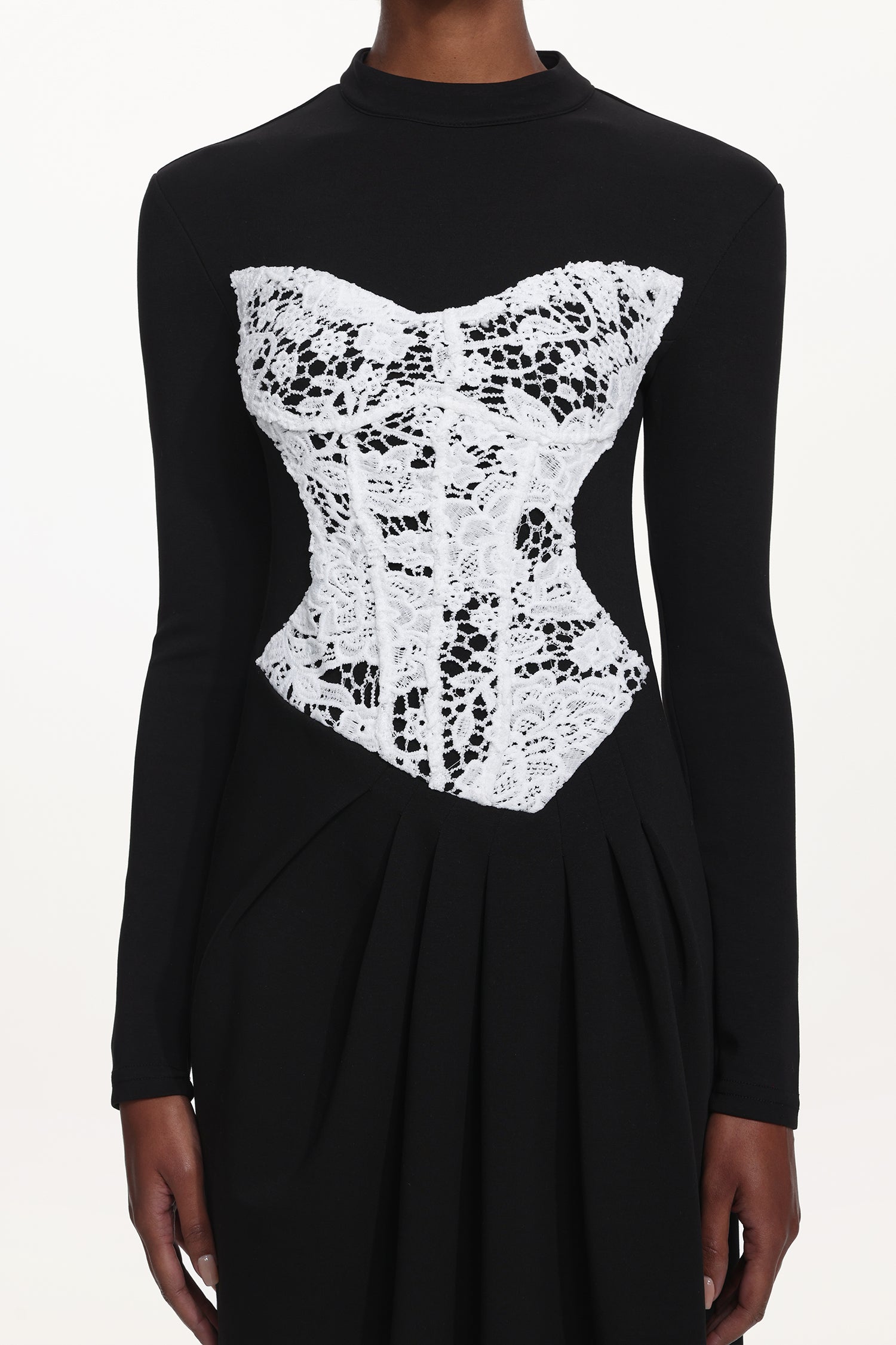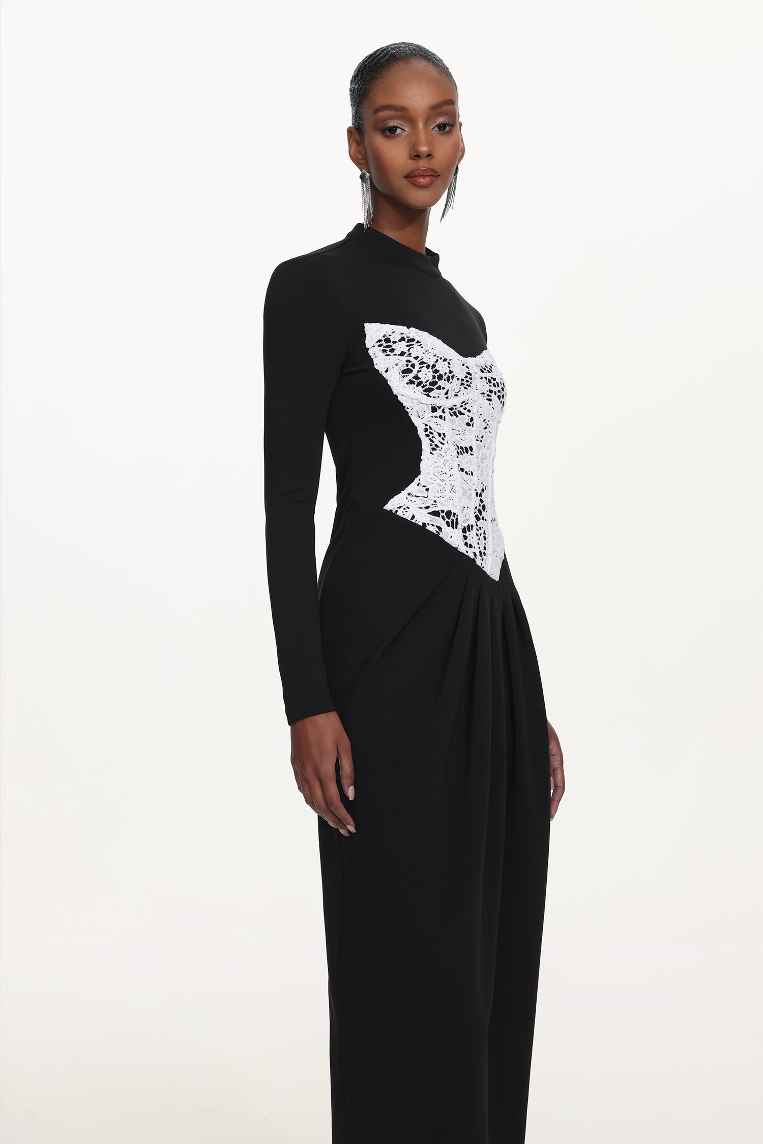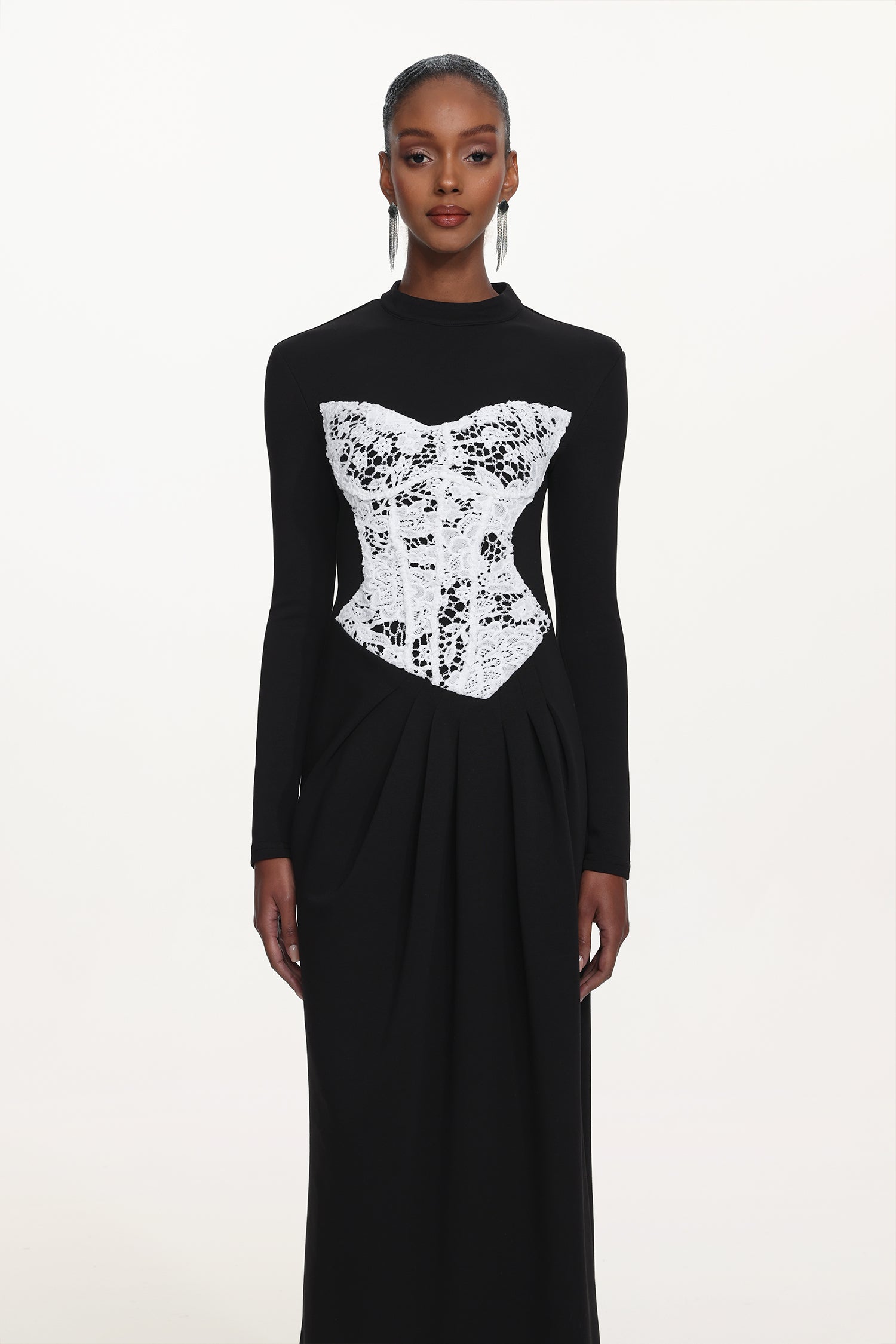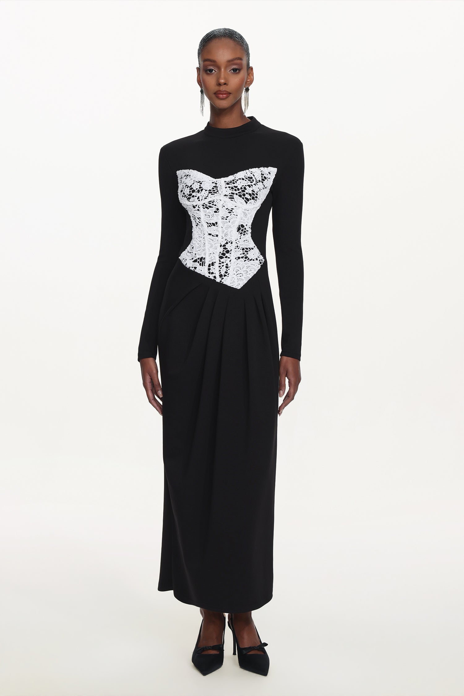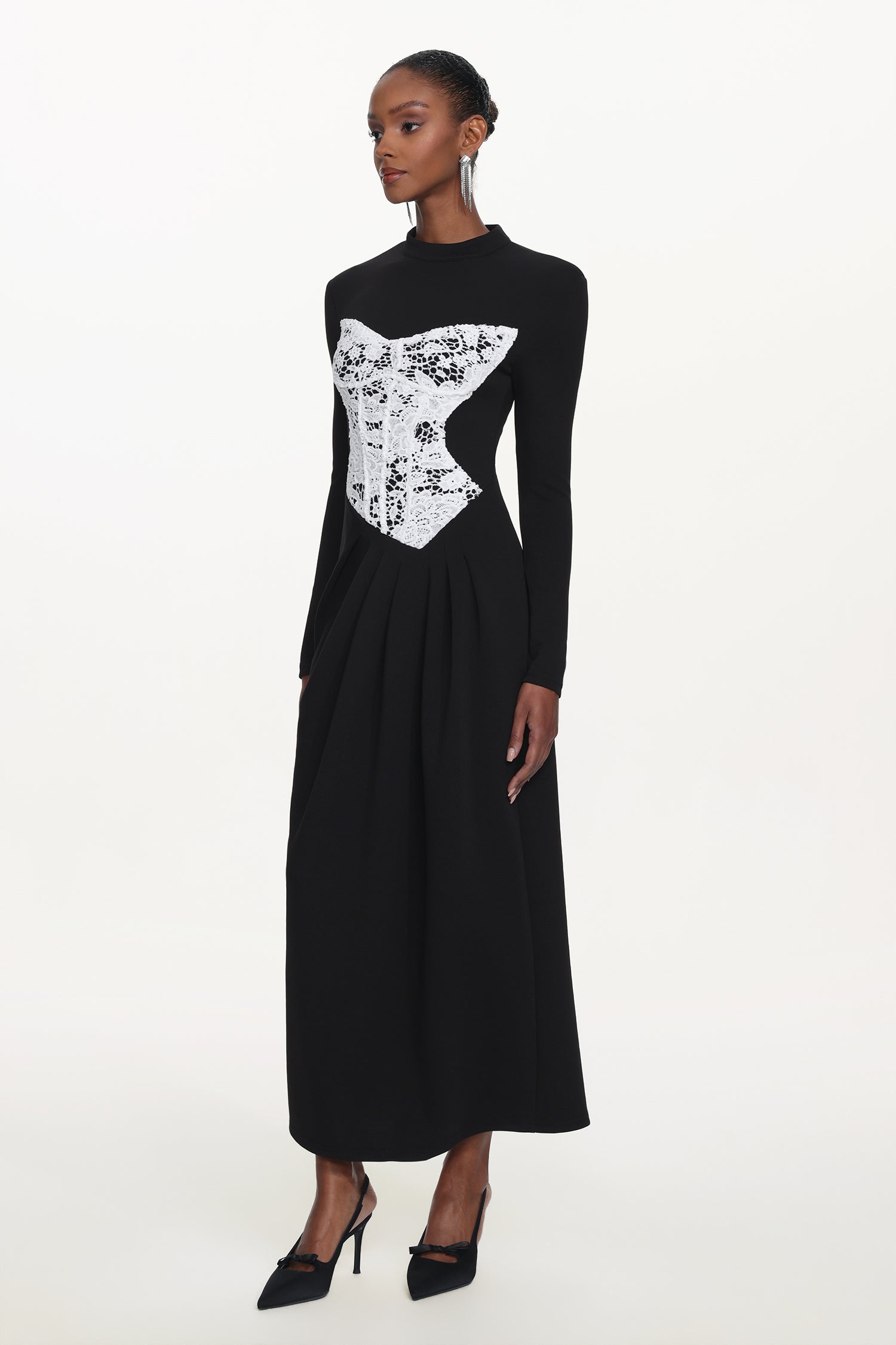Laila Elegant Contour Long Sleeve Lace Panel Pleated Maxi Dress