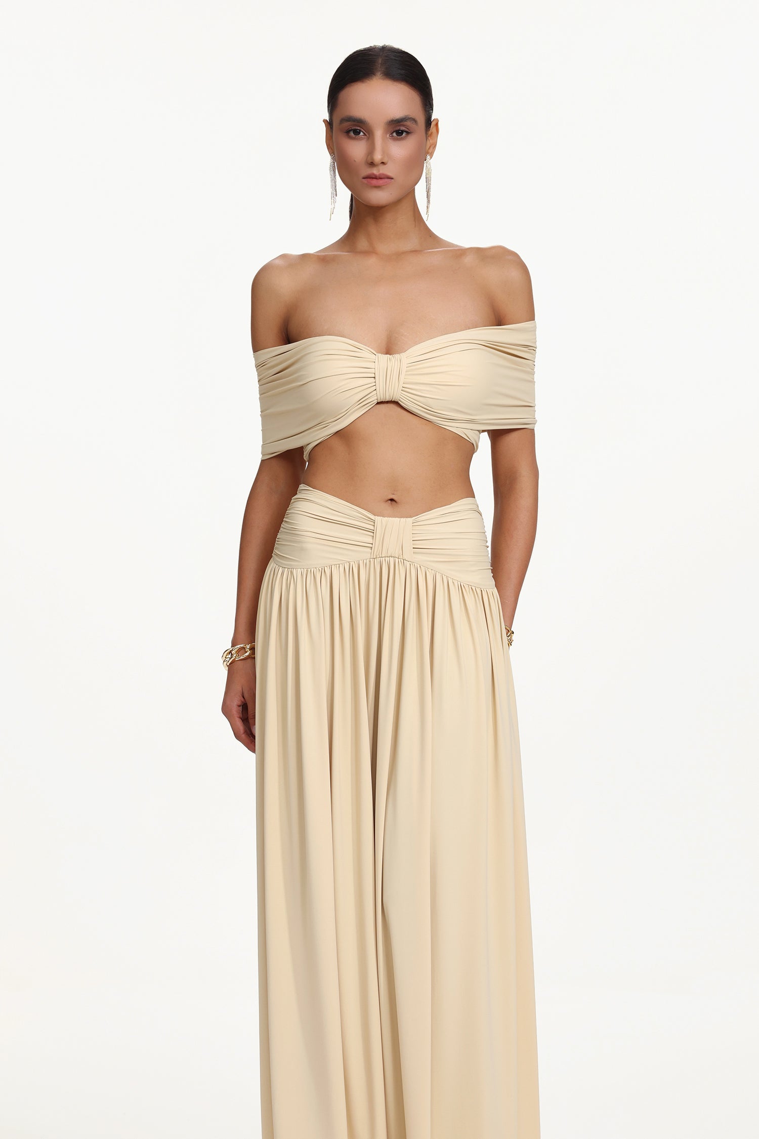 Hanava Chic Contour Off Shoulder Bow Ruched Knit Top and Skirt Set