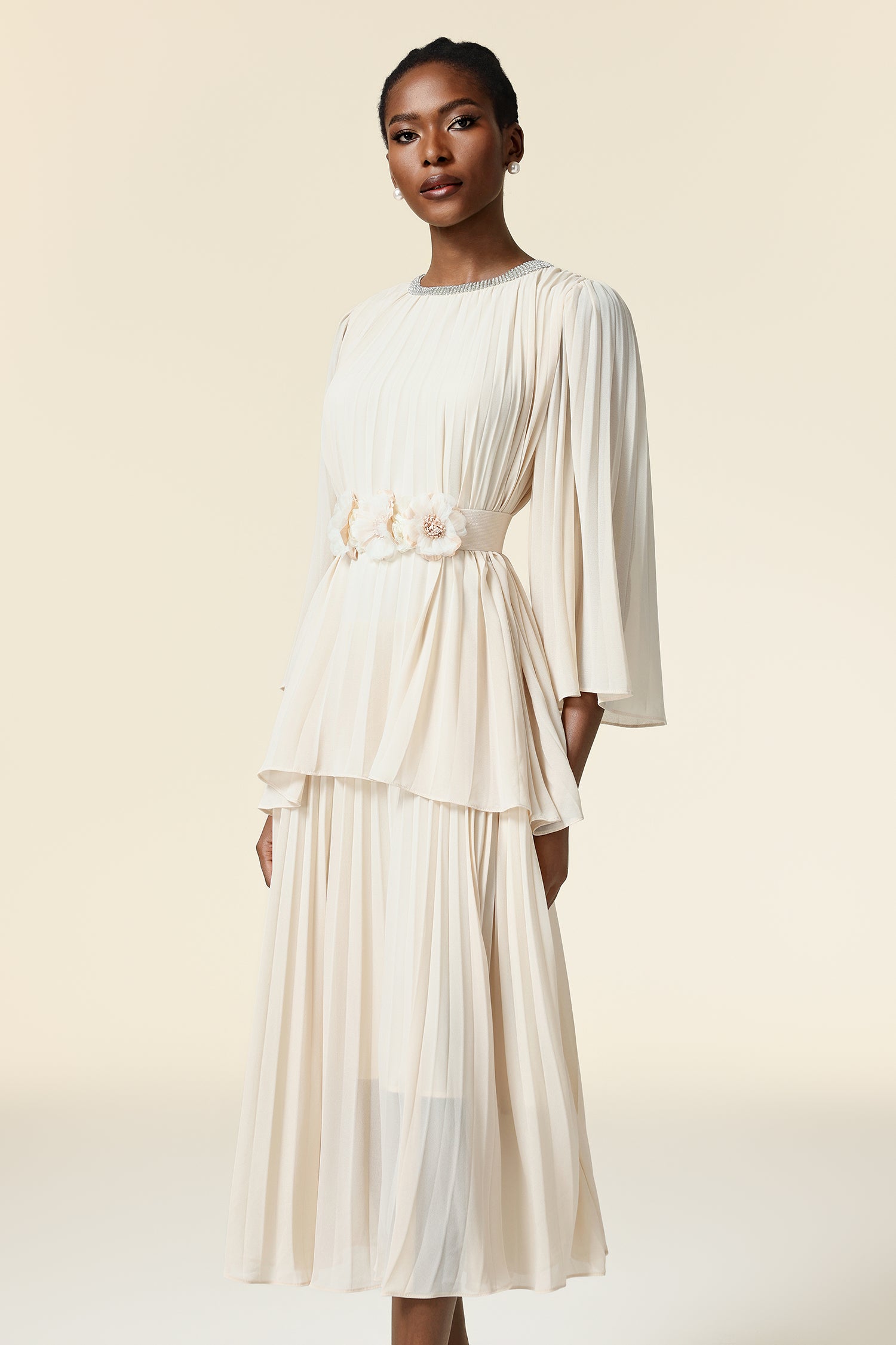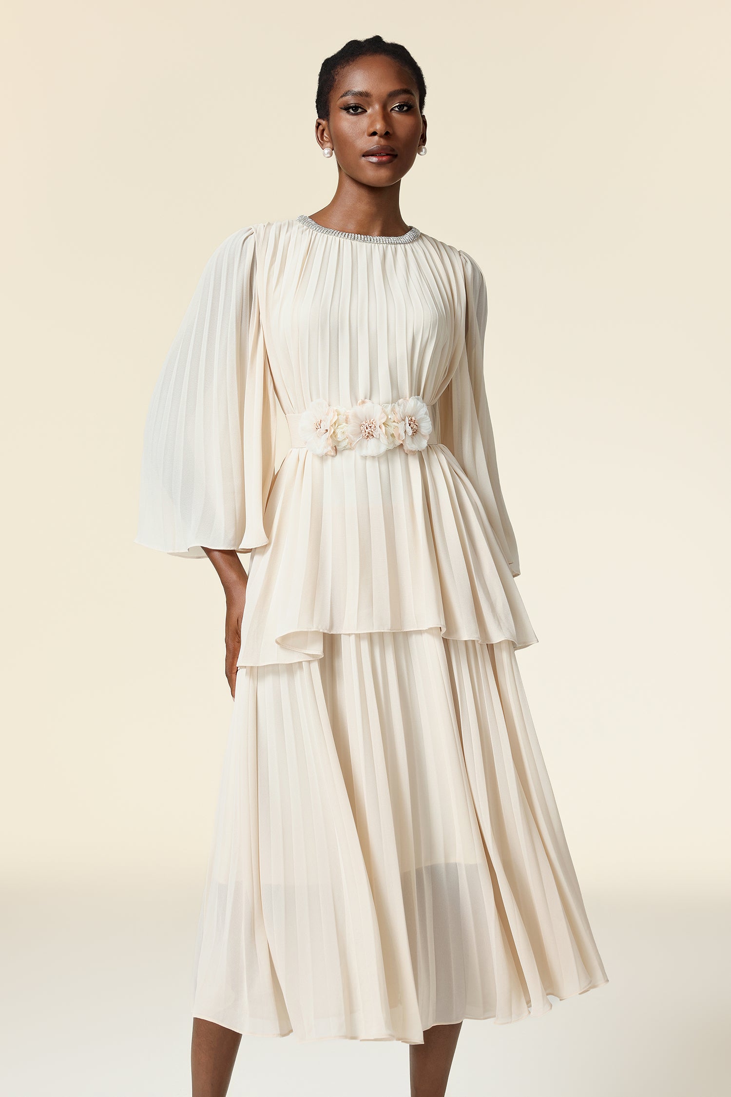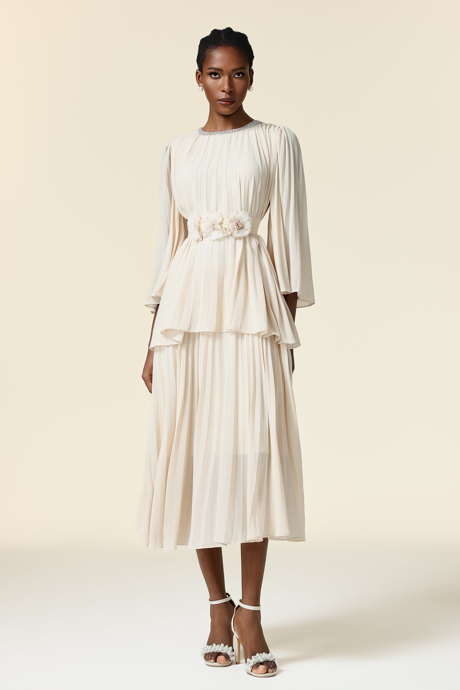 Tureal Round Neck Flowers Diamond Folds Maxi Dress