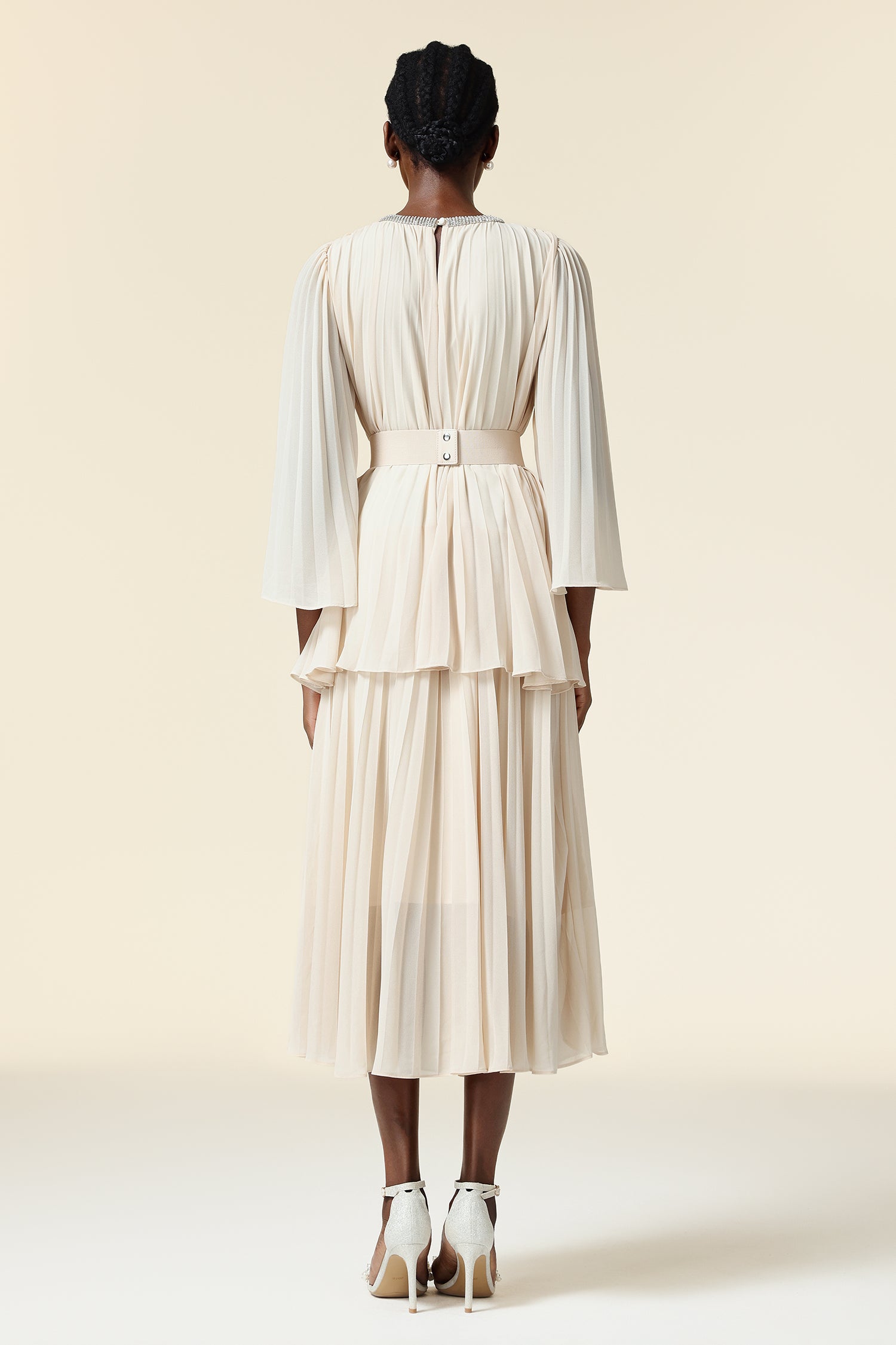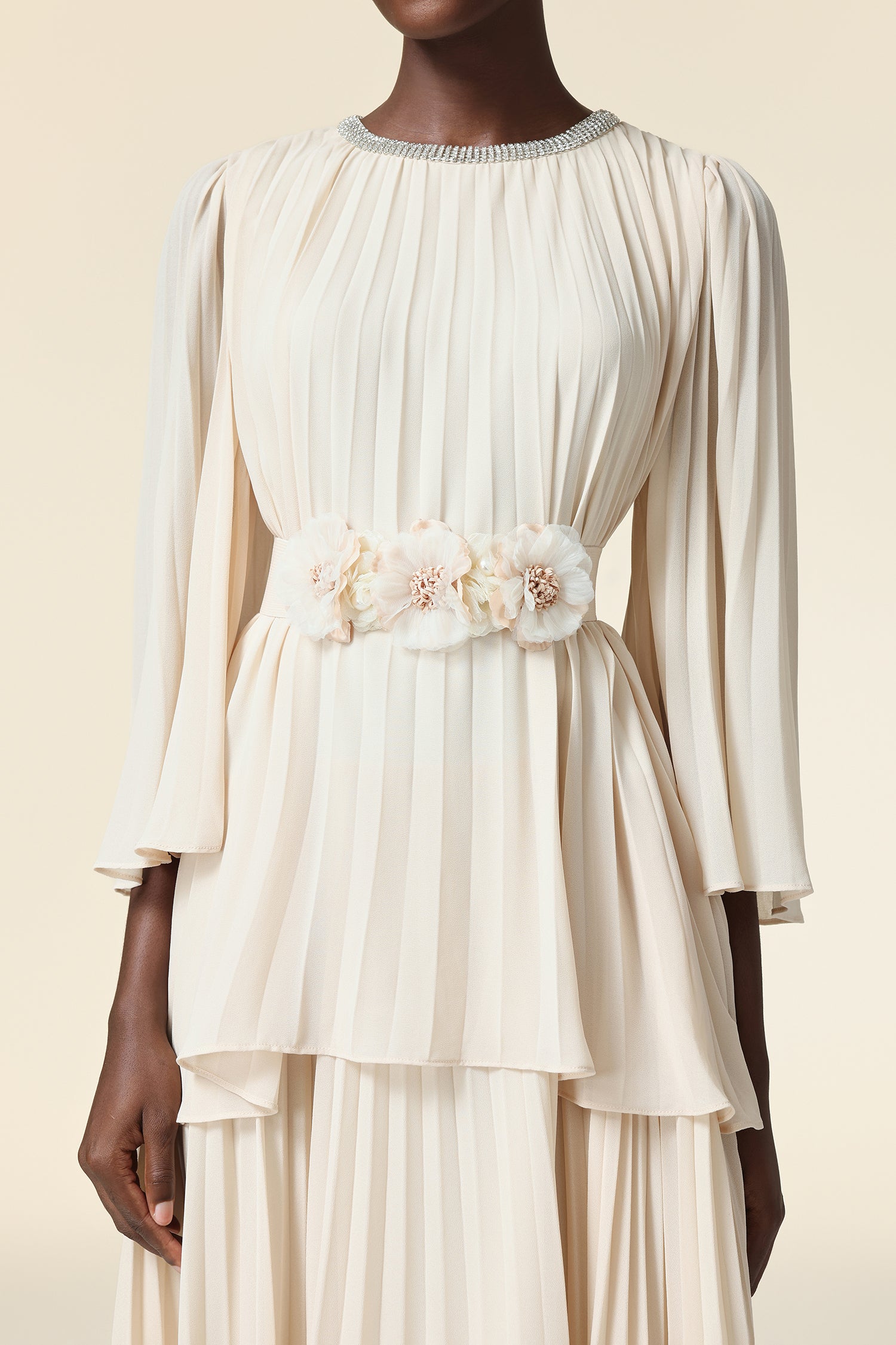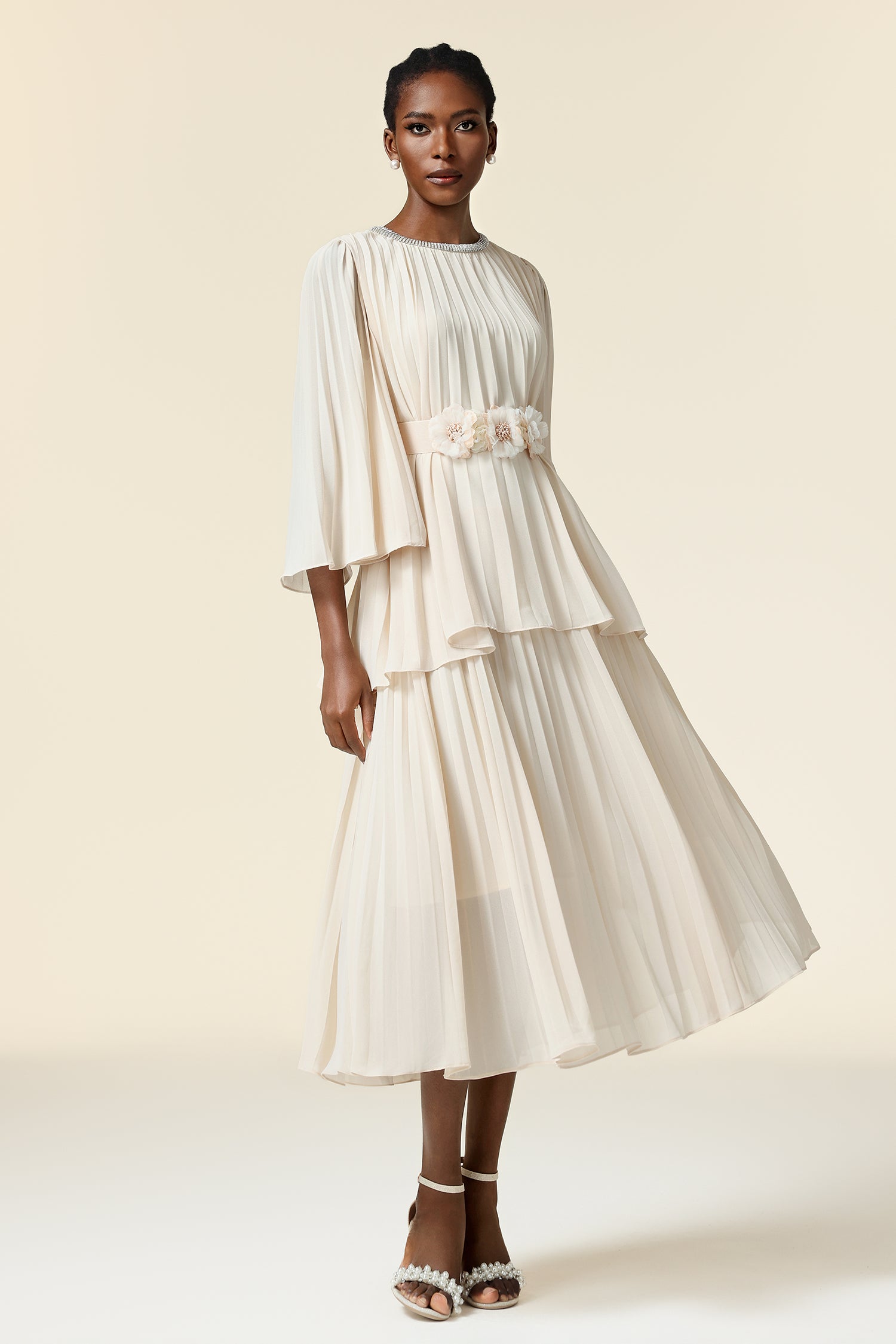 Tureal Round Neck Flowers Diamond Folds Maxi Dress