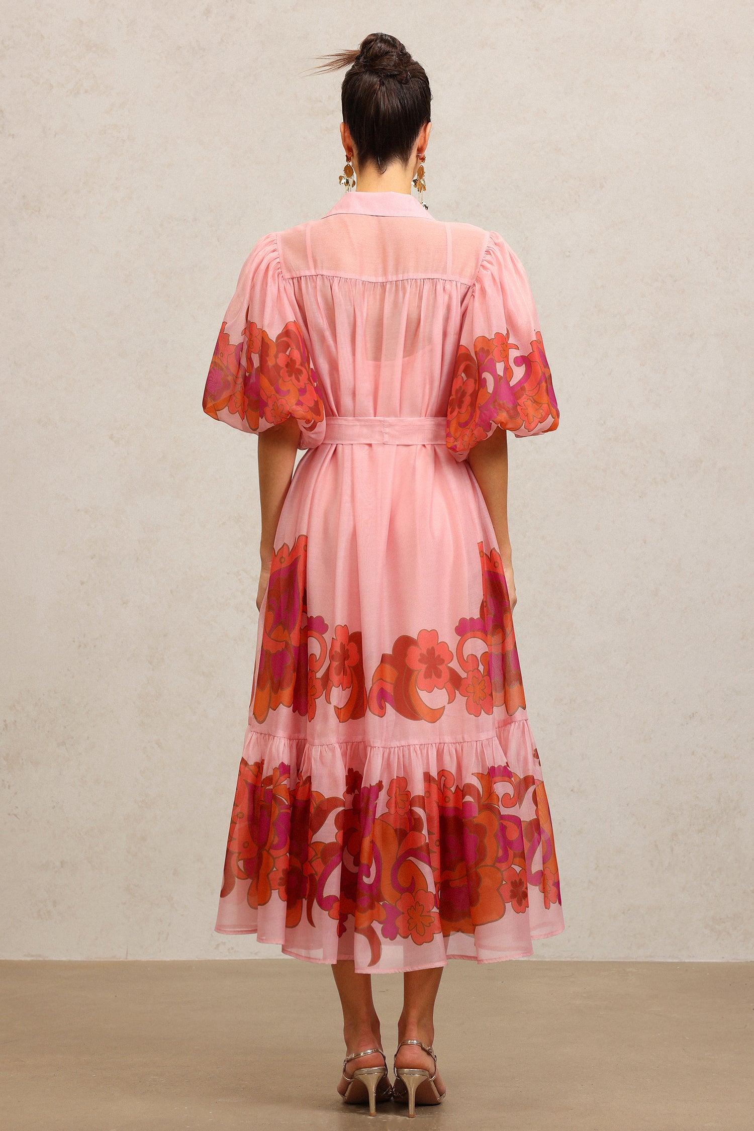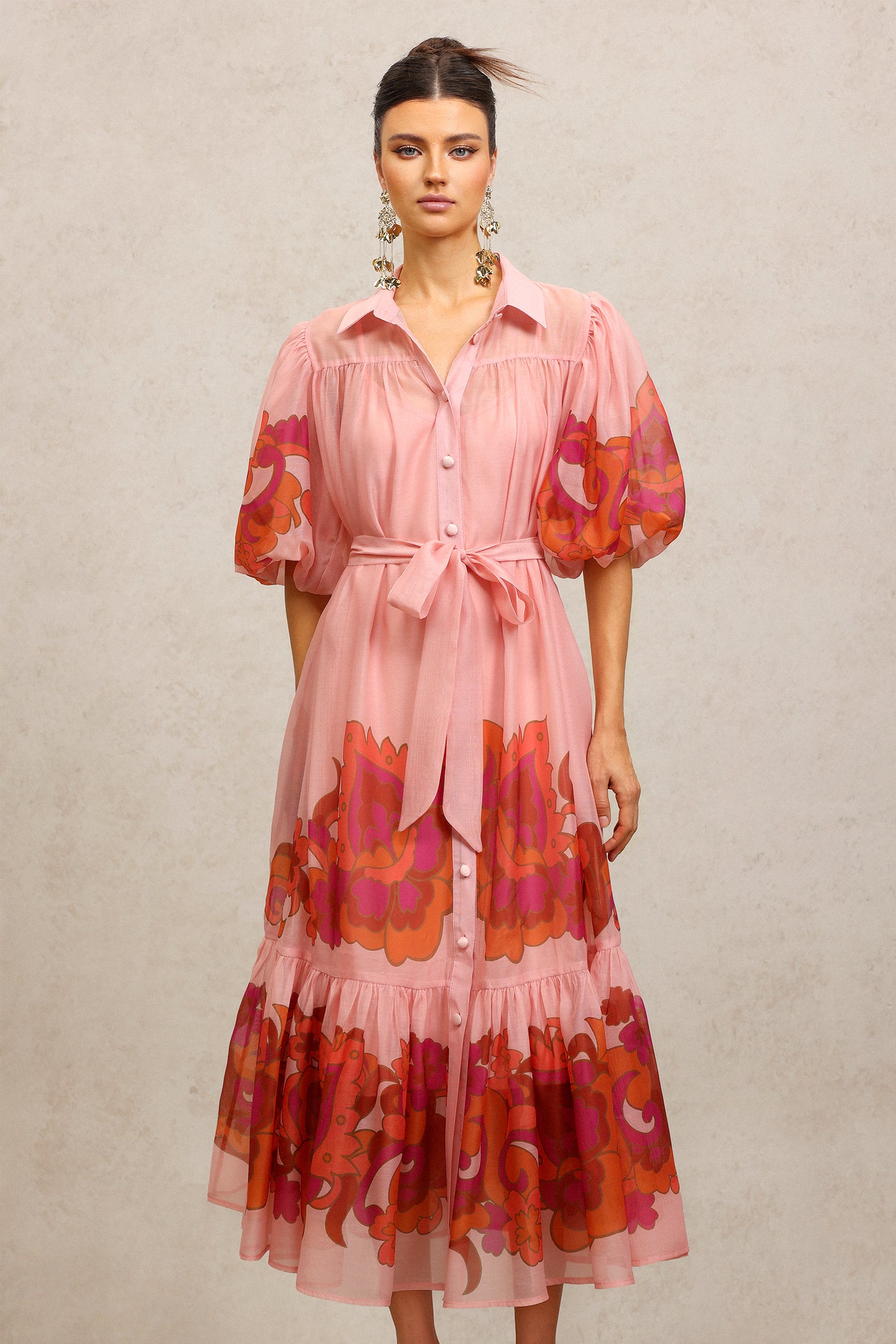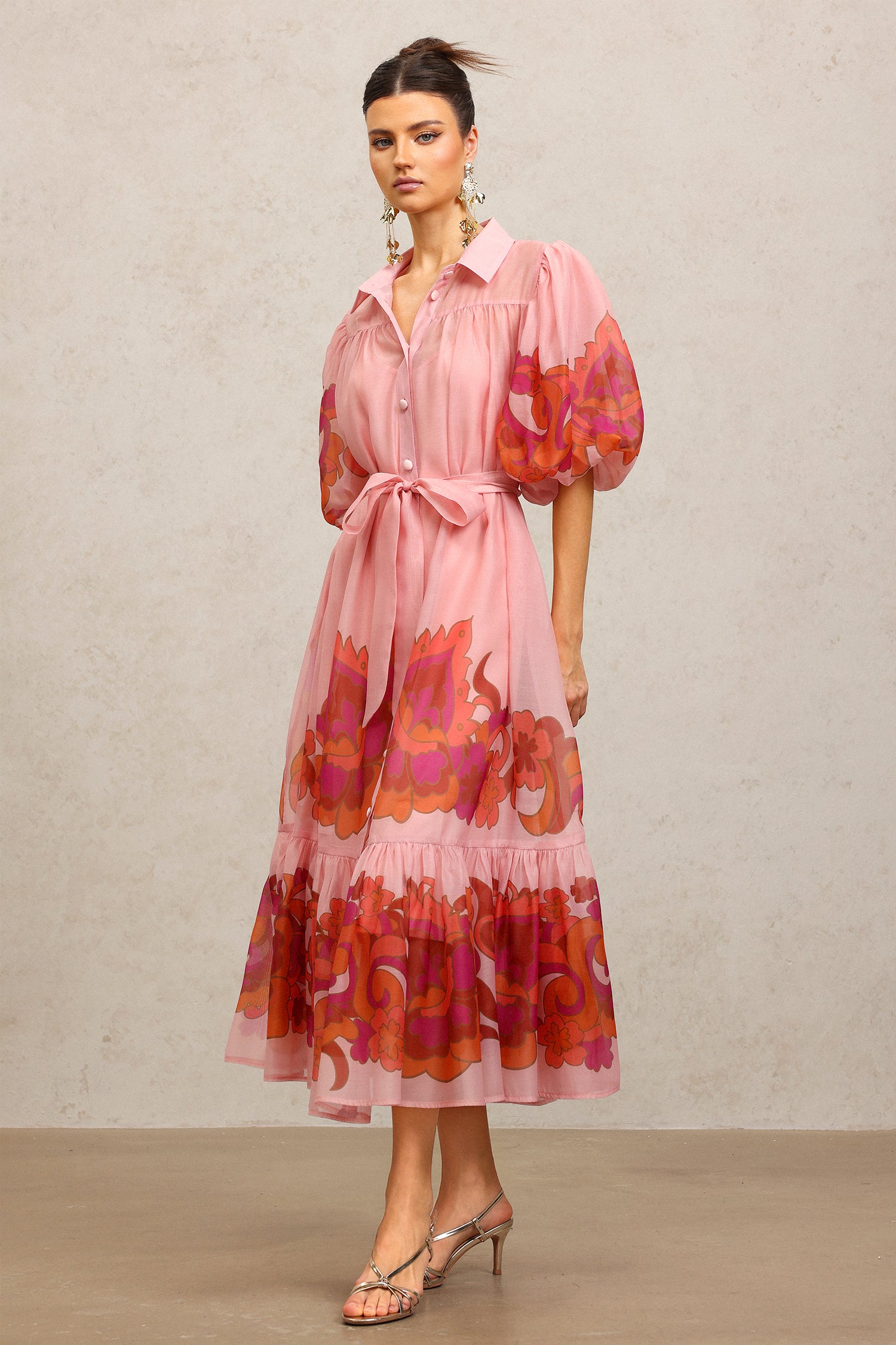 Weren Lapel Puff Sleeves Floral Printed Maxi Dress
