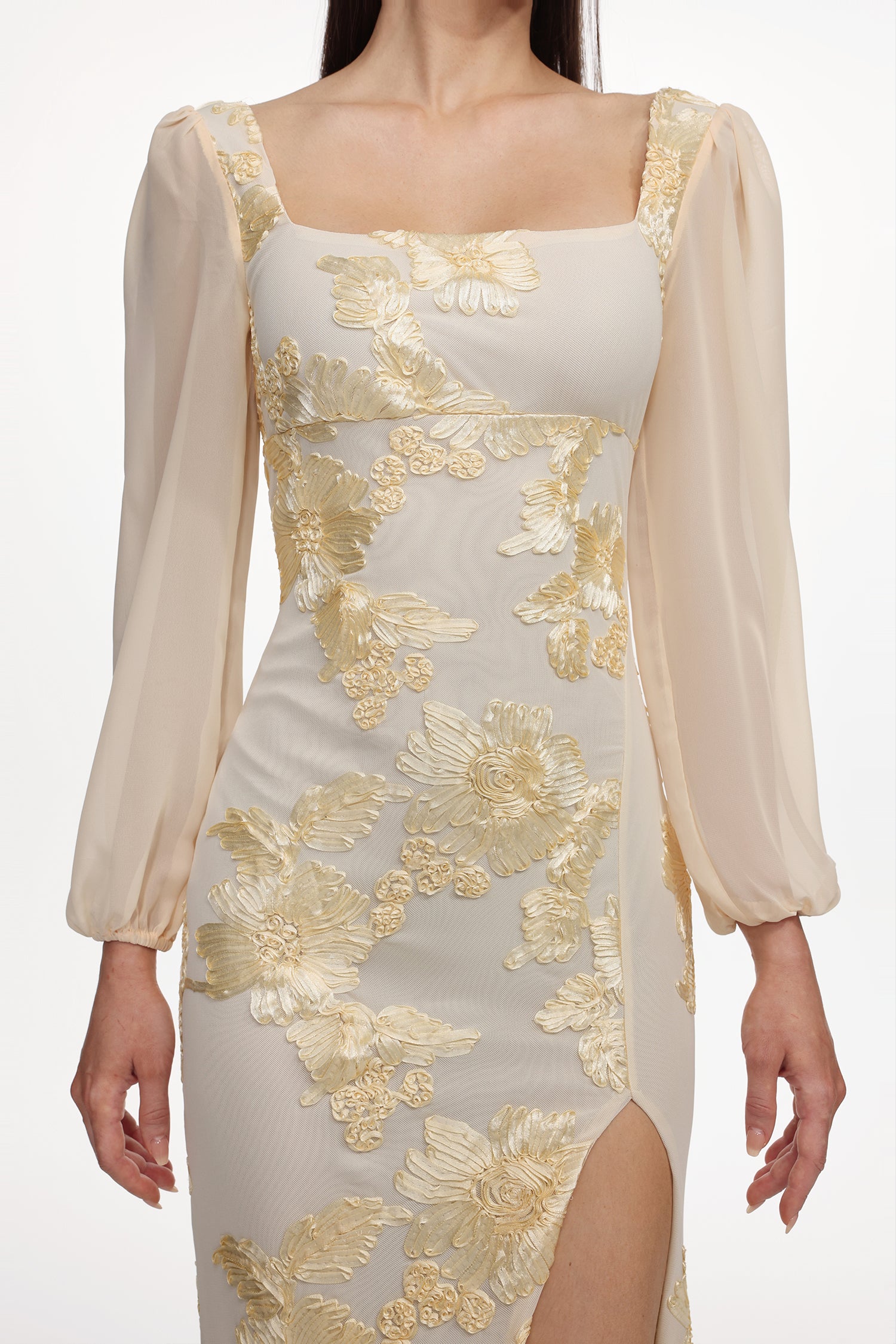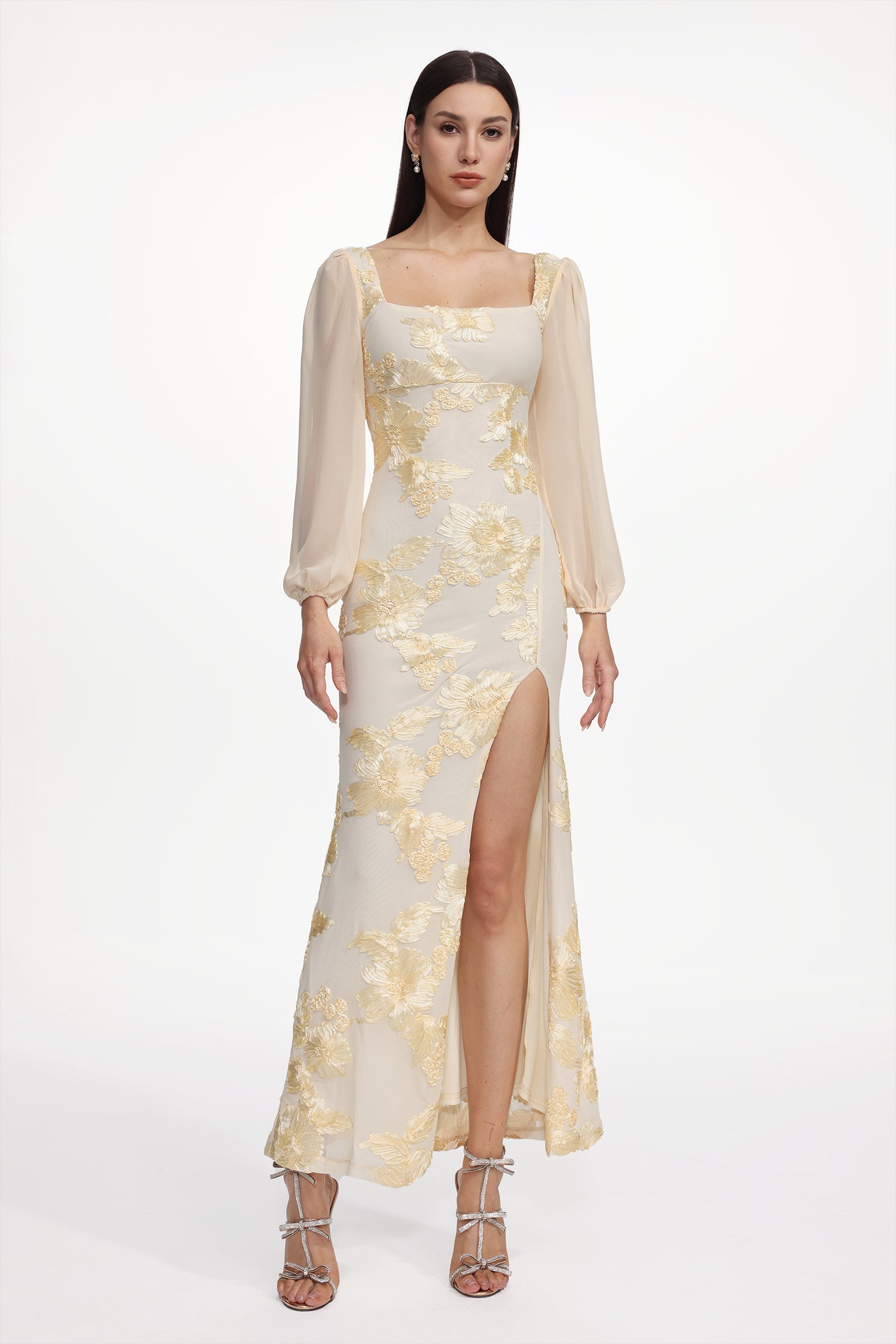 Nikki Romantic Contour Long Sleeve High Slit Floral Knit Maxi Dress