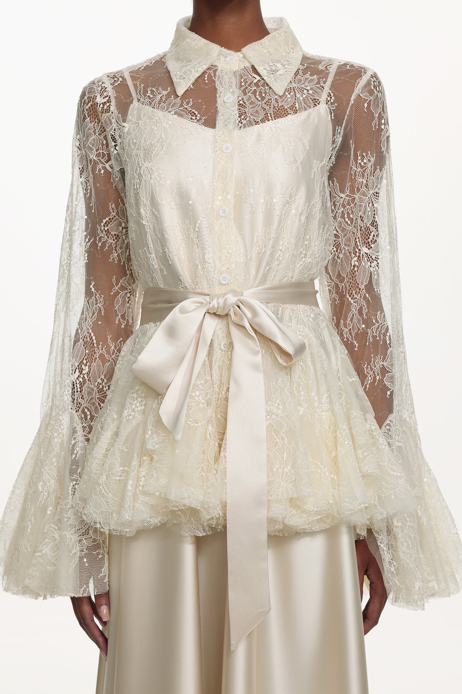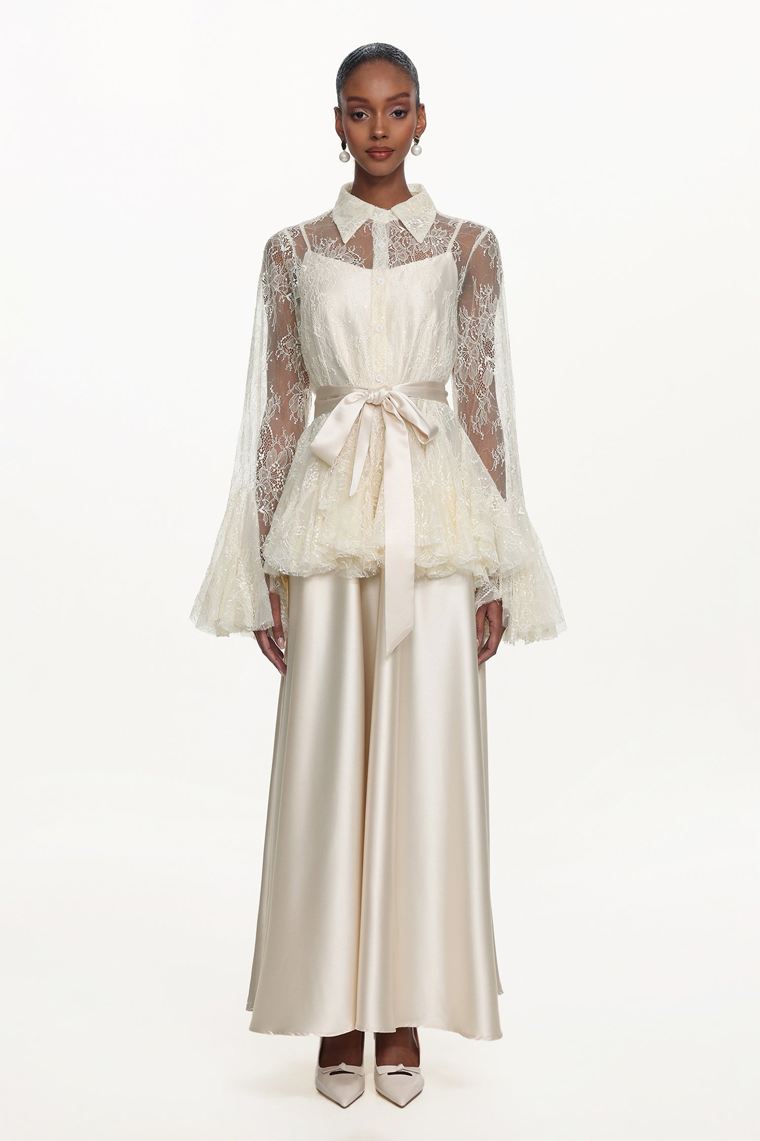 Diliy Romantic Flowy Long Sleeve Lace Shirt and Satin Dress Set