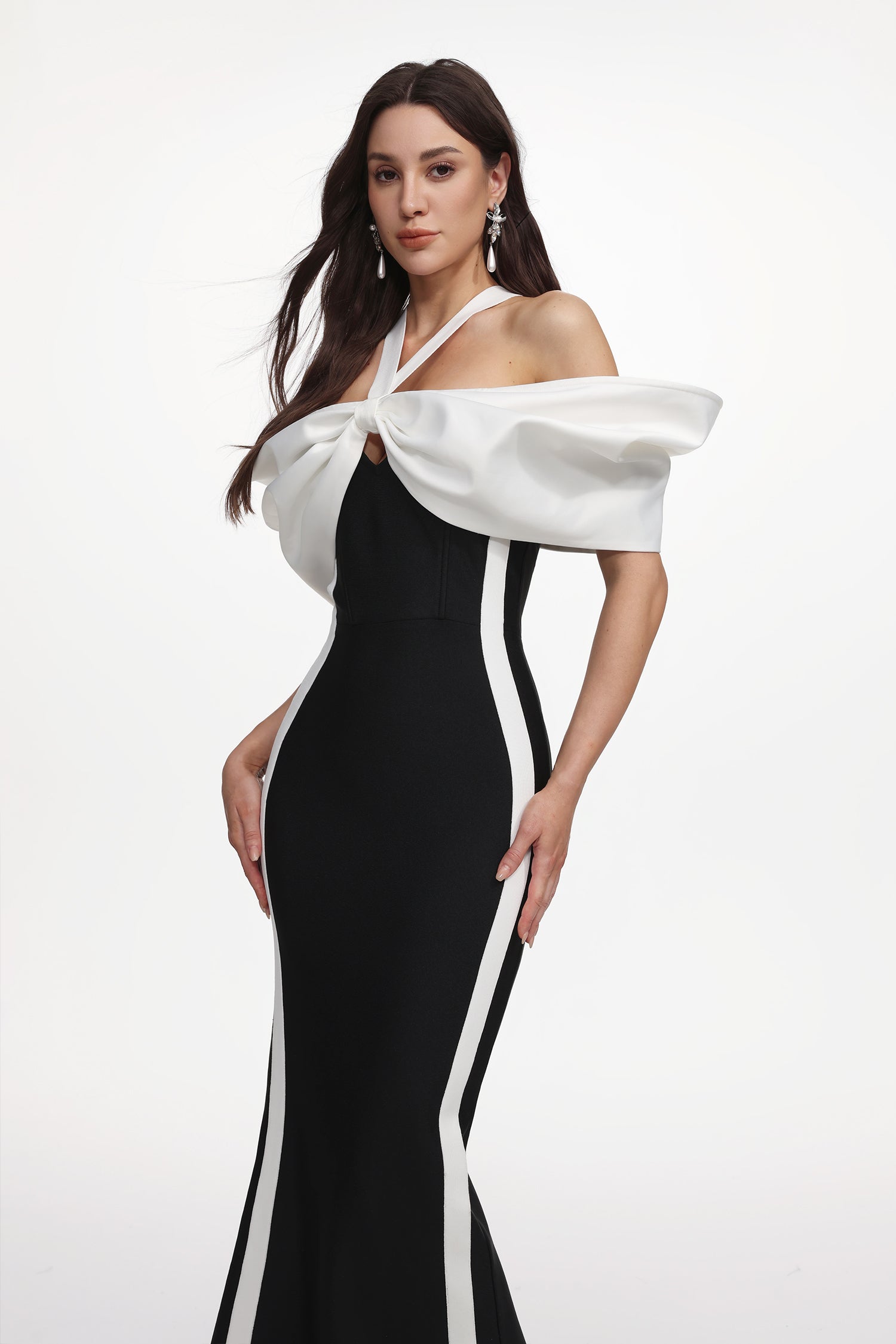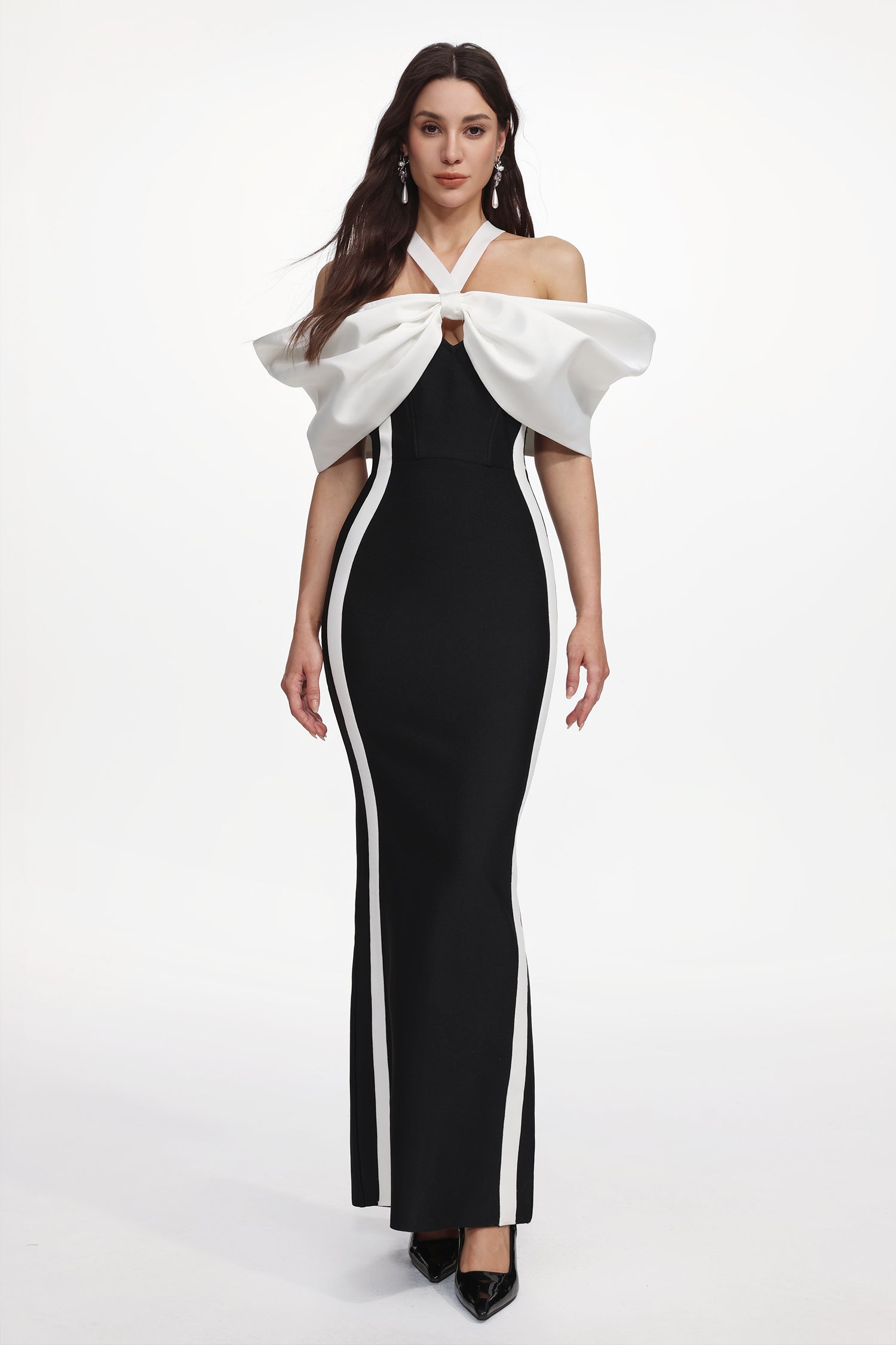 Elegant Contour Halter Bow Contrast Bandage Maxi Dress