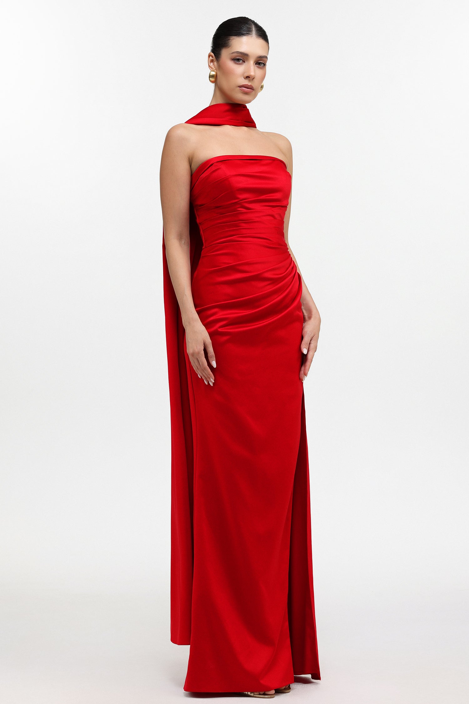Endora Glamorous Lustrous Strapless Pleated Satin Maxi Dress