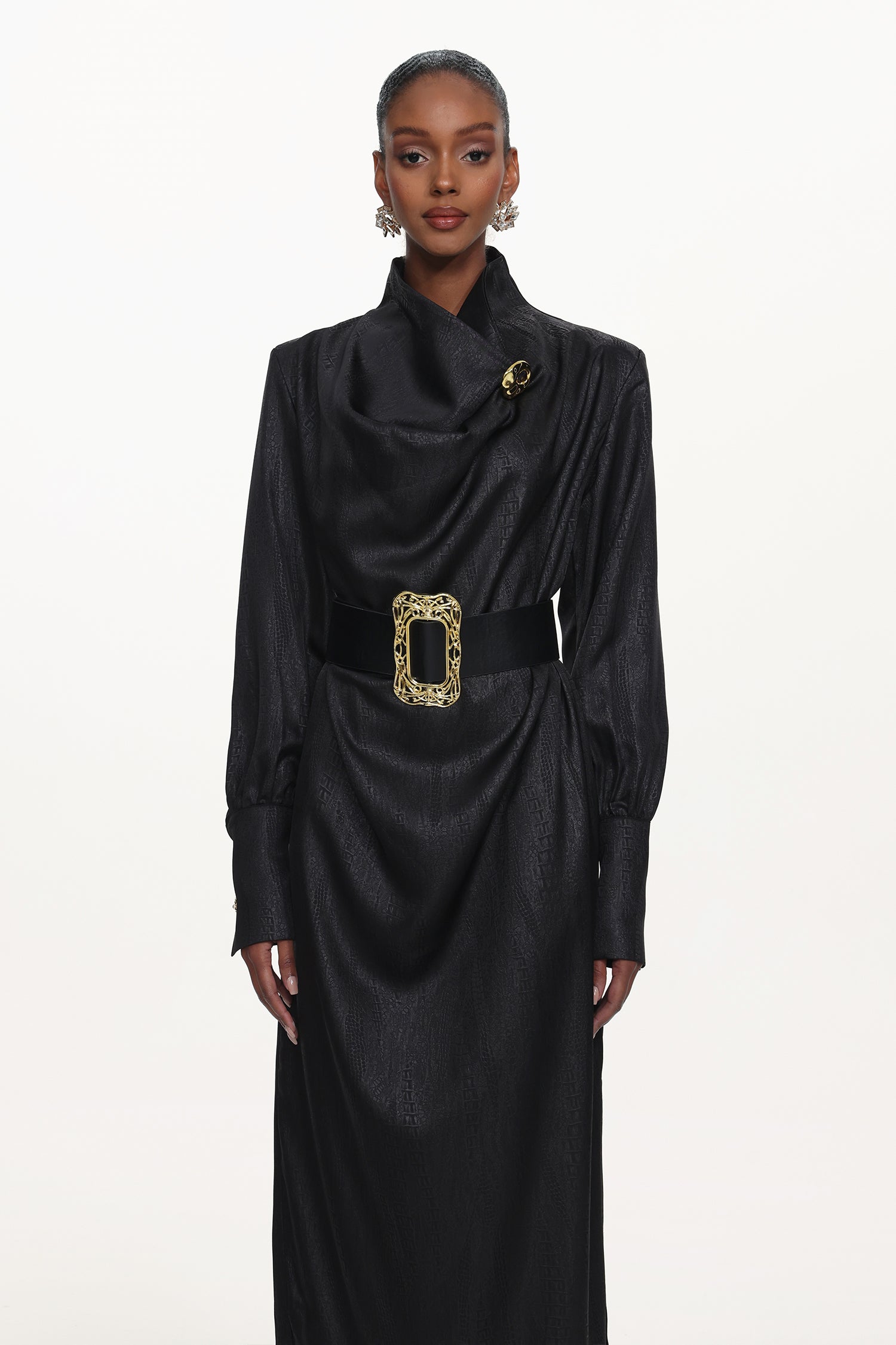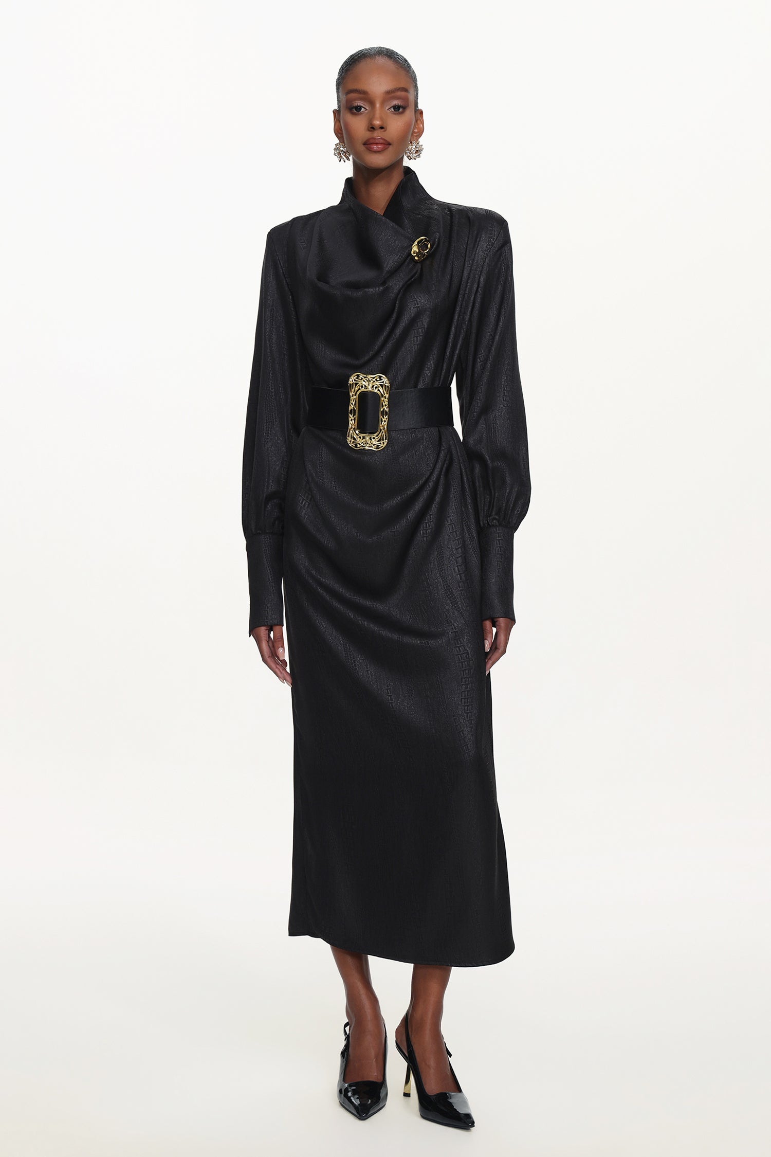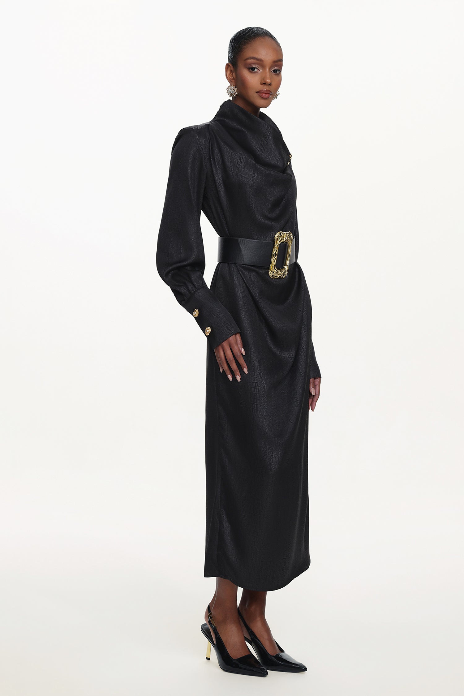 Indi Chic Contour Cowl Neck Long Sleeve Belted Maxi Dress