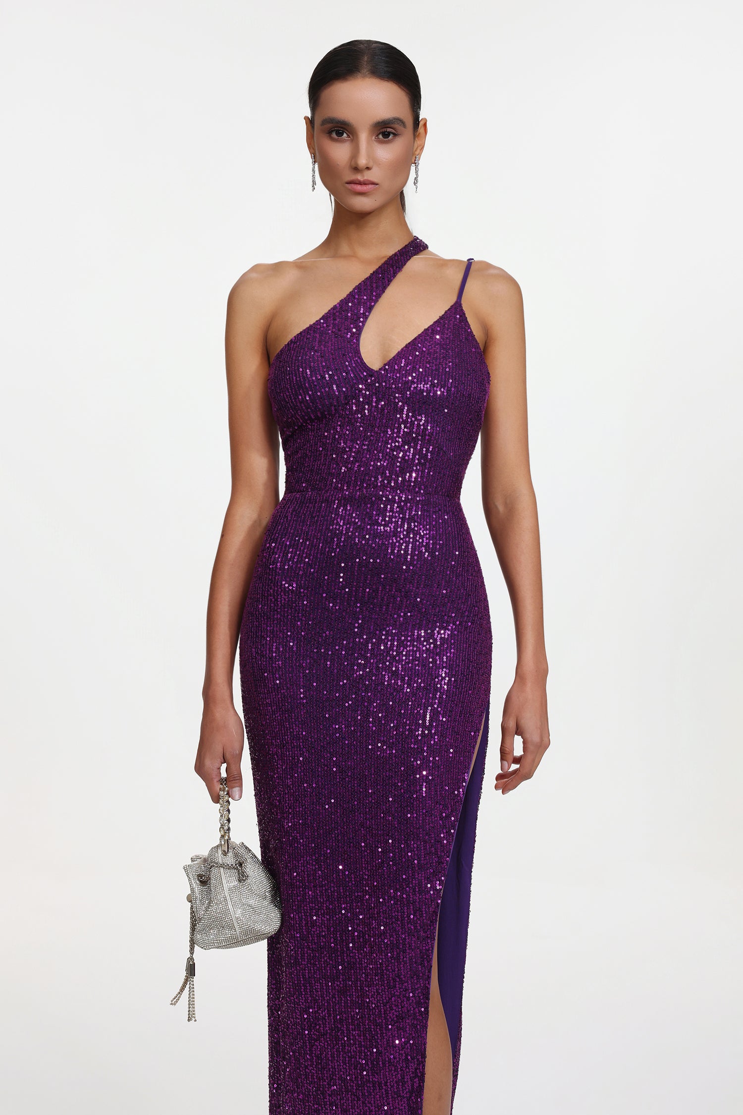 Julieta Glamorous Contour Sleeveless Asymmetric Sequin Maxi Dress