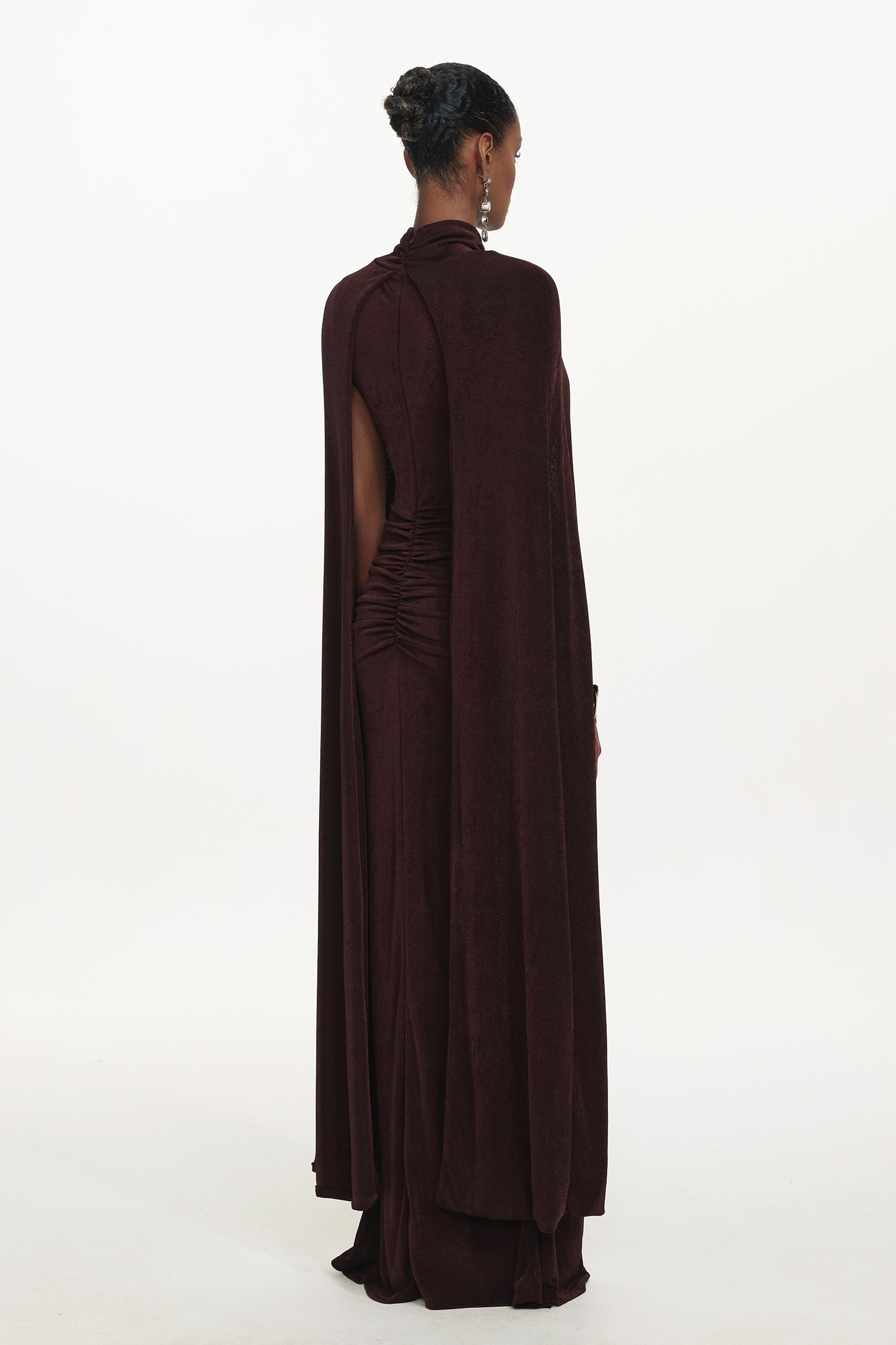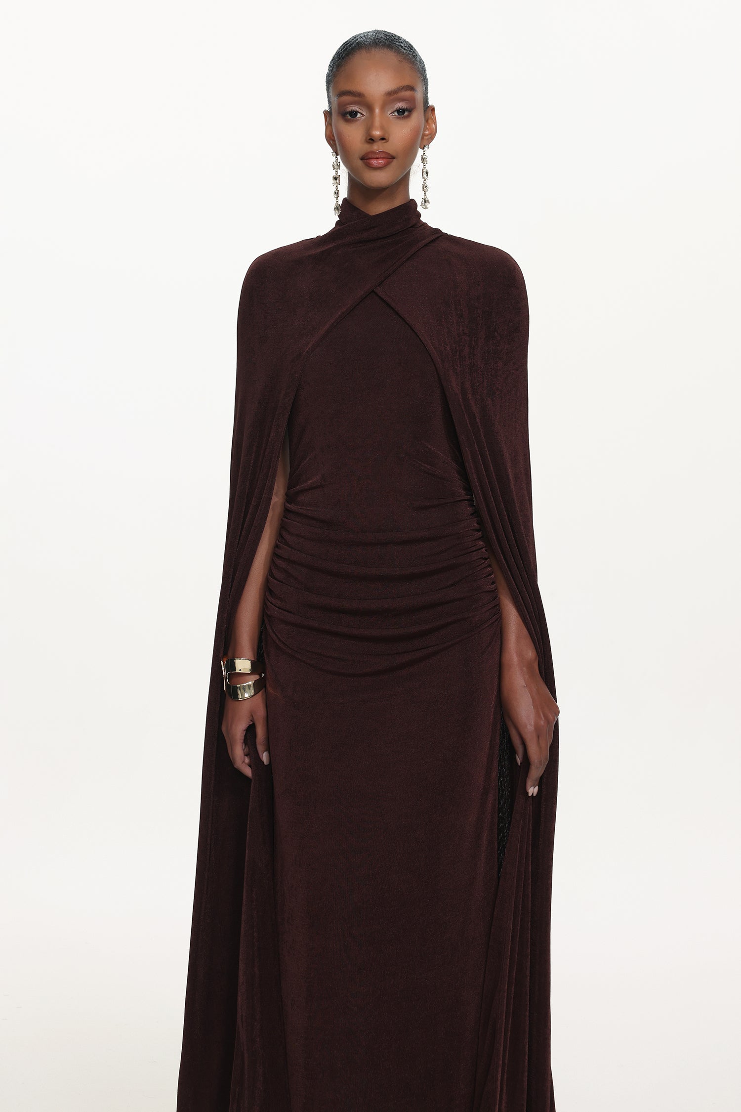 Makala Elegant Contour Drape Cape Ruched Knit Maxi Dress