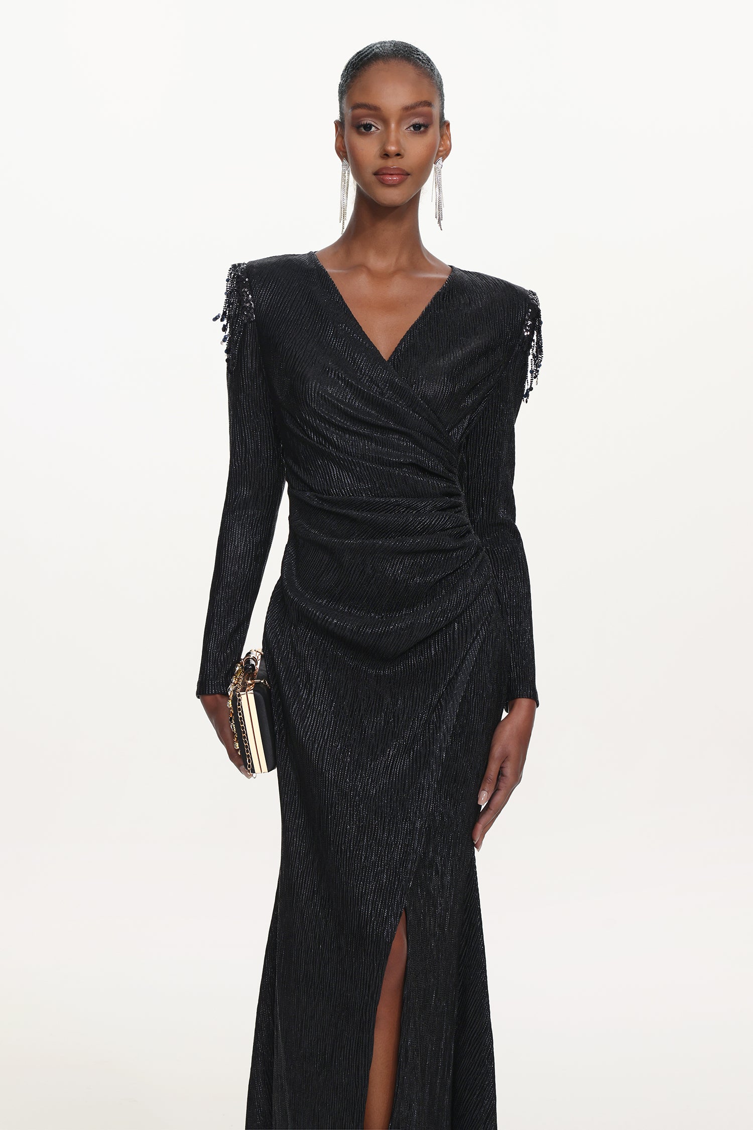 Rayna Chic Contour V Neck Long Sleeve Ruched Beaded Fringe Maxi Dress
