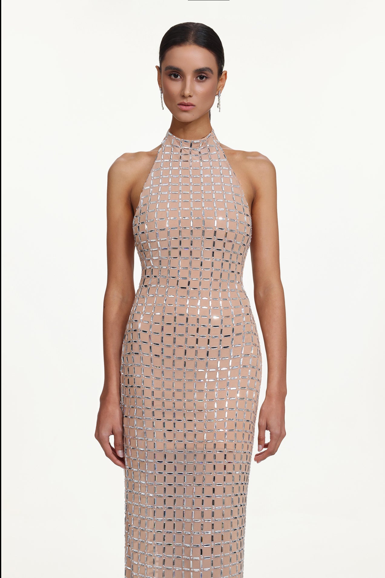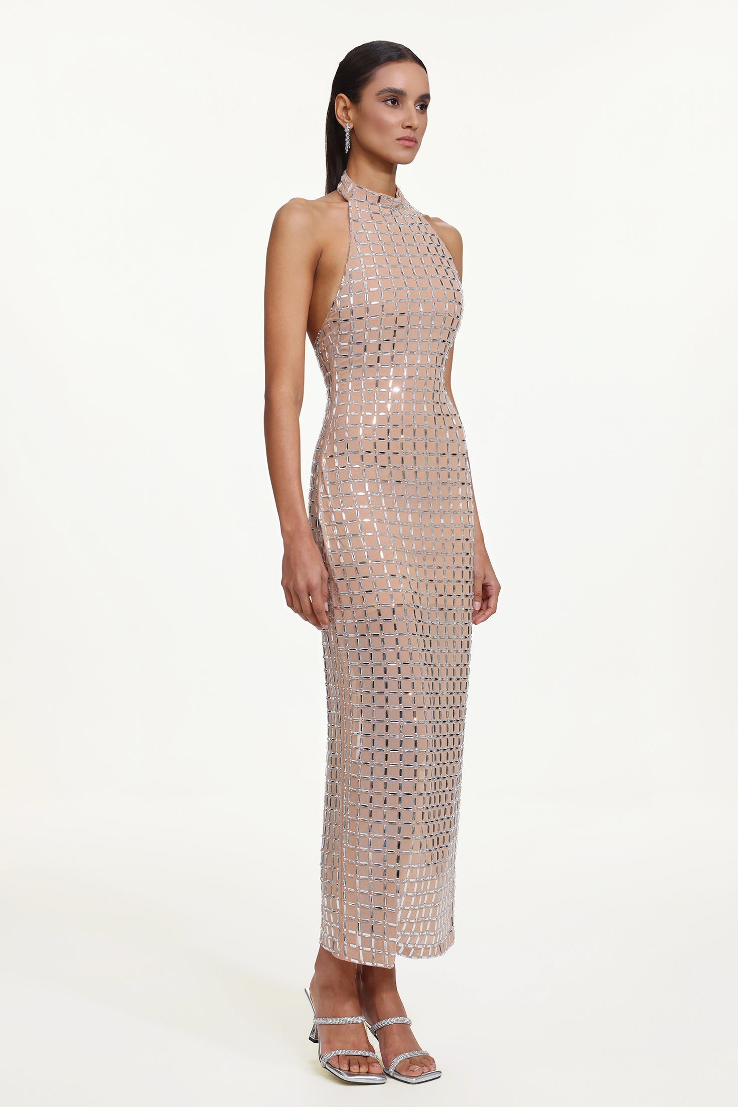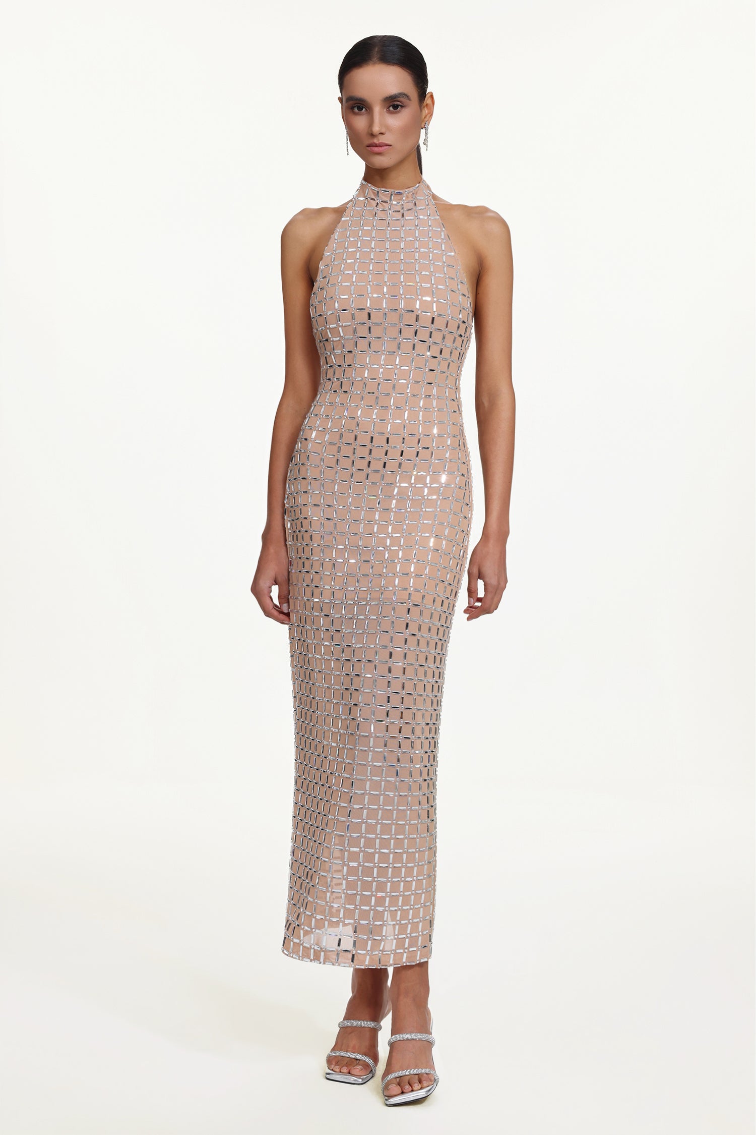 Sabryn Chic Contour Halter Sleeveless Crystal Maxi Dress