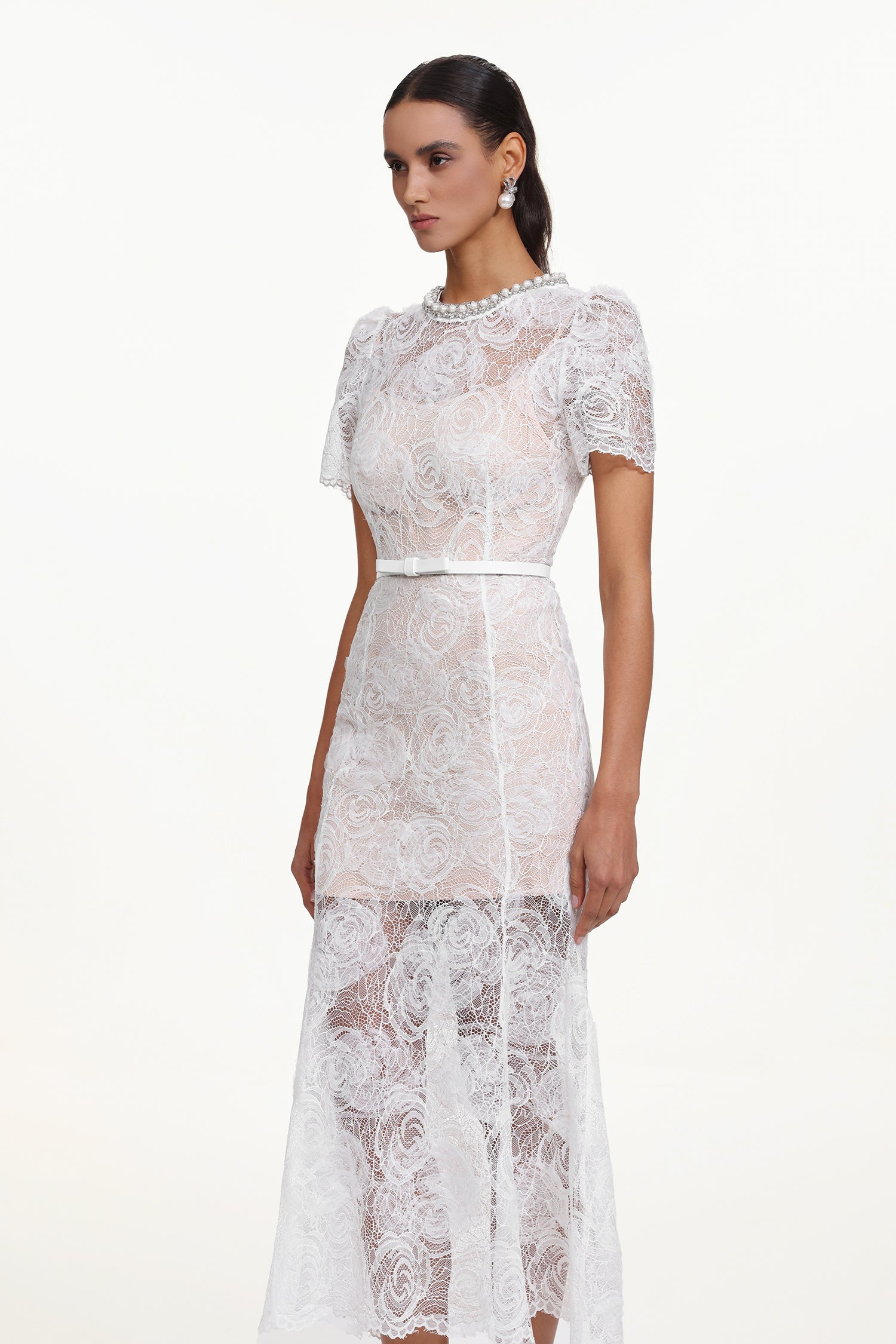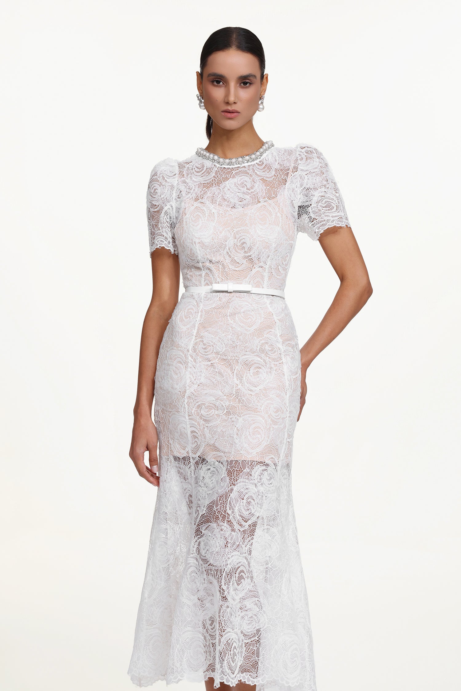 Samson Elegant Embellished Short Sleeve Pearl Lace Maxi Dress