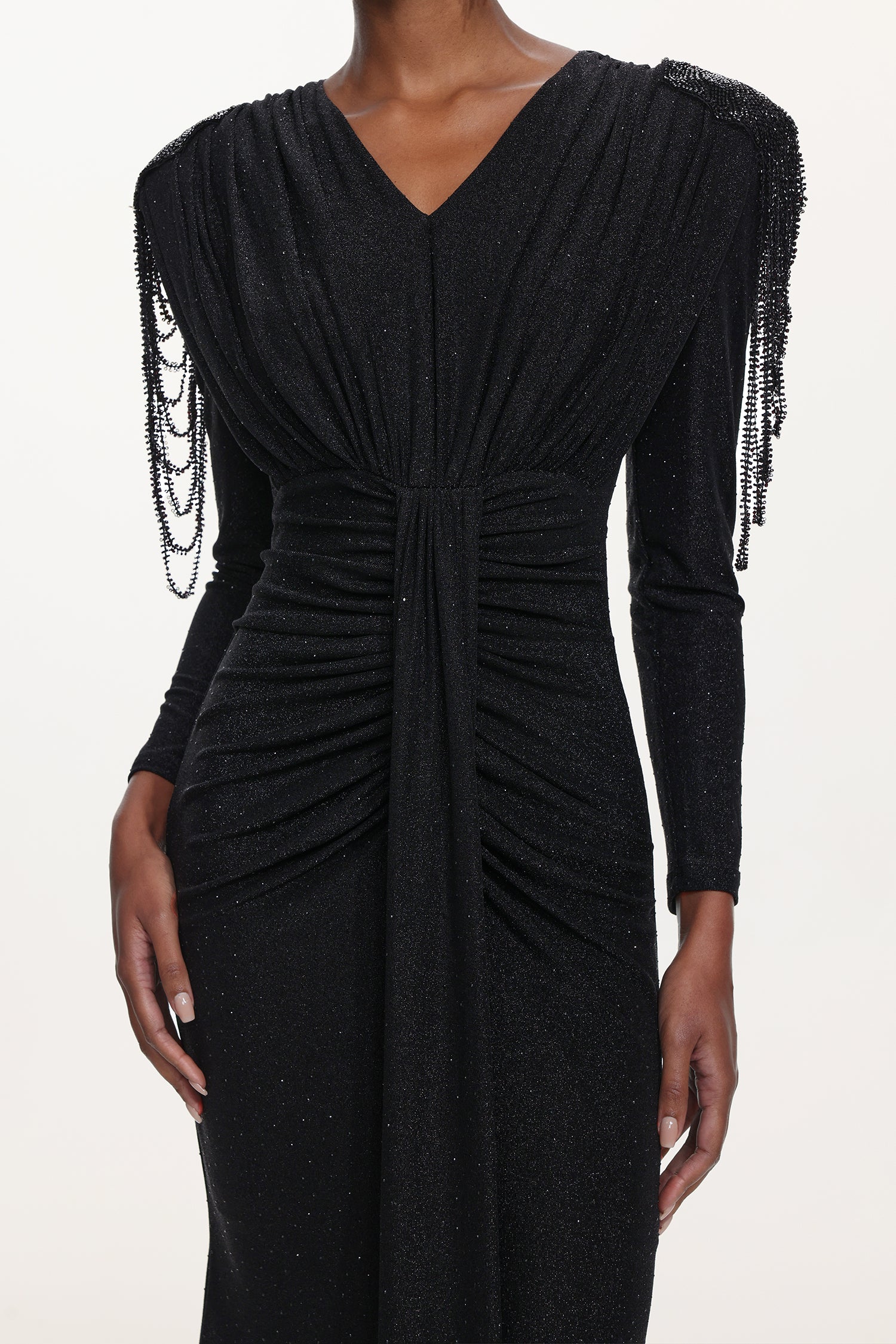 Suri Elegant Contour V Neck Long Sleeve Beaded Fringe Ruched Knit Maxi Dress