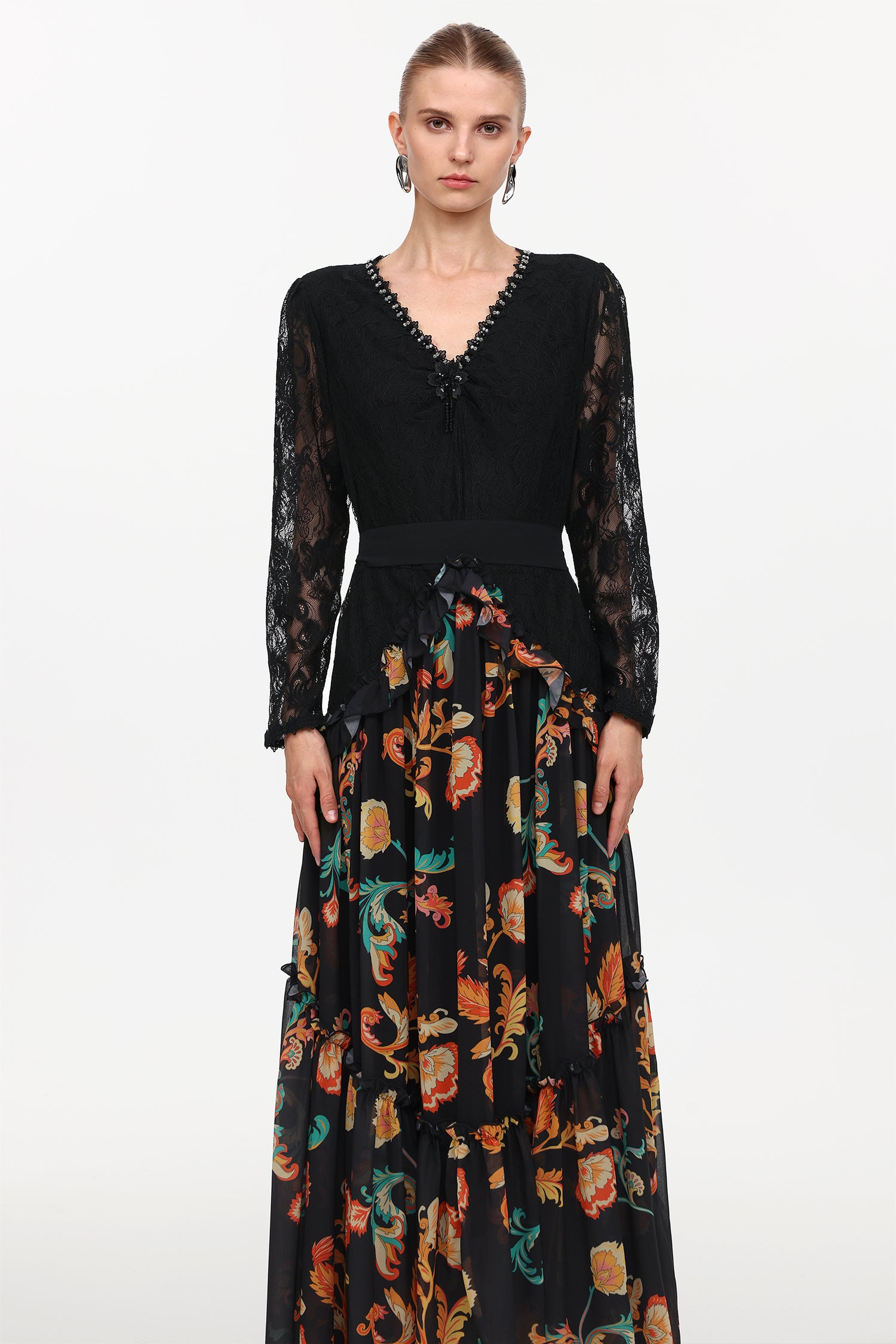 Erina Elegant Flowy Long Sleeve Lace Printed Woven Maxi Dress